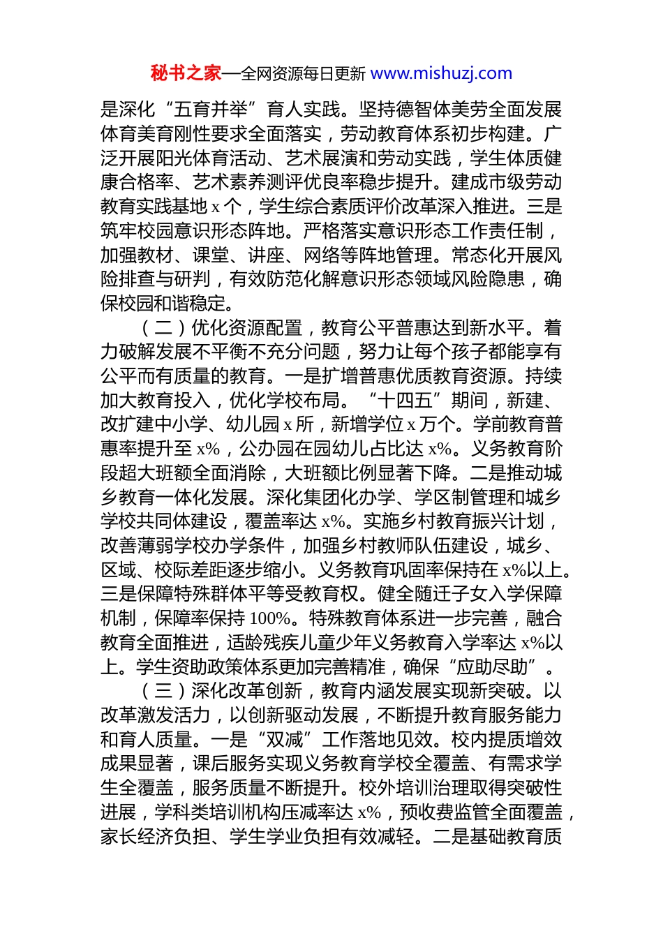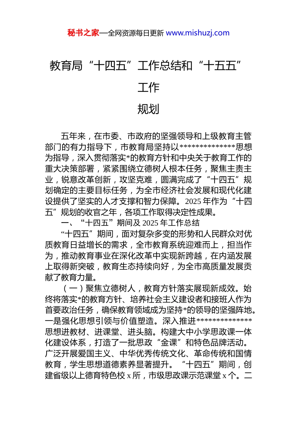 秘书之家—全网资源每日更新 www.mishuzj.com教育局“十四五”工作总结和“十五五”工作规划五年来,在市委、市政府的坚强领导和上级教育主管部门的有力指导下,市教育局坚持以**************思想为指导,深入贯彻落实*的教育方针和中央关于教育工作的重大决策部署,紧紧围绕立德树人根本任务,聚焦主责主业,锐意改革创新,攻坚克难,圆满完成了“十四五”规划确定的主要目标任务,为全市经济社会发展和现代化建设提供了坚实的人才支撑和智力保障。2025 年作为“十四五”规划的收官之年,各项工作取得决定性成果。一、“十四五”期间及 2025 年工作总结“十四五”期间,面对复杂多变的形势和人民群众对优质教育日益增长的需求,全市教育系统迎难而上,担当作为,推动教育事业在深化改革中实现新跨越,在内涵发展上取得新突破,教育生态持续向好,为全市高质量发展贡献了教育力量。(一)聚焦立德树人,教育方针落实展现新成效。始终将落实*的教育方针、培养社会主义建设者和接班人作为首要政治任务,确保教育领域成为坚持*的领导的坚强阵地。一是强化思想引领与价值塑造。深入推进**************思想进教材、进课堂、进头脑。构建大中小学思政课一体化建设体系,打造了一批思政“金课”和特色品牌活动。广泛开展爱国主义、中华优秀传统文化、革命传统和国情教育,学生思想道德素养显著提升。“十四五”期间,创建省级以上德育特色校 x 所,市级思政课示范课堂 x 个。二秘书之家—全网资源每日更新 www.mishuzj.com是深化“五育并举”育人实践。坚持德智体美劳全面发展体育美育刚性要求全面落实,劳动教育体系初步构建。广泛开展阳光体育活动、艺术展演和劳动实践,学生体质健康合格率、艺术素养测评优良率稳步提升。建成市级劳动教育实践基地 x 个,学生综合素质评价改革深入推进。三是筑牢校园意识形态阵地。严格落实意识形态工作责任制,加强教材、课堂、讲座、网络等阵地管理。常态化开展风险排查与研判,有效防范化解意识形态领域风险隐患,确保校园和谐稳定。(二)优化资源配置,教育公平普惠达到新水平。着力破解发展不平衡不充分问题,努力让每个孩子都能享有公平而有质量的教育。一是扩增普惠优质教育资源。持续加大教育投入,优化学校布局。“十四五”期间,新建、改扩建中小学、幼儿园 x 所,新增学位 x 万个。学前教育普惠率提升至 x%,公办园在园幼儿占比达 x%。义务教育阶段超大班额全面消除,大班额比例显著下降。二是推动城乡教育一体化发展。深化集团化办学、学区制管理和城乡学校共同体建设,覆盖率达 x%。实施乡村教育振兴计划,改善薄弱学校办学条件,加强乡村教师队伍建设,城乡、区域、校际差距逐步缩小。义务教育巩固率保持在 x%以上。三是保障特殊群体平等受教育权。健全随迁子女入学保障机制,保障率保持 100%。特殊教育体系进一步完善,融合教育全面推进,适龄残疾儿童少年义务教育入学率达 x%以上。学生资助政策体系更加完善精准,确保“应助尽助”。(三)深化改革创新,教育内涵发展实现新突破。以改革激发活力,以创新驱动发展,不断提升教育服务能力和育人质量。一是“双减”工作落地见效。校内提质增效成果显著,课后服务实现义务教育学校全覆盖、有需求学生全覆盖,服务质量不断提升。校外培训治理取得突破性进展,学科类培训机构压减率达 x%,预收费监管全面覆盖,家长经济负担、学生学业负担有效减轻。二是基础教育质秘书之家—全网资源每日更新 www.mishuzj.com量稳步提升。深化课程教学改革,推广优秀教学模式。加强教研支撑,完善质量监测评价体系。普通高中多样化特色发展格局初步形成。中高考改革平稳推进,学生核心素养培养得到加强。2025 年,基础教育质量监测多项指标位居全省前列。三是职业教育适应性增强。紧密对接区域产业发展需求,优化专业设置。深化产教融合、校企合作,共建产业学院、实训基地 x 个。推进“双师型”教师队伍建设,技能人才培养质量显著提高,毕业生就业率保持在 x%以上。四是智慧教育赋能增效。教育信息化基础设施持续升级,中小学(含教学点)宽带网络接入率、多媒体教室覆盖率均...