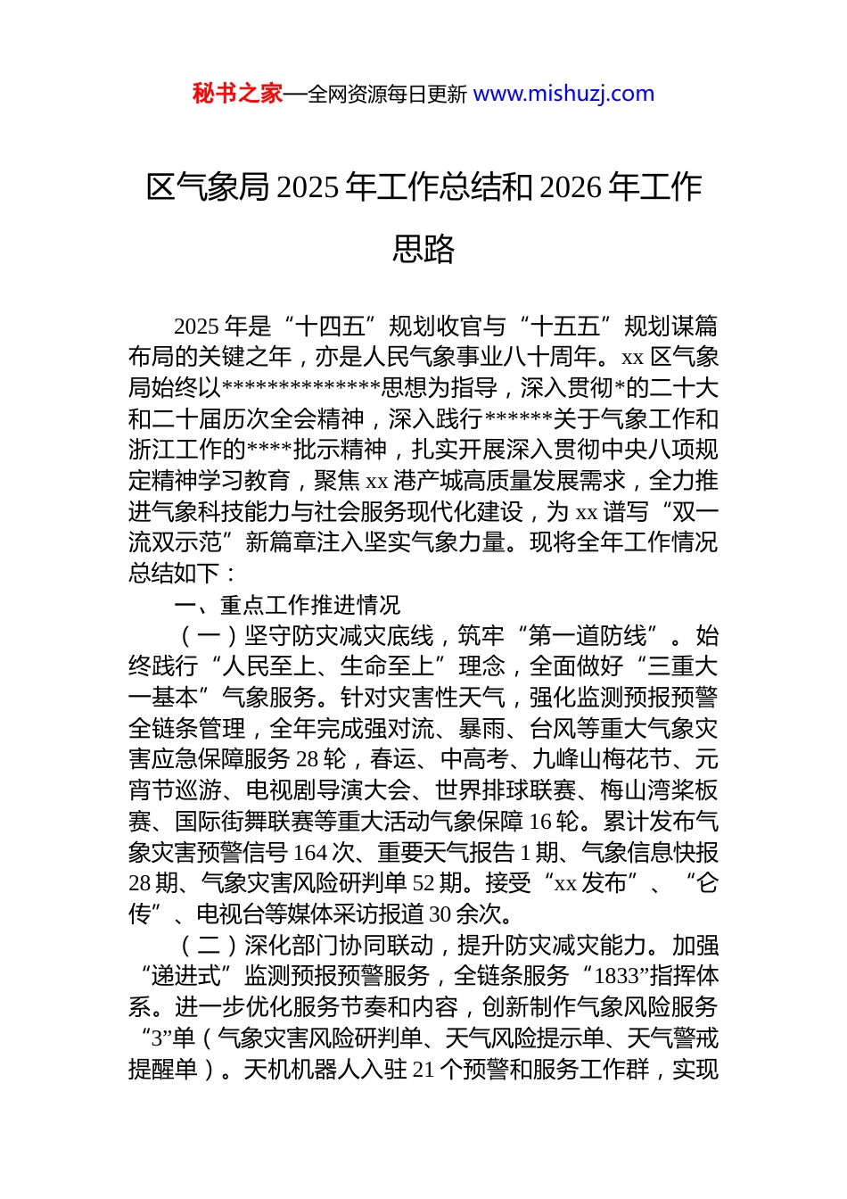 秘书之家—全网资源每日更新 www.mishuzj.com区气象局 2025 年工作总结和 2026 年工作思路2025 年是“十四五”规划收官与“十五五”规划谋篇布局的关键之年,亦是人民气象事业八十周年。xx 区气象局始终以**************思想为指导,深入贯彻*的二十大和二十届历次全会精神,深入践行******关于气象工作和浙江工作的****批示精神,扎实开展深入贯彻中央八项规定精神学习教育,聚焦 xx 港产城高质量发展需求,全力推进气象科技能力与社会服务现代化建设,为 xx 谱写“双一流双示范”新篇章注入坚实气象力量。现将全年工作情况总结如下:一、重点工作推进情况(一)坚守防灾减灾底线,筑牢“第一道防线”。始终践行“人民至上、生命至上”理念,全面做好“三重大一基本”气象服务。针对灾害性天气,强化监测预报预警全链条管理,全年完成强对流、暴雨、台风等重大气象灾害应急保障服务 28 轮,春运、中高考、九峰山梅花节、元宵节巡游、电视剧导演大会、世界排球联赛、梅山湾桨板赛、国际街舞联赛等重大活动气象保障 16 轮。累计发布气象灾害预警信号 164 次、重要天气报告 1 期、气象信息快报28 期、气象灾害风险研判单 52 期。接受“xx 发布”、“仑传”、电视台等媒体采访报道 30 余次。(二)深化部门协同联动,提升防灾减灾能力。加强“递进式”监测预报预警服务,全链条服务“1833”指挥体系。进一步优化服务节奏和内容,创新制作气象风险服务“3”单(气象灾害风险研判单、天气风险提示单、天气警戒提醒单)。天机机器人入驻 21 个预警和服务工作群,实现秘书之家—全网资源每日更新 www.mishuzj.com全天候叫应叫醒与行业专项服务。与应急、资规联合发布地质灾害气象风险提醒 5 次,与应急局开展森林防火专题会商 3 次,参加 xx 区自然灾害综合应急救援演练 1 次,利用燃气空气炮设备与生态环境局联合开展大气污染防御应急处置 4 次;聚焦疏港高速安全,与高速交警、公路运输、高速营运等单位召开联席会议 3 次,完成 2 套集成式交通气象监测系统安装建设,开展应急联动管控 18 轮次,推动 xx 穿山疏港高速列入省级恶劣天气影响应对提升路段,交通气象服务能力显著增强。(三)推进重点项目建设,夯实气象发展根基。全年完成多项关键项目建设,为气象现代化赋能。完成“天机网”工程,建设 173 套气象区域自动站,实现村社气象监测全覆盖,站网密度已达 1.4 公里,监测数据接入“xx 区多灾种风险预警系统”并在汛期高效运行;完成 x 波段相控阵雷达和风廓线雷达最终验收;国家基本站提升工程(一期)完成初步设计会审,列入 2026 年新开工项目。依托“xx 区多灾种风险预警系统”,持续提供强力行业和决策支撑,有效开展气象(次生)灾害分行业、分灾种、分阈值精细化气象风险预警。xx 区气象赋能港产城高质量发展全省先行试点任务全面完成并通过省局验收。(四)创新农业气象服务,助力乡村产业发展。针对水稻种植无人机作业、本地特色葡萄等设施作物气象服务需求,联合农业局开展调研走访 3 次,发布农业专题服务18 期。联合区农业技术推广中心进行服务调研和技术指导,助力 xx 侃宝果木合作社在“2025 好西瓜”推选中斩获省级银奖及市级一金两银佳绩,科技赋能顶流葡萄提前一个月上市,“数智气象”帮助传统农业焕发活力。“乡村振兴”气象保障服务,联合柴桥街道、芦源社区开展智慧花田气象课,进行夏季高温花木种植技术指导。联合保险公司成功为春晓、柴桥、白峰街道的茶叶种植大户实施直通式快速理赔 1338 亩价值 20.6 万元,成功落地 4 笔价值 xx 万秘书之家—全网资源每日更新 www.mishuzj.com元的“气候贷”。(五)优化行政审批服务,强化气象安全监管。全面落实“浙里防雷安全”风险码应用,重点单位一企一档建档常态更新。强化检测机构“浙里防雷安全”微信小程序应用,所有重点单位单体检测全覆盖,实现防雷检测扫码率 100%,检测可溯源 100%。真正做到责任可追溯,规范防雷检测弄虚作假行为发生,切实保障易燃易爆场所的防雷安全。联合公安、交通和市监等部门开展跨部门双随机执法检...