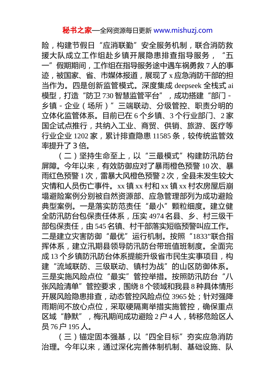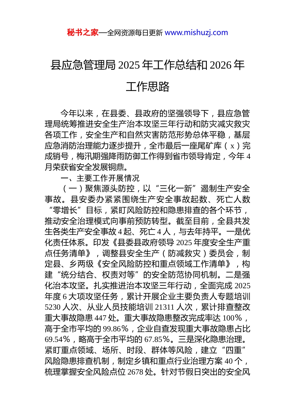 秘书之家—全网资源每日更新 www.mishuzj.com县应急管理局 2025 年工作总结和 2026 年工作思路今年以来,在县委、县政府的坚强领导下,县应急管理局统筹推进安全生产治本攻坚三年行动和防灾减灾救灾各项工作,安全生产和自然灾害防范形势总体平稳,基层应急消防治理能力逐步提升,全市最后一座尾矿库(x)完成销号,梅汛期强降雨防御工作得到省市领导肯定,今年 4月荣获省安全发展铜鼎。一、主要工作开展情况(一)聚焦源头防控,以“三化一新”遏制生产安全事故。县安委办紧紧围绕生产安全事故起数、死亡人数“零增长”目标,紧盯风险防控和隐患排查的各个环节,推动安全治理模式向事前预防转型。截至目前,全县共发生各类生产安全事故 4 起、死亡 4 人,与去年持平。一是优化责任体系。印发《县委县政府领导 2025 年度安全生产重点任务清单》,调整县安全生产(防减救灾)委员会,制定县、乡两级《安全风险防控和重点领域工作清单》,构建“统分结合、权责对等”的安全防范协同机制。二是强化治本攻坚。扎实推进治本攻坚三年行动,全面完成 2025年度 6 大项攻坚任务,累计开展企业主要负责人专题培训5230 人次、从业人员技能培训 21311 人次,累计排查整改重大事故隐患 447 处。重大事故隐患整改完成率达 100%,高于全市平均的 99.86%,企业自查发现重大事故隐患占比69.54%,略高于全市平均的 67.85%。三是深化隐患治理。紧盯重点领域、场所、时段、群体等风险,建立“四重”风险隐患排查机制,制定乡镇和重点行业治理方案 40 个,梳理掌握安全风险点位 2678 处。针对节假日突出的安全风秘书之家—全网资源每日更新 www.mishuzj.com险,构建节假日“应消联勤”安全服务机制,联合消防救援大队成立工作组赴乡镇开展隐患排查指导服务,“五一”假期期间,工作组在指导服务途中遇车祸勇救 7 人的事迹,被国家、省、市媒体报道,展现了 x 应急消防干部的担当作为。四是创新监管模式。深度集成 deepseek 全栈式 ai模型,打造“防卫 730 智慧监管平台”,成功搭建“部门-乡镇-企业(场所)”三端联动、分级管控、职责分明的立体化监管体系。目前已在 6 个乡镇、3 个行业部门、2 家国企试点推行,共纳入工业、商贸、供销、旅游、医疗等行业企业 1202 家,累计排查隐患 11585 条,较传统监管效率提升了 3 倍。(二)坚持生命至上,以“三最模式”构建防汛防台屏障。今年以来,有效防御应对了暴雨橙色预警 10 次、暴雨红色预警 1 次,雷暴大风橙色预警 2 次,全县未发生较大灾情和人员伤亡事件。xx 镇 xx 村和 xx 镇 xx 村农房屋后崩塌避险案例分别被自然资源部、应急管理部列为成功避险典型案例。一是落实防范责任“最小”颗粒细度。建立健全防汛防台包保责任体系,压实 4974 名县、乡、村三级干部包保责任,由 545 名镇、村干部落实短临预警叫应工作。二是建立灾害防御“最优”运行机制。按照“1833”联合指挥体系,建立汛期县领导防汛防台带班值班制度。全面完成 13 个乡镇防汛防台体系提能升级省市民生实事项目,构建“流域联防、三级联动、镇村为战”的山区防御体系。三是实施风险点位“最实”管控举措。按照防汛防台“八张风险清单”管控要求,围绕 8 个领域和我县 8 种具体情形开展风险隐患排查,动态管控风险点位 3965 处;针对强降雨期间不放心点位,采取硬隔离举措实施管控,确保重点区域“静默”,梅汛期间成功避险 2 户 4 人,转移危险区人员 76 户 195 人。(三)锚定固本强基,以“四全目标”夯实应急消防治理。今年以来,通过深化完善体制机制、基础设施、队秘书之家—全网资源每日更新 www.mishuzj.com伍能力等方面建设,全面完成 7 个乡镇应急消防管理站和 2支乡镇专职消防队提质升级省市民生实事项目。基层应急消防治理能力逐步提升,我县基层应急消防管理站代表队在全市首届基层应急消防能力竞赛中荣获集体二等奖等多项荣誉,社会公益救援代表队在全省首届应急救援力量大比武中荣获团体一等奖。一是加强硬件投入,全力配齐“专业化”设备。按照国家、省市加强基层应急管理...