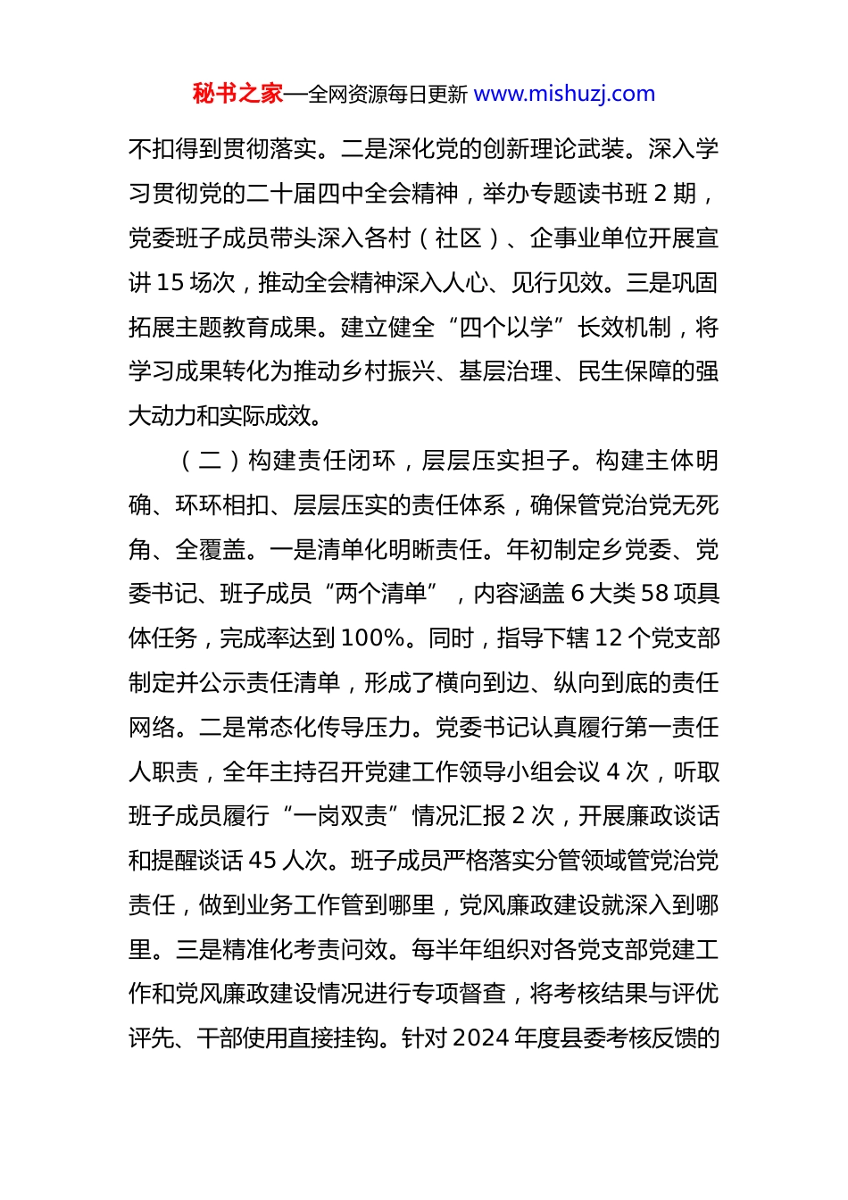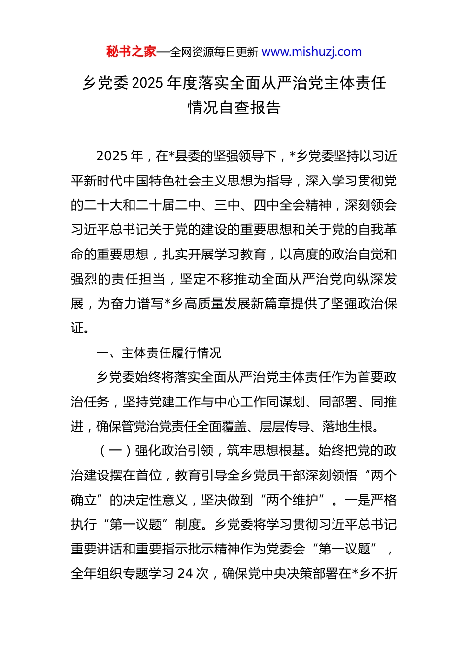 秘书之家—全网资源每日更新 www.mishuzj.com乡党委 2025 年度落实全面从严治党主体责任情况自查报告 2025 年,在*县委的坚强领导下,*乡党委坚持以习近平新时代中国特色社会主义思想为指导,深入学习贯彻党的二十大和二十届二中、三中、四中全会精神,深刻领会习近平总书记关于党的建设的重要思想和关于党的自我革命的重要思想,扎实开展学习教育,以高度的政治自觉和强烈的责任担当,坚定不移推动全面从严治党向纵深发展,为奋力谱写*乡高质量发展新篇章提供了坚强政治保证。一、主体责任履行情况乡党委始终将落实全面从严治党主体责任作为首要政治任务,坚持党建工作与中心工作同谋划、同部署、同推进,确保管党治党责任全面覆盖、层层传导、落地生根。(一)强化政治引领,筑牢思想根基。始终把党的政治建设摆在首位,教育引导全乡党员干部深刻领悟“两个确立”的决定性意义,坚决做到“两个维护”。一是严格执行“第一议题”制度。乡党委将学习贯彻习近平总书记重要讲话和重要指示批示精神作为党委会“第一议题”,全年组织专题学习 24 次,确保党中央决策部署在*乡不折秘书之家—全网资源每日更新 www.mishuzj.com不扣得到贯彻落实。二是深化党的创新理论武装。深入学习贯彻党的二十届四中全会精神,举办专题读书班 2 期,党委班子成员带头深入各村(社区)、企事业单位开展宣讲 15 场次,推动全会精神深入人心、见行见效。三是巩固拓展主题教育成果。建立健全“四个以学”长效机制,将学习成果转化为推动乡村振兴、基层治理、民生保障的强大动力和实际成效。(二)构建责任闭环,层层压实担子。构建主体明确、环环相扣、层层压实的责任体系,确保管党治党无死角、全覆盖。一是清单化明晰责任。年初制定乡党委、党委书记、班子成员“两个清单”,内容涵盖 6 大类 58 项具体任务,完成率达到 100%。同时,指导下辖 12 个党支部制定并公示责任清单,形成了横向到边、纵向到底的责任网络。二是常态化传导压力。党委书记认真履行第一责任人职责,全年主持召开党建工作领导小组会议 4 次,听取班子成员履行“一岗双责”情况汇报 2 次,开展廉政谈话和提醒谈话 45 人次。班子成员严格落实分管领域管党治党责任,做到业务工作管到哪里,党风廉政建设就深入到哪里。三是精准化考责问效。每半年组织对各党支部党建工作和党风廉政建设情况进行专项督查,将考核结果与评优评先、干部使用直接挂钩。针对 2024 年度县委考核反馈的秘书之家—全网资源每日更新 www.mishuzj.com两个方面 4 个具体问题,已制定整改措施 11 条,建立整改台账并实现 100%闭环销号。(三)聚焦正风肃纪,持续净化生态。坚持严的主基调不动摇,以钉钉子精神纠治“四风”,营造风清气正的政治生态。一是扎实开展专项学习教育。按照上级部署,全面启动“深入贯彻中央八项规定精神学习教育”,制定详 细 实 施 方 案 , 全 乡 280 余 名 党 员 干 部 参 与 率 达 到100%。通过集中学习、专题研讨、观看警示教育片等形式,引导党员干部筑牢思想防线。二是坚持不懈纠治“四风”顽疾。紧盯重要节点,通过发送廉洁提醒短信、开展明察暗访等方式,严防“节日腐败”。全年开展作风建设专项检查 6 次,重点整治“指尖上的形式主义”、文山会海等问题,推动会风文风持续好转。三是严肃执纪问责。充分运用监督执纪“四种形态”,抓早抓小、防微杜渐。全年运用“第一种形态”处理 21 人次,给予党纪轻处分 2人,坚决维护了纪律的刚性约束。二、存在的主要问题与不足对照党的二十届四中全会提出的新部署新要求,对照党章党规党纪,对照人民群众的新期盼,乡党委在落实全面从严治党主体责任方面仍存在一些亟待解决的突出问题,具体表现在以下几个方面:秘书之家—全网资源每日更新 www.mishuzj.com(一)政治监督穿透力不足,压力传导末端递减现象依然存在。乡党委在宏观上能够紧跟上级部署,但在将政治监督具体化、精准化、常态化方面,穿透力还显不足,尤其是在向基层党组织和普通党员传导压力时,存在“上热中温下冷”的现象。一是监督检查“一阵风”。乡纪委在开...