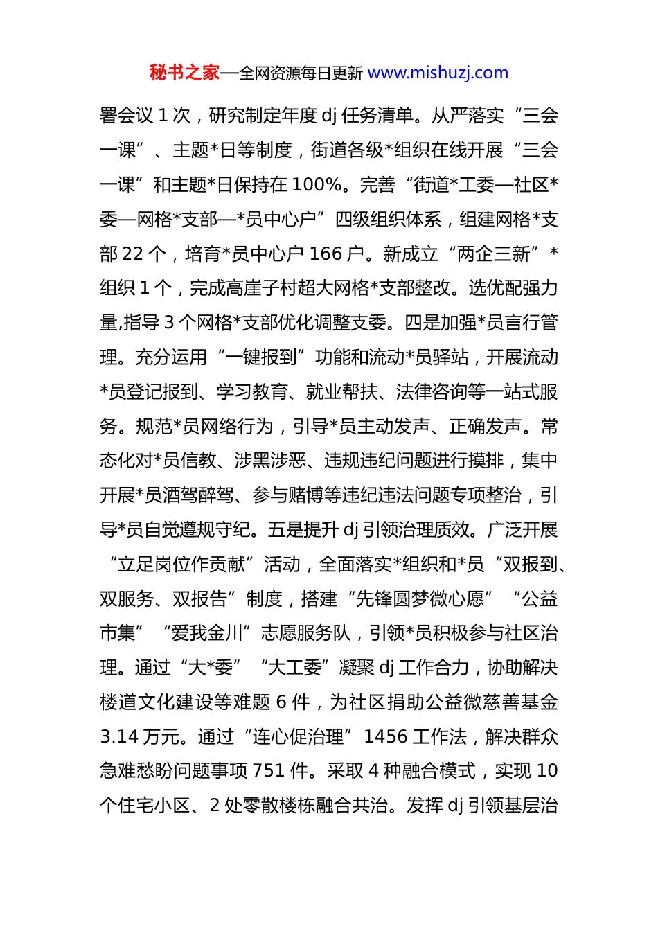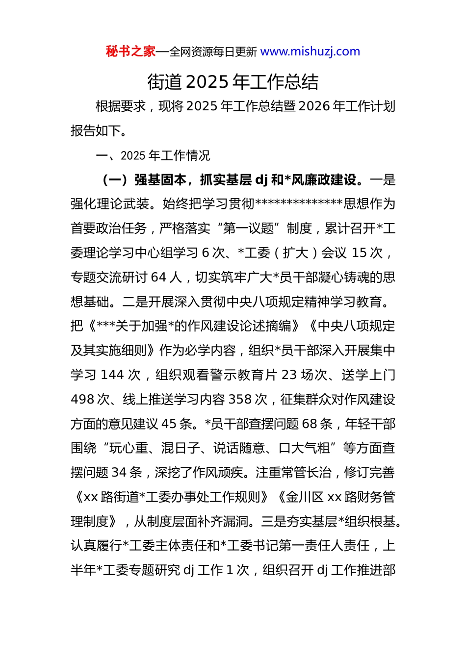 秘书之家—全网资源每日更新 www.mishuzj.com街道 2025 年工作总结根据要求,现将 2025 年工作总结暨 2026 年工作计划报告如下。一、2025 年工作情况(一)强基固本,抓实基层 dj 和*风廉政建设。一是强化理论武装。始终把学习贯彻**************思想作为首要政治任务,严格落实“第一议题”制度,累计召开*工委理论学习中心组学习 6 次、*工委(扩大)会议 15 次,专题交流研讨 64 人,切实筑牢广大*员干部凝心铸魂的思想基础。二是开展深入贯彻中央八项规定精神学习教育。把《***关于加强*的作风建设论述摘编》《中央八项规定及其实施细则》作为必学内容,组织*员干部深入开展集中学习 144 次,组织观看警示教育片 23 场次、送学上门498 次、线上推送学习内容 358 次,征集群众对作风建设方面的意见建议 45 条。*员干部查摆问题 68 条,年轻干部围绕“玩心重、混日子、说话随意、口大气粗”等方面查摆问题 34 条,深挖了作风顽疾。注重常管长治,修订完善《xx 路街道*工委办事处工作规则》《金川区 xx 路财务管理制度》,从制度层面补齐漏洞。三是夯实基层*组织根基。认真履行*工委主体责任和*工委书记第一责任人责任,上半年*工委专题研究 dj 工作 1 次,组织召开 dj 工作推进部秘书之家—全网资源每日更新 www.mishuzj.com署会议 1 次,研究制定年度 dj 任务清单。从严落实“三会一课”、主题*日等制度,街道各级*组织在线开展“三会一课”和主题*日保持在 100%。完善“街道*工委—社区*委—网格*支部—*员中心户”四级组织体系,组建网格*支部 22 个,培育*员中心户 166 户。新成立“两企三新”*组织 1 个,完成高崖子村超大网格*支部整改。选优配强力量,指导 3 个网格*支部优化调整支委。四是加强*员言行管理。充分运用“一键报到”功能和流动*员驿站,开展流动*员登记报到、学习教育、就业帮扶、法律咨询等一站式服务。规范*员网络行为,引导*员主动发声、正确发声。常态化对*员信教、涉黑涉恶、违规违纪问题进行摸排,集中开展*员酒驾醉驾、参与赌博等违纪违法问题专项整治,引导*员自觉遵规守纪。五是提升 dj 引领治理质效。广泛开展“立足岗位作贡献”活动,全面落实*组织和*员“双报到、双服务、双报告”制度,搭建“先锋圆梦微心愿”“公益市集”“爱我金川”志愿服务队,引领*员积极参与社区治理。通过“大*委”“大工委”凝聚 dj 工作合力,协助解决楼道文化建设等难题 6 件,为社区捐助公益微慈善基金3.14 万元。通过“连心促治理”1456 工作法,解决群众急难愁盼问题事项 751 件。采取 4 种融合模式,实现 10个住宅小区、2 处零散楼栋融合共治。发挥 dj 引领基层治秘书之家—全网资源每日更新 www.mishuzj.com理协调机制统筹推动作用,积极推进“未诉先办”,全面落实“有事找书记”“有事找警察”工作机制,截至目前主动出击收集社情民意 3517 个、排查化解矛盾纠纷 276件。扎实开展“我为群众办实事”实践活动,协调解决居民楼天然气安装、下水井盖修复等群众关切问题 14 件。六是推进街道廉政建设。召开*风廉政建设专题会议 1 次、警示教育大会 1 次,街道*工委书记开展集中廉政谈话 2 次,其他班子成员对分管领域工作人员开展“一对一、面对面”廉政谈话 1 次,提醒、约谈干部职工 70 人次,观看警示教育片 2 部,签订《廉政承诺书》70 份,排查出廉政风险点 36 处。聚焦“90 后”“00 后”干部群体,积极开展“清廉伴飞”行动,对街道社区 17 名年轻干部在网络游戏、网上信贷、民间借贷等情况进行排查摸底,教育引导年轻干部扣好“第一粒扣子”。(二)相辅相成,统筹推动意识形态、宣传思想和新时代文明实践工作。一是坚持*管宣传和意识形态。街道*工委坚持把牢意识形态“总开关”,严格落实意识形态“一岗双责”责任,召开意识形态工作领导小组会议 1 次,意识形态分析研判会 1 次。严格落实信息发布“三审三校”制度,围绕中心工作广泛开展宣传活动,累计在今日金川发布信息 314 篇(被市级媒体采用 21 篇),切实强秘书之家—全网资源每日更新 w...