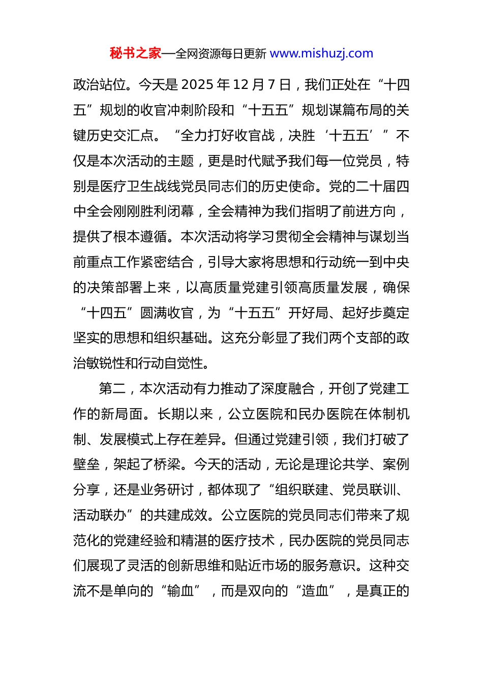 秘书之家—全网资源每日更新 www.mishuzj.com在公立医院与民办医院联合主题党日上的总结讲话 同志们:大家好!今天,我们在这里联合举办的这次支部主题党日活动,内容丰富、形式新颖、意义深远。刚才,我认真听取了大家的交流发言,也实地感受到了我们公立医院与民办医院党员同志们饱满的政治热情和昂扬的精神风貌。这已经是我第二次参加我们民办医院的主题党日活动。记得上一次来,我看到了民办医院党建工作的初步探索和蓬勃生机;而这一次,我看到的是更加系统化的责任体系、更加坚实的组织基础和更加富有成效的共建机制。这充分证明,我们的党建结对共建之路,方向是正确的,步伐是坚实的,成效是显著的。借此机会,我将围绕本次主题党日活动,结合当前的形势任务,谈三点意见。一、一次恰逢其时、意义重大的政治淬炼和思想洗礼首先,我对本次联合主题党日活动的成功举办给予高度评价。这次活动,不仅是一次常规的组织生活,更是在一个关键时间节点上召开的一次重要的思想动员会和工作推进会。第一,本次活动精准把握了时代脉搏,体现了高度的秘书之家—全网资源每日更新 www.mishuzj.com政治站位。今天是 2025 年 12 月 7 日,我们正处在“十四五”规划的收官冲刺阶段和“十五五”规划谋篇布局的关键历史交汇点。“全力打好收官战,决胜‘十五五’”不仅是本次活动的主题,更是时代赋予我们每一位党员,特别是医疗卫生战线党员同志们的历史使命。党的二十届四中全会刚刚胜利闭幕,全会精神为我们指明了前进方向,提供了根本遵循。本次活动将学习贯彻全会精神与谋划当前重点工作紧密结合,引导大家将思想和行动统一到中央的决策部署上来,以高质量党建引领高质量发展,确保“十四五”圆满收官,为“十五五”开好局、起好步奠定坚实的思想和组织基础。这充分彰显了我们两个支部的政治敏锐性和行动自觉性。第二,本次活动有力推动了深度融合,开创了党建工作的新局面。长期以来,公立医院和民办医院在体制机制、发展模式上存在差异。但通过党建引领,我们打破了壁垒,架起了桥梁。今天的活动,无论是理论共学、案例分享,还是业务研讨,都体现了“组织联建、党员联训、活动联办”的共建成效。公立医院的党员同志们带来了规范化的党建经验和精湛的医疗技术,民办医院的党员同志们展现了灵活的创新思维和贴近市场的服务意识。这种交流不是单向的“输血”,而是双向的“造血”,是真正的秘书之家—全网资源每日更新 www.mishuzj.com优势互补、互学互鉴。正如我们民办医院的工作总结中提到的,这推动了党建工作从“有形覆盖”向“有效覆盖”的深度转变,为破解新兴领域党建难题提供了生动范例。第三,本次活动有效激发了队伍活力,展现了党员的先锋本色。在刚才的讨论中,无论是来自公立医院的专家党员,还是来自民办医院的青年骨干,大家都能够围绕学科建设、人才培养、服务提升等议题,畅所欲言、碰撞思想。这不仅是一次业务交流,更是一次党性锤炼。大家在交流中深化了对“人民至上、生命至上”理念的理解,强化了作为一名医务工作者和一名共产党员的责任感与使命感。这种精神风貌,正是我们打好“收官战”、决胜“十五五”最宝贵的财富。二、结对共建机制下的生动实践与丰硕成果自公立医院与民办医院党建结对共建机制,特别是“六联六共”工作机制推行以来,双方的合作不断深化,取得了一系列实实在在的成效。这些成效不仅体现在党建工作水平的提升上,更深刻地融入了业务发展的方方面面。一是组织体系共建,战斗堡垒更加坚固。过去,民办医院党建工作存在组织基础薄弱、党员分散等问题。通过结对共建,我们以“拉网式”排查摸清底数,建立“一院秘书之家—全网资源每日更新 www.mishuzj.com一表”台账,并通过选派党建指导员等方式,实现了党的工作全覆盖。联合党支部的建立,更是将分散的党员力量凝聚起来,让每一位党员都找到了组织归属感。这种组织力的提升,为民办医院的健康发展提供了坚强的政治保障和组织保障。二是医务人才共育,队伍素质显著增强。人才是医院发展的核心竞争力。我们通过共建机制,为民办医院的人才培养开辟了新通道。公立医院利用自身优势,...
