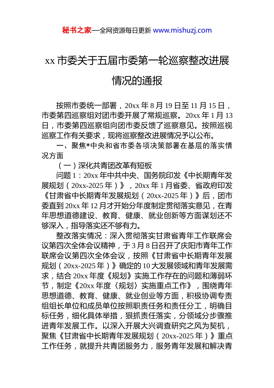 秘书之家—全网资源每日更新 www.mishuzj.comxx 市委关于五届市委第一轮巡察整改进展情况的通报按照市委统一部署,20xx 年 8 月 19 日至 11 月 15 日,市委第四巡察组对团市委开展了常规巡察。20xx 年 1 月 13日,市委第四巡察组向团市委反馈了巡察意见。按照巡视巡察工作有关要求,现将巡察整改进展情况予以公布。一、聚焦*中央和省市委各项决策部署在基层的落实情况方面(一)深化共青团改革有短板问题 1:20xx 年中共中央、国务院印发《中长期青年发展规划(20xx-2025 年)》,20xx 年 1 月省委、省政府印发《甘肃省中长期青年发展规划(20xx-2025 年)》后,团市委直到 20xx 年 12 月才开始分年度制定贯彻落实意见,在青年思想道德建设、教育、健康、就业创新等方面谋划还不够深入,指导落实还不够有力。整改落实情况:深入贯彻落实甘肃省青年工作联席会议第四次全体会议精神,于 3 月 8 日召开了庆阳市青年工作联席会议第四次全体会议,按照《甘肃省中长期青年发展规划(20xx-2025 年)》确定的 10 大发展领域和青年发展需求,结合 20xx 年度《规划》实施工作存在的问题和薄弱环节,制定《20xx 年度〈规划〉实施重点工作》,围绕青年思想道德、教育、健康、就业创业等方面,积极协调专责组组长单位和成员单位按照职责任务和责任分工,明确目标任务,细化具体举措,狠抓责任落实,分领域分步骤推进青年发展工作。以深入开展大兴调查研究之风为契机,聚焦《甘肃省中长期青年发展规划(20xx-2025 年)》重点工作任务,就提升共青团服务力,服务青年发展和解决青秘书之家—全网资源每日更新 www.mishuzj.com年最关心最直接最现实的利益问题等方面开展调研指导,推动《规划》有效落实。(9 月底已完成)问题 2:贯彻落实团中央《新时代全面从严治团实施纲要》还不够到位,未按规定建立省、市团代表和委员重大事项报告、履职登记、述职评议等制度,未健全提升各级团代表整体素质和履职能力的机制。整改落实情况:认真贯彻《关于加强团的全国和地方各级代表大会代表及其委员会成员作用发挥的意见》,全面提升代表委员进站率、履职活动参与率、“两联”机制落实率,各县区团代表联络站每月至少开展两次活动,推动团的各级代表大会及其委员会发挥政治功能,实现整体活跃。严格落实《新时代全面从严治团实施纲要》《庆阳共青团贯彻落实<新时代全面从严治团实施纲要>实施细则》,制定委员履职登记表,每年汇报工作开展情况,切实提升委员履职能力。研究制定《庆阳市基层团组织书记任期绩效和履职评价考核办法》,压实基层团组织书记责任,增强政治性、先进性、群众性,推动基层团的引领力组织力、服务力和大局贡献度协同提升。(8 月底已完成)问题 3:团的基层组织覆盖面还不够广泛,在“两新组织”(新经济组织和新社会组织)中延伸共青团组织体系链不足,未构建起纵横交错的网络化组织体系,使共青团的影响力、感染力、号召力没有得到充分显现。全市建立非公经济企业团组织 259 个,占全市纳入统计口径非公经济企业的 48.1%,建立新社会组织团组织 111 个,占全市社会组织中已建立*组织总数的 11.7%。整改落实情况:进一步研究扩大组织有效覆盖面,在赴县区调研走访、推进县域共青团基层组织改革工作过程中重点督促指导“两新”领域团组织建立和发展,督促县区提升“两新”组织覆盖面。根据全年工作安排,按照“每月每县新增一家”非公企业团组织工作任务,于年底前实现全市非公企业团组织新增 100 个左右。(12 月底完秘书之家—全网资源每日更新 www.mishuzj.com成)(二)履职尽责不到位问题 4:团市委常委会、专委会职能发挥不充分。20xx年 1 月以来,四届团市委仅召开过一次常委会,此后每年的规划制定、方案编制等均未在常委会上研究讨论,常委参与重大事项讨论较少,知情率低;20xx 年 3 月,四届团市委成立农村、学校、基层组织工作 3 个专门委员会,主要职责是组织开展调研、推进本领域团的建设等,但至今未开展相关工作。整改落实情况:在团十九大代表选举过程中,召开常委会,对推荐人选进行研究遴选。召开四...