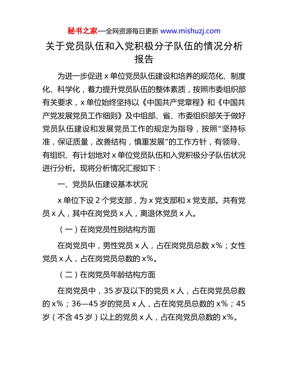 秘书之家—全网资源每日更新 www.mishuzj.com关于党员队伍和入党积极分子队伍的情况分析报告为进一步促进 x 单位党员队伍建设和培养的规范化、制度化、科学化,着力提升党员队伍的整体素质,按照市委组织部有关要求,x 单位始终坚持以《中国共产党章程》和《中国共产党发展党员工作细则》及中组部、省、市委组织部关于做好“党员队伍建设和发展党员工作的规定为指导,按照 坚持标”准,保证质量,改善结构,慎重发展 的工作方针,有领导、有组织、有计划地对 x 单位党员队伍和入党积极分子队伍状况进行分析。现将分析情况汇报如下:一、党员队伍建设基本状况x 单位下设 2 个党支部,为 x 党支部和 x 党支部。共有党员 x 人,其中在岗党员 x 人,离退休党员 x 人。(一)在岗党员性别结构方面在岗党员中,男性党员 x 人,占在岗党员总数 x%;女性党员 x 人,占在岗党员总数的 x%。(二)在岗党员年龄结构方面在岗党员中,35 岁及以下的党员 x 人,占在岗党员总数的 x%;36—45 岁的党员 x 人,占在岗党员总数的 x%;45岁(不含 45 岁)以上的党员 x 人,占在岗党员总数的 x%。秘书之家—全网资源每日更新 www.mishuzj.com(三)在岗党员学历结构方面在岗党员中,大专及以下学历 x 人,占在岗党员总数的 x%;大学学历 x 人,占在岗党员总数的 x%;研究生学历为 x人,x%。(四)在岗党员职称结构方面在岗党员中,取得职称的有 x 人,其中初级职称 x 人,占在岗党员总数的 x%;中级职称 x 人,占在岗党员总数的 x%;高级职称 x 人,占在岗党员总数的 x%。无职称(含实习期人员)x 人,占在岗党员总数的 x%。二、入党积极分子队伍情况截至目前,x 单位在岗人员中有 x 名人员为群众身份,在下一步工作中,将严格按照确定入党积极分子流程,及时研究其能否列为入党积极分子。三、党员队伍发挥作用情况近年来,x 单位党员队伍在市委、市政府的坚强领导下,认真学习习近平新时代中国特色社会主义思想,严格贯彻执行党的路线、方针、政策,积极助推 x 市各项工作的开展。树“”“”“”牢 四个意识 ,坚定 四个自信 ,坚决做到 两个维护 。(一)党员队伍政治理论素养较高秘书之家—全网资源每日更新 www.mishuzj.comx 单位对政治理论和业务知识的学习都非常重视,全体在岗党员的学习积极性较高。通过举办学习班、讲党课、报告会、学习考察和开展主题党日、读书活动等多种学习形式,深入学习贯彻习近平新时代中国特色社会主义思想和党的路线、方针、政策,落实党性、宗旨、廉政、纪律和优良作风等教育“活动。通过强化 x”主题教育贯彻落实,对标对表,树立目标导向和问题意识,严格遵循主题教育总体要求,党员队伍的思想政治素质有了进一步提高。(二)党员先锋模范作用发挥较好虽然 x 单位在岗党员中 x 岁以上党员占比接近半数,在平时党员先锋模范作用发挥上不易体现出来,但是在关键时期。比如在新冠肺炎防疫期间和重大节日、活动的稳控期间,在落“”实 双报到 工作机制,在脱贫攻坚一线等,广大党员的先锋模范作用表现突出。(三)党组织的凝聚力和战斗力不断增强经过多年来坚持不懈加强机关党的建设,党员教育管理的体制不断健全,形成了 x 抓方向、抓指导,党支部抓落实、抓具体的党员教育管理格局。在党组织班子建设、党员教育管理、党风廉政建设、发展党员工作以及对党支部日常考核评价等方面完善了相关的制度规范,促进了机关党建水平的不断提秘书之家—全网资源每日更新 www.mishuzj.com“高。特别是经过 x”主题教育,机关党组织在思想建设、组织建设、作风建设和制度建设等方面都有了新的进步。(四)党务干部队伍建设不断加强注重加强党委和党支部两级班子建设,通过组织支部书记、组织委员参加党务知识培训,组织专职党务干部外出考察学习等,不断提高党务工作者抓党建的工作能力。x 单位党务干部队伍的力量不断增强,有力的提升了 x 单位党员队伍作用的充分发挥。四、当前党员队伍中存在的问题当前 x 单位党员队伍党员年龄结构明显老化,比例不够协调。在岗党员 ...