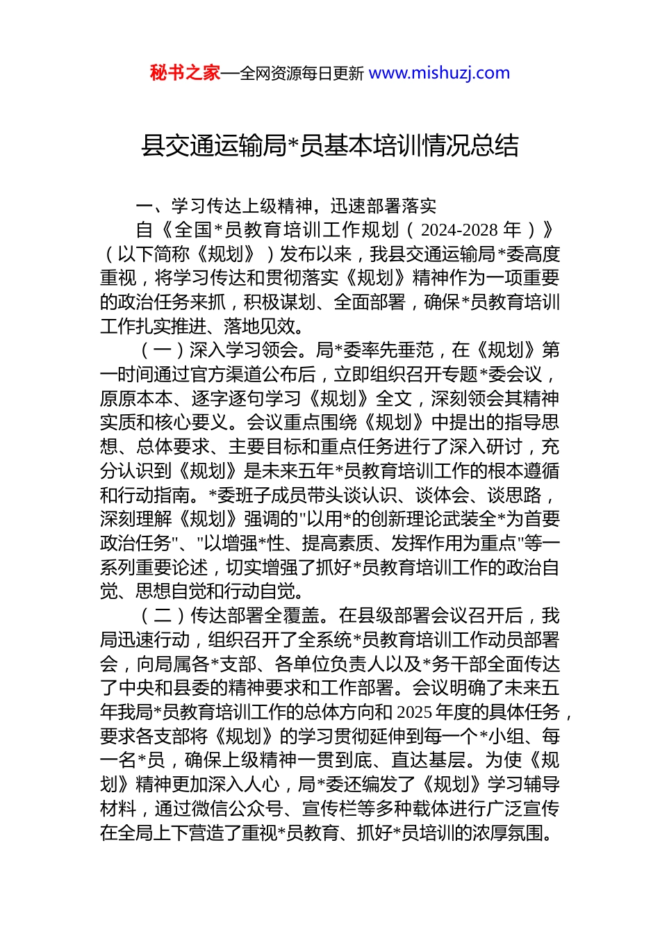 秘书之家—全网资源每日更新 www.mishuzj.com县交通运输局*员基本培训情况总结一、学习传达上级精神,迅速部署落实自《全国*员教育培训工作规划(2024-2028 年)》(以下简称《规划》)发布以来,我县交通运输局*委高度重视,将学习传达和贯彻落实《规划》精神作为一项重要的政治任务来抓,积极谋划、全面部署,确保*员教育培训工作扎实推进、落地见效。(一)深入学习领会。局*委率先垂范,在《规划》第一时间通过官方渠道公布后,立即组织召开专题*委会议,原原本本、逐字逐句学习《规划》全文,深刻领会其精神实质和核心要义。会议重点围绕《规划》中提出的指导思想、总体要求、主要目标和重点任务进行了深入研讨,充分认识到《规划》是未来五年*员教育培训工作的根本遵循和行动指南。*委班子成员带头谈认识、谈体会、谈思路,深刻理解《规划》强调的"以用*的创新理论武装全*为首要政治任务"、"以增强*性、提高素质、发挥作用为重点"等一系列重要论述,切实增强了抓好*员教育培训工作的政治自觉、思想自觉和行动自觉。(二)传达部署全覆盖。在县级部署会议召开后,我局迅速行动,组织召开了全系统*员教育培训工作动员部署会,向局属各*支部、各单位负责人以及*务干部全面传达了中央和县委的精神要求和工作部署。会议明确了未来五年我局*员教育培训工作的总体方向和 2025 年度的具体任务,要求各支部将《规划》的学习贯彻延伸到每一个*小组、每一名*员,确保上级精神一贯到底、直达基层。为使《规划》精神更加深入人心,局*委还编发了《规划》学习辅导材料,通过微信公众号、宣传栏等多种载体进行广泛宣传在全局上下营造了重视*员教育、抓好*员培训的浓厚氛围。秘书之家—全网资源每日更新 www.mishuzj.com(三)制定实施方案。在深入学习调研的基础上,结合我县交通运输工作实际,局*委制定并印发了《县交通运输局*员教育培训实施方案(2025-2028 年)》。该方案不仅全面对接了《规划》和县级实施方案的要求,还充分体现了我局行业特色:一是明确任务分工。方案明确了局*委承担主体责任,*委主要领导履行第一责任人职责,各*支部负责具体组织实施,形成了一级抓一级、层层抓落实的责任体系。二是突出交通特色。方案强调要围绕学习贯彻******关于交通运输工作的重要论述,聚焦加快建设交通强国、提高综合交通运输网络效率、提升运输服务品质等国家战略和行业使命,设置具有交通特色的培训课程。三是细化工作措施。方案对培训内容、方式方法、学时要求、考核评估、保障措施等都作了具体规定,确保*员教育培训工作有章可循、有据可依。方案特别强调要落实政治理论教育、政治教育和政治训练、*章*规 dj 教育、*的宗旨教育、革命传统教育、形势政策教育、知识技能教育等七项基本任务,并用 5 年左右时间,分级分类对*员开展有组织的专题培训,确保全体*员应训尽训。二、集中培训开展情况,分层分类实施2025 年,我局坚持将集中培训作为*员教育的重要抓手,紧扣**************思想这一主题主线,结合交通运输行业特点和*员队伍实际,分层分类、精准施训,组织开展了一系列内容丰富、形式多样的集中培训,取得了显著成效。(一)领导班子专题培训。局*委班子成员率先垂范,积极参加县委组织部、县委*校举办的领导干部专题研讨班,围绕*的二十届三中全会精神、******关于*的建设的重要思想、******关于交通运输工作的重要论述等核心内容进行深入学习研讨。班子成员通过系统学习,进一步强化了政治忠诚,提高了政治判断力、政治领悟力、政治执行力增强了推动交通运输高质量发展的责任感和使命感。培训秘书之家—全网资源每日更新 www.mishuzj.com后,每位班子成员都结合分工撰写了心得体会和调研报告将学习成果转化为谋划工作的具体思路。(二)*组织书记轮训。严格落实《规划》中关于"基层*组织书记 5 年内参加各类集中学习培训累计不少于 35 天或280 学时,其中每年参加县级以上*委举办的脱产培训累计一般不少于 5 天或 40 学时"的要求。我局积极选派基层*支部书记参加县委组织部、县委*校举办的"*支部书记能力提升工程"培训班。培训围绕支部工作条例、dj 业务...