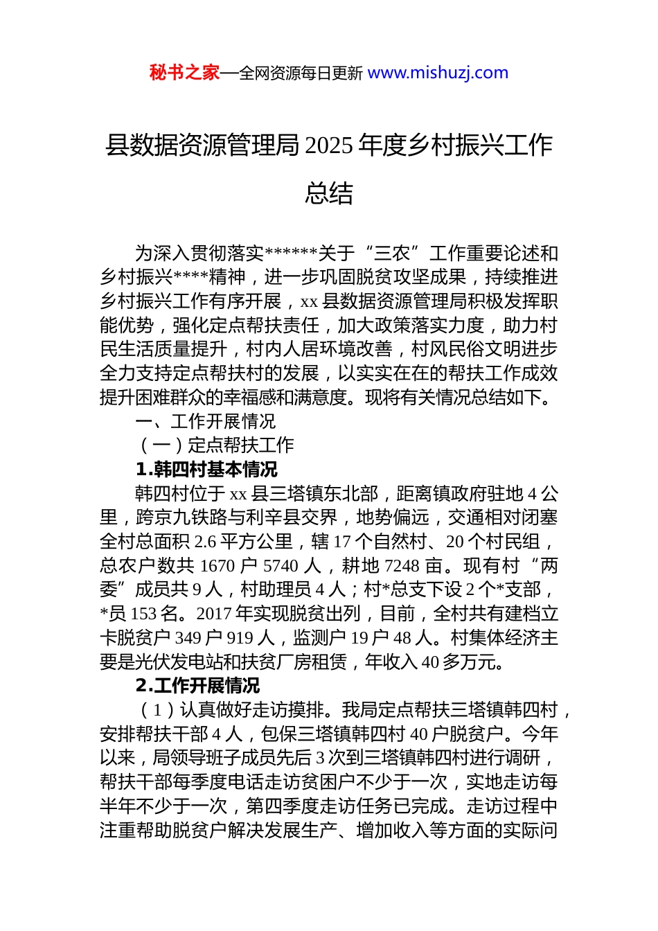 秘书之家—全网资源每日更新 www.mishuzj.com县数据资源管理局 2025 年度乡村振兴工作总结为深入贯彻落实******关于“三农”工作重要论述和乡村振兴****精神,进一步巩固脱贫攻坚成果,持续推进乡村振兴工作有序开展,xx 县数据资源管理局积极发挥职能优势,强化定点帮扶责任,加大政策落实力度,助力村民生活质量提升,村内人居环境改善,村风民俗文明进步全力支持定点帮扶村的发展,以实实在在的帮扶工作成效提升困难群众的幸福感和满意度。现将有关情况总结如下。一、工作开展情况(一)定点帮扶工作1.韩四村基本情况韩四村位于 xx 县三塔镇东北部,距离镇政府驻地 4 公里,跨京九铁路与利辛县交界,地势偏远,交通相对闭塞全村总面积 2.6 平方公里,辖 17 个自然村、20 个村民组,总农户数共 1670 户 5740 人,耕地 7248 亩。现有村“两委”成员共 9 人,村助理员 4 人;村*总支下设 2 个*支部,*员 153 名。2017 年实现脱贫出列,目前,全村共有建档立卡脱贫户 349 户 919 人,监测户 19 户 48 人。村集体经济主要是光伏发电站和扶贫厂房租赁,年收入 40 多万元。2.工作开展情况(1)认真做好走访摸排。我局定点帮扶三塔镇韩四村,安排帮扶干部 4 人,包保三塔镇韩四村 40 户脱贫户。今年以来,局领导班子成员先后 3 次到三塔镇韩四村进行调研,帮扶干部每季度电话走访贫困户不少于一次,实地走访每半年不少于一次,第四季度走访任务已完成。走访过程中注重帮助脱贫户解决发展生产、增加收入等方面的实际问秘书之家—全网资源每日更新 www.mishuzj.com题和困难,避免返贫风险,切实提高生活水平。(2)发挥部门职能特色。我局根据县政务服务大厅成熟经验,推进韩四村便民服务站标准化、规范化、便利化建设。同时,在韩四村便民服务站投放了一台政务服务自助终端,进一步降低企业群众的办事成本,实现政务服务就近办,家门口办。通过和韩四村便民服务站开展“帮办代办”联动,帮助村民办理农机证、营业执照等证件,全面打通为民服务的“最后一米”,助力韩四村产业振兴。(3)稳步推进驻村帮扶。我局驻村干部自驻村以来,始终坚守岗位,坚持吃住在村、工作日在岗,并积极服从乡镇*委政府的统一管理和领导。一年来,积极参加村里的周一例会,为村里各项工作的开展建言献策。对韩四村 17个自然庄已全覆盖走访一遍,共走访 349 户脱贫户。考察了解光伏电站、扶贫厂房等韩四村产业发展现状,切实用好xx 万元帮扶资金,扎实开展重大消防隐患检查、勘察禁毒铲毒检查、秸秆禁烧、低保年审、抗旱补墒、送教上门等工作,全面推进乡村振兴任务落实。(4)开展慰问帮扶活动。在春节、“七一”建*节、“八一”建军节之际,xx 县数据资源管理局积极开展慰问困难*员活动,逐一走访困难*员家庭,通过面对面的交流,深入了解困难*员的生活状况与实际需求,以实际行动传递*组织的关怀与问候,让困难*员们切实感受到了*组织的关心和爱护,激励着全体*员干部不忘初心,牢记使命,在乡村振兴的道路上继续砥砺前行。(5)聚焦需求精准帮扶。为深入贯彻“建强村*组织、推进强村富民、提升治理水平、为民办事服务”的选派驻村工作总体要求,扎实保障驻村帮扶工作提质增效,xx 县数据局精准发力、靶向施策,推出系列帮扶举措。一方面专项拨付 3000 元帮扶资金,用于韩四村村室新建 4 个宣传栏,聚焦乡村振兴、惠民政策等核心内容进行常态化宣传让政策信息直达基层、深入人心,切实提升群众政策知晓秘书之家—全网资源每日更新 www.mishuzj.com率;另一方面,主动对接村里办公刚需,送去 2 台办公电脑与 1 台打印机,有效破解村“两委”办公设备短缺的难题,为村级事务高效推进、为民服务优质开展筑牢硬件根基。(二)文化振兴工作1.加大文化网络宣传。我局在皖事通 appxx 分厅上线了“xx 非物遗产简介”等专题文化推介应用,通过图文结合的形式,以皖事通 app 这一高频使用软件为载体,深化 xx文化的网络宣传推广。同时,结合数字乡村工作,探索将文化要素有机融合到数字化基层治理系统中,借助数字化平台提升文化传播的广度,扩展...