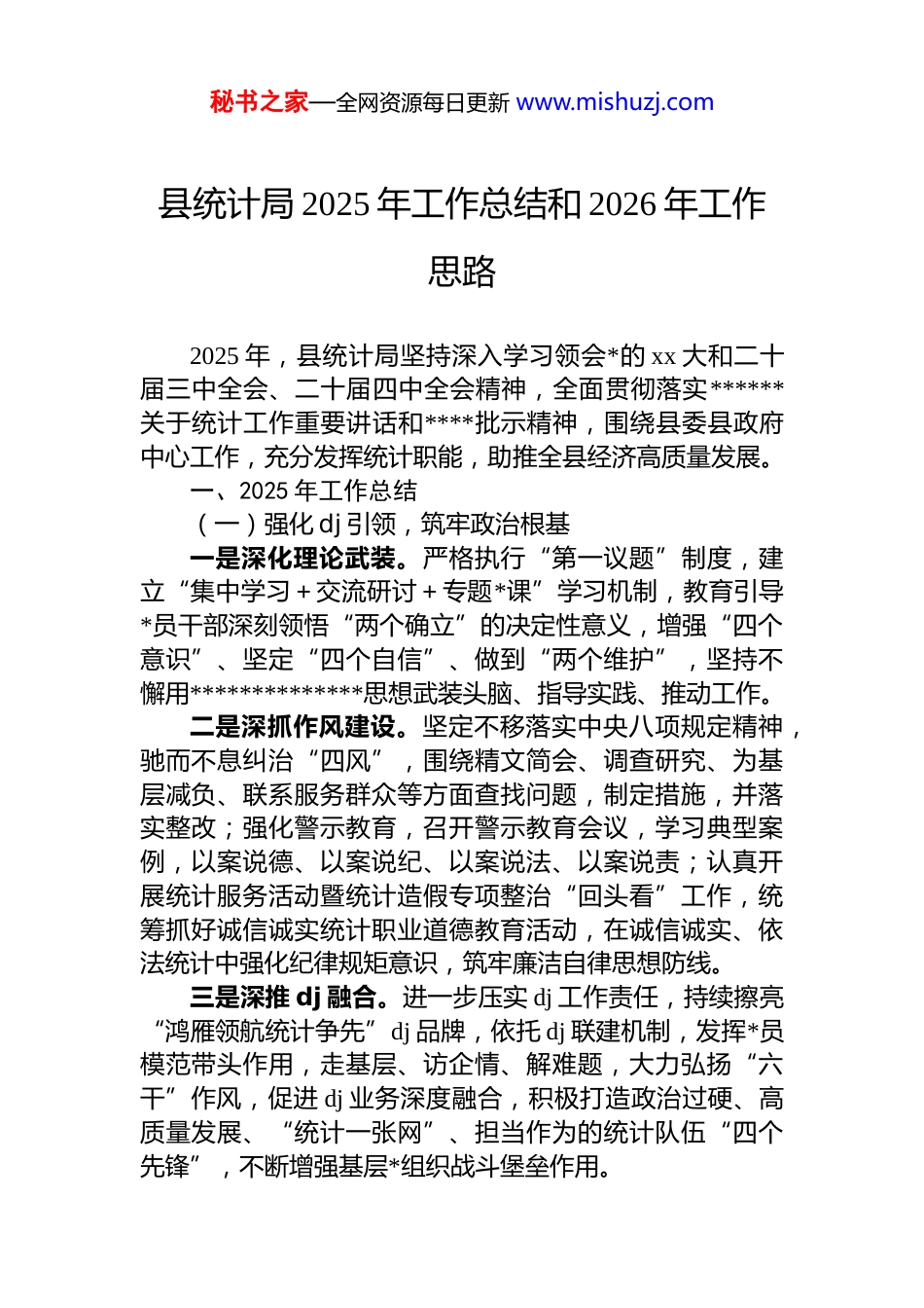 秘书之家—全网资源每日更新 www.mishuzj.com县统计局 2025 年工作总结和 2026 年工作思路2025 年,县统计局坚持深入学习领会*的 xx 大和二十届三中全会、二十届四中全会精神,全面贯彻落实******关于统计工作重要讲话和****批示精神,围绕县委县政府中心工作,充分发挥统计职能,助推全县经济高质量发展。一、2025 年工作总结(一)强化 dj 引领,筑牢政治根基一是深化理论武装。严格执行“第一议题”制度,建立“集中学习+交流研讨+专题*课”学习机制,教育引导*员干部深刻领悟“两个确立”的决定性意义,增强“四个意识”、坚定“四个自信”、做到“两个维护”,坚持不懈用**************思想武装头脑、指导实践、推动工作。二是深抓作风建设。坚定不移落实中央八项规定精神,驰而不息纠治“四风”,围绕精文简会、调查研究、为基层减负、联系服务群众等方面查找问题,制定措施,并落实整改;强化警示教育,召开警示教育会议,学习典型案例,以案说德、以案说纪、以案说法、以案说责;认真开展统计服务活动暨统计造假专项整治“回头看”工作,统筹抓好诚信诚实统计职业道德教育活动,在诚信诚实、依法统计中强化纪律规矩意识,筑牢廉洁自律思想防线。三是深推 dj 融合。进一步压实 dj 工作责任,持续擦亮“鸿雁领航统计争先”dj 品牌,依托 dj 联建机制,发挥*员模范带头作用,走基层、访企情、解难题,大力弘扬“六干”作风,促进 dj 业务深度融合,积极打造政治过硬、高质量发展、“统计一张网”、担当作为的统计队伍“四个先锋”,不断增强基层*组织战斗堡垒作用。秘书之家—全网资源每日更新 www.mishuzj.com(二)强化队伍管理,筑牢调查根基一是持续规范统计队伍管理。进一步规范基层统计人员变更备案审批、统计工作交接等制度,建立健全乡镇平台统计人员基本信息库,积极推进乡镇新任统计人员跟班学习、培训考试,上好任职“第一课”,配强乡镇(平台)统计力量,持续推进基层统计规范化建设。二是持续落实“五同步”工作模式。持续深入开展“五同步”统计工作模式,即“同步催报、同步审核、同步核查、同步评估、同步分析”,指导各乡镇平台规范报表催报、数据质量审核、数据核查、数据质量评估以及数据分析等工作,主抓一线统计人员,确保基层统计人员业务素质跟上调查工作的需要。(三)强化履职尽责,筑牢服务根基一是加强分析研判。围绕县委县政府中心工作,撰写月度分析、季度分析、专题分析等材料,及时做好经济运行监测、数据分析研判和监测预警,为县委县政府决策当好参谋助手。二是加强服务基层。组织开展了“统计服务月”活动和“统计服务回头看”活动,局领导班子带队全覆盖走访乡镇平台,对重点乡镇、企业统计工作进行麻雀解剖式辅导,对基层在统计工作中面临的统计问题进行细致入微的讲解,确保基层统计人员能够熟练掌握统计业务。三是加强部门协同。积极对接主管部门,共同研究分析经济运行态势和统计工作中的重点难点问题,形成工作合力,强化统计协同效能。(四)强化依法治统,筑牢秩序根基一是开展统计法治宣传。加大新修改《中华人民共和国统计法》宣传力度,推进落实统计法律法规进*校;高度重视上级统计工作要求,学习上级统计有关会议、文件精神,传达学习有关统计最新要求,发挥典型案例警示震慑作用,切实提高依法统计意识,全面筑牢防惩统计造假思秘书之家—全网资源每日更新 www.mishuzj.com想防线。二是加强数据质量检查。制定了 2025 年《统计数据质量核查计划》《统计执法检查工作计划》,常态化开展数据核查,按要求开展“双随机”执法检查,积极推动全年预警企业(项目)“掌上核查”,严格落实“事前、事中事后”闭环管理机制。二、2026 年工作思路(一)铸魂强基,筑牢防惩统计造假防线一是持续开展统计法治宣传。推动落实统计法律法规进*校,推动将关于统计工作****批示精神、有关会议文件精神纳入学习内容;充分利用统计业务培训、调研走访等方式,发挥典型案件警示教育作用,强化统计普法宣传,全面筑牢防惩统计造假思想防线。二是持续开展数据质量核查检查。充分发挥统计执法监督利剑作用,常态化开展...
