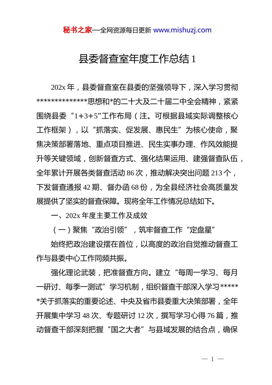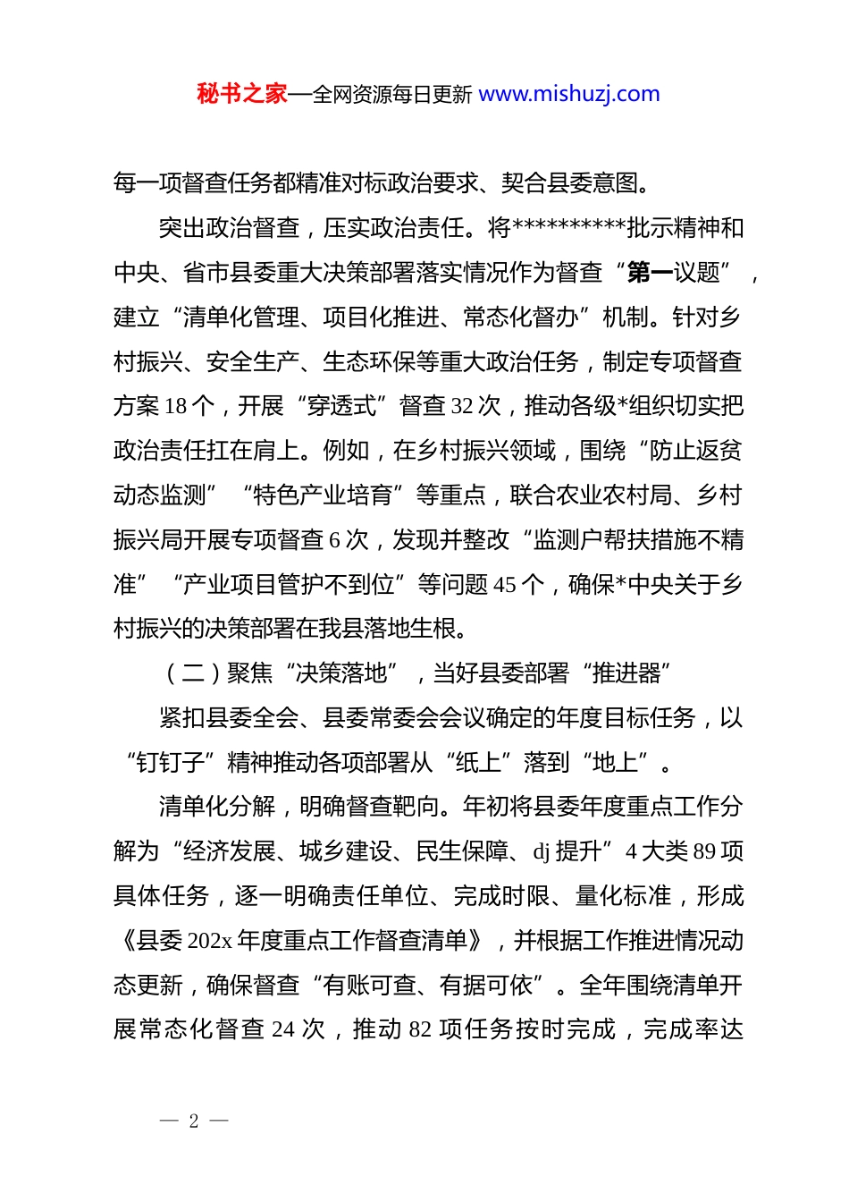 秘书之家—全网资源每日更新 www.mishuzj.com县委督查室年度工作总结 1202x 年,县委督查室在县委的坚强领导下,深入学习贯彻**************思想和*的二十大及二十届二中全会精神,紧紧围绕县委“1+3+5”工作布局(注。可根据县域实际调整核心工作框架),以“抓落实、促发展、惠民生”为核心使命,聚焦决策部署落地、重点项目推进、民生实事办理、作风效能提升等关键领域,创新督查方式、强化结果运用、建强督查队伍,全年累计开展各类督查活动 86 次,推动解决突出问题 213 个,下发督查通报 42 期、督办函 68 份,为全县经济社会高质量发展提供了坚实的督查保障。现将全年工作情况总结如下。一、202x 年度主要工作及成效(一)聚焦“政治引领”,筑牢督查工作“定盘星”始终把政治建设摆在首位,以高度的政治自觉推动督查工作与县委中心工作同频共振。强化理论武装,把准督查方向。建立“每周一学习、每月一研讨、每季一测试”学习机制,组织督查干部深入学习******关于抓落实的重要论述、中央及省市县委重大决策部署,全年开展集中学习 48 次、专题研讨 12 次,撰写学习心得 76 篇,推动督查干部深刻把握“国之大者”与县域发展的结合点,确保— 1 —秘书之家—全网资源每日更新 www.mishuzj.com每一项督查任务都精准对标政治要求、契合县委意图。突出政治督查,压实政治责任。将**********批示精神和中央、省市县委重大决策部署落实情况作为督查“第一议题”,建立“清单化管理、项目化推进、常态化督办”机制。针对乡村振兴、安全生产、生态环保等重大政治任务,制定专项督查方案 18 个,开展“穿透式”督查 32 次,推动各级*组织切实把政治责任扛在肩上。例如,在乡村振兴领域,围绕“防止返贫动态监测”“特色产业培育”等重点,联合农业农村局、乡村振兴局开展专项督查 6 次,发现并整改“监测户帮扶措施不精准”“产业项目管护不到位”等问题 45 个,确保*中央关于乡村振兴的决策部署在我县落地生根。(二)聚焦“决策落地”,当好县委部署“推进器”紧扣县委全会、县委常委会会议确定的年度目标任务,以“钉钉子”精神推动各项部署从“纸上”落到“地上”。清单化分解,明确督查靶向。年初将县委年度重点工作分解为“经济发展、城乡建设、民生保障、dj 提升”4 大类 89 项具体任务,逐一明确责任单位、完成时限、量化标准,形成《县委 202x 年度重点工作督查清单》,并根据工作推进情况动态更新,确保督查“有账可查、有据可依”。全年围绕清单开展常态化督查 24 次,推动 82 项任务按时完成,完成率达— 2 —秘书之家—全网资源每日更新 www.mishuzj.com92.1%。常态化督办,破解落实难题。针对督查中发现的“推进缓慢、落实不力”问题,建立“三色预警”机制(绿色。正常推进;黄色。预警提醒;红色。挂牌督办),对 12 项进展滞后的任务下发红色督办函,约谈责任单位主要负责人 8 人次。例如,针对“xx 产业园区道路配套工程”推进缓慢问题,通过“周调度、月督查、季通报”,推动解决征地拆迁、资金拨付等瓶颈问题 7 个,最终项目提前 1 个月竣工通车,为园区企业物流运输提供了便利。专项化攻坚,攻克重点任务。围绕县委确定的“重大项目攻坚年”“营商环境优化年”等专项行动,组建专项督查组开展集中攻坚。在重大项目攻坚中,对全县 53 个总投资超 200 亿元的重点项目实行“一对一”督查,建立“项目进度台账”,推动解决要素保障问题 38 个,全年重点项目开工率达 94.3%、竣工率达 75.5%,分别较去年提升 5.2 和 8.7 个百分点;在营商环境优化中,聚焦“企业办事难、政策兑现慢”等问题,开展“体验式”督查 12 次,推动政务服务中心压缩审批时限 60%以上,落实惠企政策资金 1.8 亿元,惠及企业 230 余家。(三)聚焦“民生实事”,架起联系群众“连心桥”始终坚持以人民为中心的发展思想,把督查工作的“着力— 3 —秘书之家—全网资源每日更新 www.mishuzj.com点”放在群众关心的“揪心事、烦心事、操心事”上,让督查成果惠及更多群众。紧盯民生项目,推动实事办好。围绕县委承诺...