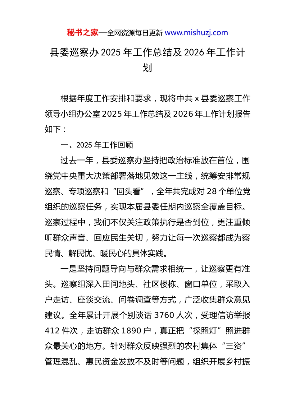 秘书之家—全网资源每日更新 www.mishuzj.com县委巡察办 2025 年工作总结及 2026 年工作计划 根据年度工作安排和要求,现将中共 x 县委巡察工作领导小组办公室 2025 年工作总结及 2026 年工作计划报告如下:一、2025 年工作回顾过去一年,县委巡察办坚持把政治标准放在首位,围绕党中央重大决策部署落地见效这一主线,统筹安排常规巡察、专项巡察和“回头看”,全年共完成对 28 个单位党组织的巡察任务,实现本届县委任期内巡察全覆盖目标。巡察过程中,我们不仅关注政策执行是否到位,更注重倾听群众声音、回应民生关切,努力让每一次巡察都成为察民情、解民忧、暖民心的具体实践。一是坚持问题导向与群众需求相统一,让巡察更有准头。巡察组深入田间地头、社区楼栋、窗口单位,采取入户走访、座谈交流、问卷调查等方式,广泛收集群众意见建议。全年累计开展个别谈话 3760 人次,受理信访举报412 件次,走访群众 1890 户,真正把“探照灯”照进群众最关心的地方。针对群众反映强烈的农村集体“三资”管理混乱、惠民资金发放不及时等问题,组织开展乡村振秘书之家—全网资源每日更新 www.mishuzj.com兴领域不正之风和腐败问题专项巡察,发现并移交问题线索 87 条,推动追缴违规资金 326 万元,惠及群众 1.2 万余人。在某镇村级巡察中,巡察组接到村民反映村道多年未修、出行不便的问题后,立即核实情况并督促镇党委立行立改,仅用 20 天就启动道路硬化工程,赢得群众点赞:“没想到你们来了,路真的修了。”二是坚持实事求是与治病救人相结合,让监督更有温度。我们始终坚持“严管就是厚爱”的理念,对发现的问题既敢于亮剑,也注重教育引导。对于苗头性、倾向性问题,及时通过提醒谈话、反馈建议等方式帮助干部纠正偏差;对于轻微违纪行为,推动所在单位党组织落实主体责任,运用第一种形态处理 136 人次。在某县直单位巡察中,发现一名年轻干部因家庭变故导致工作状态低迷、出现考勤异常的情况后,巡察组没有简单定性为作风问题,而是深入了解其实际困难,并协调单位党组织给予心理疏导和组织关怀,最终该干部重拾信心、积极履职。这种既有力度又有温度的做法,体现了巡察工作的政治属性和人文关怀。三是坚持整改闭环与成果运用相衔接,让成效更加持久。我们建立健全“双反馈、双责任、双公开”机制,即向被巡察单位党组织和分管县级领导同步反馈问题,压实秘书之家—全网资源每日更新 www.mishuzj.com整改主体责任和领导包联责任;整改情况既在单位内部公示,也在一定范围内向社会公开,接受群众监督。2025 年巡察反馈的 1432 个问题,已完成整改 1328 个,整改完成率达 92.7%。同时,注重从体制机制层面查找根源,推动出台《村级“小微权力”清单 30 条》《乡镇财政资金使用管理办法》等制度性文件 23 项,有效堵塞管理漏洞。特别值得一提的是,在对教育系统开展巡察后,针对家长普遍反映的课后服务收费不透明问题,推动主管部门制定统一收费标准和服务规范,实现“阳光收费”,群众满意度显著提升。四是坚持队伍建设与能力提升相促进,让队伍更具战斗力。始终把巡察干部队伍建设作为基础工程来抓,选优配强巡察组长和骨干力量,建立涵盖纪检、组织、审计、财务等领域专业人才库共 186 人。全年举办巡察业务培训班 4 期,参训人员达 520 人次,重点加强党纪法规、群众工作方法、谈话技巧等内容培训。探索实行“老带新”“巡中学”模式,安排新入职干部全程参与巡察实战,在实践中锤炼政治品格和专业能力。同时,严格落实纪律要求,制定《巡察干部行为规范十条》,坚决防止“灯下黑”。广大巡察干部以高度的政治责任感和使命感投身工作,涌现出一批甘于奉献、勇于担当的先进典型,展现了秘书之家—全网资源每日更新 www.mishuzj.com新时代巡察铁军的良好风貌。二、当前存在的主要问题与不足在总结成绩的同时,我们也清醒认识到工作中仍存在一些短板弱项。一是个别单位对巡察整改重视不够,存在“重表态、轻落实”现象,部分问题整改停留在纸面、流于形式。二是巡察与其他监督贯通融合还不够紧密,信息共享、成果互用机制有待...