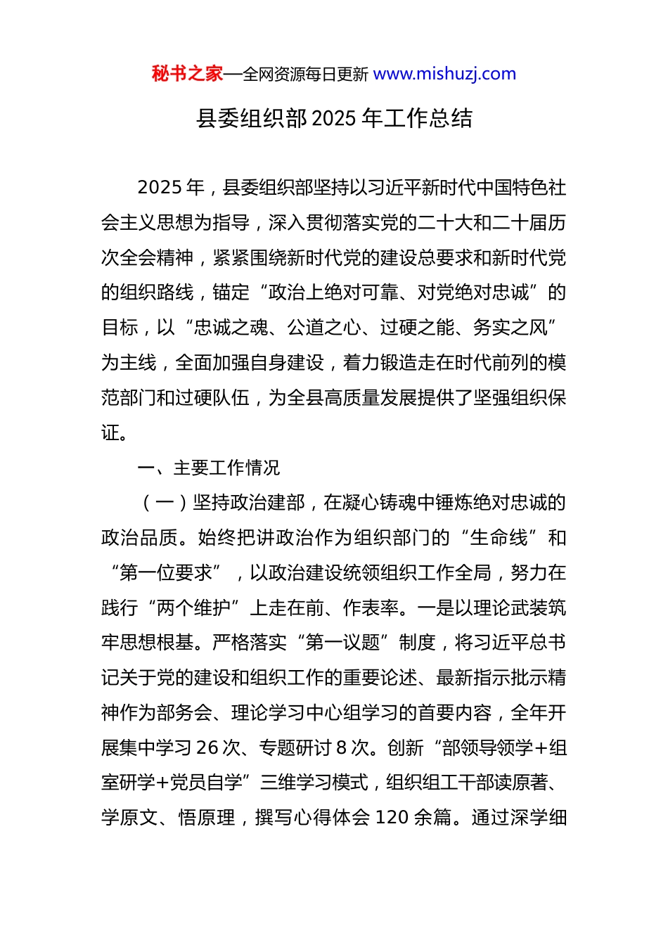 秘书之家—全网资源每日更新 www.mishuzj.com县委组织部 2025 年工作总结 2025 年,县委组织部坚持以习近平新时代中国特色社会主义思想为指导,深入贯彻落实党的二十大和二十届历次全会精神,紧紧围绕新时代党的建设总要求和新时代党的组织路线,锚定“政治上绝对可靠、对党绝对忠诚”的目标,以“忠诚之魂、公道之心、过硬之能、务实之风”为主线,全面加强自身建设,着力锻造走在时代前列的模范部门和过硬队伍,为全县高质量发展提供了坚强组织保证。一、主要工作情况(一)坚持政治建部,在凝心铸魂中锤炼绝对忠诚的政治品质。始终把讲政治作为组织部门的“生命线”和“第一位要求”,以政治建设统领组织工作全局,努力在践行“两个维护”上走在前、作表率。一是以理论武装筑牢思想根基。严格落实“第一议题”制度,将习近平总书记关于党的建设和组织工作的重要论述、最新指示批示精神作为部务会、理论学习中心组学习的首要内容,全年开展集中学习 26 次、专题研讨 8 次。创新“部领导领学+组室研学+党员自学”三维学习模式,组织组工干部读原著、学原文、悟原理,撰写心得体会 120 余篇。通过深学细秘书之家—全网资源每日更新 www.mishuzj.com悟,全体干部进一步坚定了拥护“两个确立”、做到“两个维护”的政治自觉、思想自觉和行动自觉。二是以党性教育淬炼政治本色。坚持把党性修养作为终身必修课,严格执行“三会一课”、主题党日、民主生活会等制度,全年开展主题党日活动 14 次,组织参观*革命纪念馆、*红色教育基地等现场教学 6 次,覆盖党员干部 200 余人次。常态化开展党史学习教育,举办“学党史、悟思想、践初心”专题党课,邀请老党员、老干部讲述革命故事,引导组工干部在红色基因传承中赓续精神血脉。建立“政治体检”机制,每季度组织党员干部对照党章党规找差距、查不足,开展批评与自我批评,确保党性修养在严肃的党内政治生活中持续提升。三是以实践锻炼提升政治能力。树立和践行正确政绩观,引导干部从党的创新理论中找方向、找思路、找方法,聚焦“国之大者”谋划推进工作。围绕乡村振兴、基层治理、项目建设等中心任务,选派 30余名组工干部参与一线调研、专项督查,在服务大局中提升“八项本领”“七种能力”和“七种思维”。建立政治能力“对标提升”清单,将政治判断力、政治领悟力、政治执行力细化为 12 项具体指标,通过“季度评估+年度考核”推动政治能力与岗位职责精准匹配。(二)坚持公道立部,在选贤任能中彰显公平公正的秘书之家—全网资源每日更新 www.mishuzj.com职业操守。始终把公道正派作为组织工作的“立身之本”和“核心理念”,以“一碗水端平”的态度选干部、配班子,让干部群众感受到组织的“温度”与“力度”。一是以鲜明导向选任干部。坚持新时代好干部标准,突出“政治过硬、实绩突出、群众公认”导向,常态化开展领导班子和干部队伍分析研判,全年走访调研乡镇(街道)、县直部门 42 个,与干部谈心谈话 300 余人次。聚焦乡村振兴、项目建设、信访维稳等一线,大力选拔使用“看得出、站得出、豁得出”的干部,全年提拔重用一线干部 38人,占提拔总数的 65%。严格落实“三个区分开来”要求,为在疫情防控、防汛救灾中勇于担当的 2 名干部澄清正名,旗帜鲜明为干事者撑腰、为担当者负责。二是以规范程序守住底线。带头执行《党政领导干部选拔任用工作条例》,严格落实动议、推荐、考察、讨论决定等程序,全年开展干部任前考察 46 批次,查阅档案 180 余份,征求纪检、审计等部门意见 120 人次。建立“双人双锁”保密制度,坚决抵制“探消息、泄机密、敲边鼓”等不正之风,对“说情打招呼”行为记录在案、严肃追责。推行干部选任“阳光工程”,通过公示栏、政府网站等渠道公开选拔程序、任职条件,主动接受社会监督,全年未发生因程序不规范引发的信访问题。三是以品德修养涵养情怀。秘书之家—全网资源每日更新 www.mishuzj.com坚持“把岗位当平台、把事业当追求”,开展“弘扬组工精神、争做时代先锋”主题活动,引导干部看重事业、看轻得失、看淡名利。组织学习全国优秀组织工作干部先进...