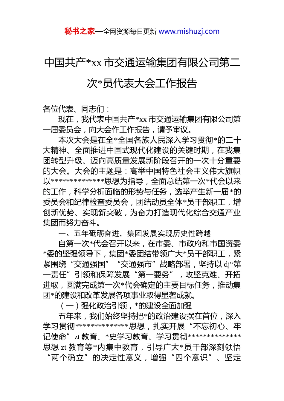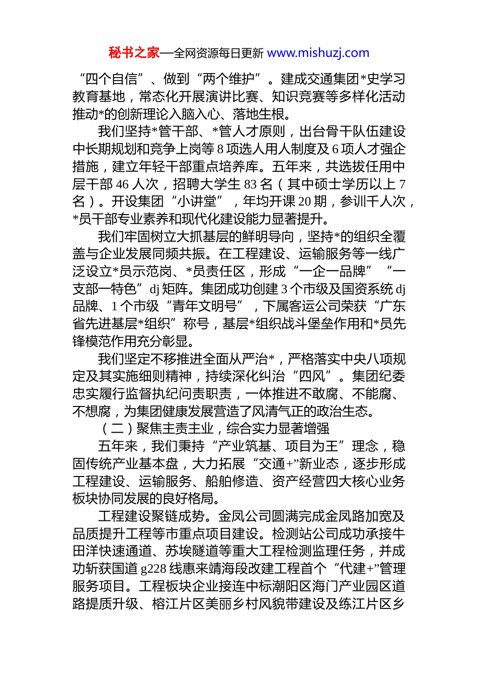 秘书之家—全网资源每日更新 www.mishuzj.com中国共产*xx 市交通运输集团有限公司第二次*员代表大会工作报告各位代表、同志们:现在,我代表中国共产*xx 市交通运输集团有限公司第一届委员会,向大会作工作报告,请予审议。本次大会是在全*全国各族人民深入学习贯彻*的二十大精神、全面推进中国式现代化建设的关键时期,在我集团转型升级、迈向高质量发展新阶段召开的一次十分重要的大会。大会的主题是:高举中国特色社会主义伟大旗帜以**************思想为指导,全面总结第一次*代会以来的工作,科学分析面临的形势与任务,选举产生新一届*的委员会和纪律检查委员会,团结动员全体*员干部职工,增创新优势、实现新突破,为奋力打造现代化综合交通产业集团而努力奋斗。一、五年砥砺奋进,集团发展实现历史性跨越自第一次*代会召开以来,在市委、市政府和市国资委*委的坚强领导下,集团*委团结带领广大*员干部职工,紧紧围绕“交通强国”“交通强市”战略部署,坚持以 dj“第一责任”引领和保障发展“第一要务”,攻坚克难、开拓进取,圆满完成第一次*代会确定的主要目标任务,推动集团*的建设和改革发展各项事业取得显著成就。(一)强化政治引领,*的建设全面加强五年来,我们始终坚持把*的政治建设摆在首位,深入学习贯彻**************思想,扎实开展“不忘初心、牢记使命”zt 教育、*史学习教育、学习贯彻**************思想 zt 教育等*内集中教育,引导广大*员干部深刻领悟“两个确立”的决定性意义,增强“四个意识”、坚定秘书之家—全网资源每日更新 www.mishuzj.com“四个自信”、做到“两个维护”。建成交通集团*史学习教育基地,常态化开展演讲比赛、知识竞赛等多样化活动推动*的创新理论入脑入心、落地生根。我们坚持*管干部、*管人才原则,出台骨干队伍建设中长期规划和竞争上岗等 8 项选人用人制度及 6 项人才强企措施,建立年轻干部重点培养库。五年来,共选拔任用中层干部 46 人次,招聘大学生 83 名(其中硕士学历以上 7名)。开设集团“小讲堂”,年均开课 20 期,参训千人次,*员干部专业素养和现代化建设能力显著提升。我们牢固树立大抓基层的鲜明导向,坚持*的组织全覆盖与企业发展同频共振。在工程建设、运输服务等一线广泛设立*员示范岗、*员责任区,形成“一企一品牌”“一支部一特色”dj 矩阵。集团成功创建 3 个市级及国资系统 dj品牌、1 个市级“青年文明号”,下属客运公司荣获“广东省先进基层*组织”称号,基层*组织战斗堡垒作用和*员先锋模范作用充分彰显。我们坚定不移推进全面从严治*,严格落实中央八项规定及其实施细则精神,持续深化纠治“四风”。集团纪委忠实履行监督执纪问责职责,一体推进不敢腐、不能腐、不想腐,为集团健康发展营造了风清气正的政治生态。(二)聚焦主责主业,综合实力显著增强五年来,我们秉持“产业筑基、项目为王”理念,稳固传统产业基本盘,大力拓展“交通+”新业态,逐步形成工程建设、运输服务、船舶修造、资产经营四大核心业务板块协同发展的良好格局。工程建设聚链成势。金凤公司圆满完成金凤路加宽及品质提升工程等市重点项目建设。检测站公司成功承接牛田洋快速通道、苏埃隧道等重大工程检测监理任务,并成功斩获国道 g228 线惠来靖海段改建工程首个“代建+”管理服务项目。工程板块企业接连中标潮阳区海门产业园区道路提质升级、榕江片区美丽乡村风貌带建设及练江片区乡秘书之家—全网资源每日更新 www.mishuzj.com村振兴示范带市政化配套等重点工程。五年间,工程建设板块累计实现营收超 xx 亿元,行业标杆地位日益巩固,品牌影响力持续提升。运输服务提质增效。面对疫情冲击和市场需求变化,我们主动求变,优化线路布局,提升服务品质。下属客运公司在疫情防控关键时期,发扬抗疫先锋精神,调动应急运力近 150 车次,安全转运防疫人员和物资,展现了“交通铁军”的过硬作风。创新推出“轮渡 1 元+”文旅航班,以“单程 1 元”普惠定价为基础,叠加个性化服务、打卡装置、语音讲解等增值内容,实现“低价惠民+品质升级”双重覆盖,五年累计服务乘客 1000 多万人次,...