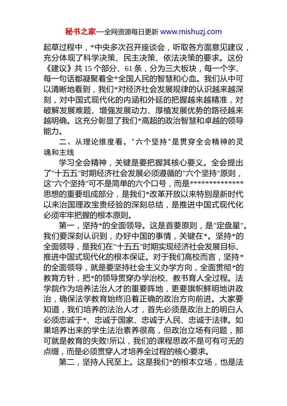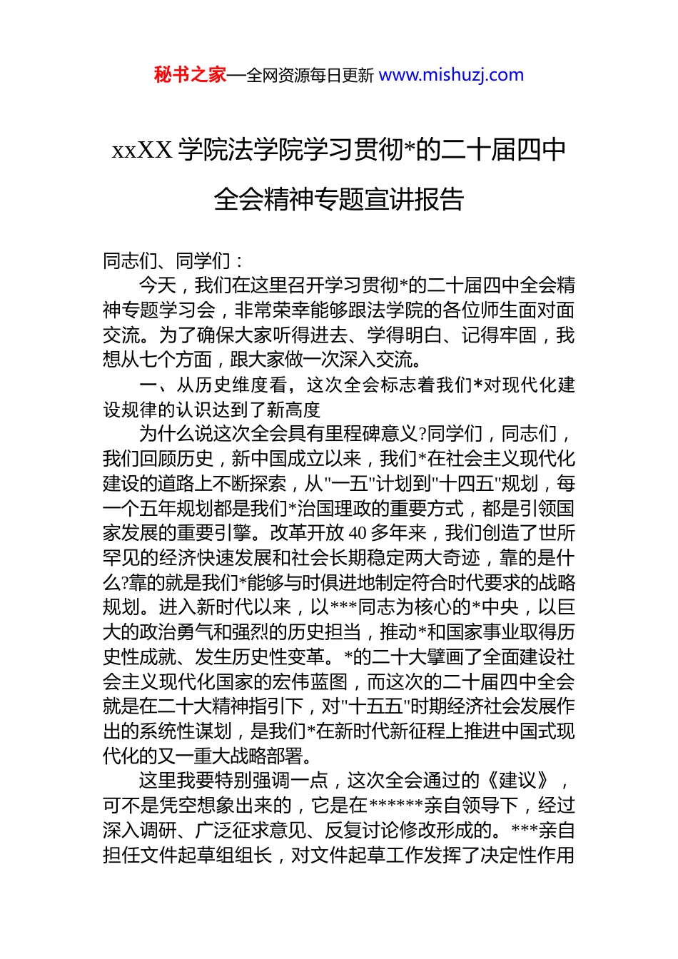 秘书之家—全网资源每日更新 www.mishuzj.comxxXX 学院法学院学习贯彻*的二十届四中全会精神专题宣讲报告同志们、同学们:今天,我们在这里召开学习贯彻*的二十届四中全会精神专题学习会,非常荣幸能够跟法学院的各位师生面对面交流。为了确保大家听得进去、学得明白、记得牢固,我想从七个方面,跟大家做一次深入交流。一、从历史维度看,这次全会标志着我们*对现代化建设规律的认识达到了新高度为什么说这次全会具有里程碑意义?同学们,同志们,我们回顾历史,新中国成立以来,我们*在社会主义现代化建设的道路上不断探索,从"一五"计划到"十四五"规划,每一个五年规划都是我们*治国理政的重要方式,都是引领国家发展的重要引擎。改革开放 40 多年来,我们创造了世所罕见的经济快速发展和社会长期稳定两大奇迹,靠的是什么?靠的就是我们*能够与时俱进地制定符合时代要求的战略规划。进入新时代以来,以***同志为核心的*中央,以巨大的政治勇气和强烈的历史担当,推动*和国家事业取得历史性成就、发生历史性变革。*的二十大擘画了全面建设社会主义现代化国家的宏伟蓝图,而这次的二十届四中全会就是在二十大精神指引下,对"十五五"时期经济社会发展作出的系统性谋划,是我们*在新时代新征程上推进中国式现代化的又一重大战略部署。这里我要特别强调一点,这次全会通过的《建议》,可不是凭空想象出来的,它是在******亲自领导下,经过深入调研、广泛征求意见、反复讨论修改形成的。***亲自担任文件起草组组长,对文件起草工作发挥了决定性作用秘书之家—全网资源每日更新 www.mishuzj.com起草过程中,*中央多次召开座谈会,听取各方面意见建议,充分体现了科学决策、民主决策、依法决策的要求。这份《建议》共 15 个部分、61 条,分为三大板块,每一个字、每一句话都凝聚着全*全国人民的智慧和心血。我们从中可以清晰地看到,我们*对经济社会发展规律的认识越来越深刻,对中国式现代化的内涵和外延的把握越来越精准,对破解发展难题、增强发展动力、厚植发展优势的路径越来越明确。这充分彰显了我们*高超的政治智慧和卓越的领导能力。二、从理论维度看,"六个坚持"是贯穿全会精神的灵魂和主线学习全会精神,关键是要把握其核心要义。全会提出了"十五五"时期经济社会发展必须遵循的"六个坚持"原则,这"六个坚持"可不是简单的六个口号,而是**************思想的重要组成部分,是我们*改革开放以来特别是新时代以来治国理政宝贵经验的深刻总结,是推进中国式现代化必须牢牢把握的根本原则。第一,坚持*的全面领导。这是首要原则,是"定盘星"。我们要深刻认识到,办好中国的事情,关键在*。坚持*的全面领导,是我们在"十五五"时期实现经济社会发展目标、推进中国式现代化的根本保证。对于我们高校而言,坚持*的全面领导,就是要坚持社会主义办学方向,全面贯彻*的教育方针,把*的领导贯穿办学治校、教书育人全过程。法学院作为培养法治人才的重要阵地,更要旗帜鲜明地讲政治,确保法学教育始终沿着正确的政治方向前进。大家要知道,我们培养的法治人才,首先必须是政治上的明白人必须忠诚于*、忠诚于国家、忠诚于人民、忠诚于法律。如果培养出来的学生法治素养很高,但政治立场有问题,那可就是教育的失败!所以,我们的课程思政不是可有可无的点缀,而是必须贯穿人才培养全过程的核心要求。第二,坚持人民至上。这是我们*的根本立场,也是法秘书之家—全网资源每日更新 www.mishuzj.com治建设的价值追求。******强调,全面依法治国最广泛、最深厚的基础是人民,必须坚持为了人民、依靠人民。"十五五"时期,我们将更加注重保障和改善民生,推动人的全面发展、全体人民共同富裕。法学院师生学习这一原则,就是要始终牢记"人民"二字,我们的法学研究、法律服务、法治实践,都要紧紧围绕人民群众最关心最直接最现实的利益问题。同学们将来无论是当法官、检察官、律师,还是从事其他法律工作,都要把维护人民权益作为根本出发点和落脚点,让人民群众在每一个司法案件中感受到公平正义。这可不是空话,这是我们法律人的天职!第三,坚持高质量发展。这是"十五五"时期的主题。高质量...