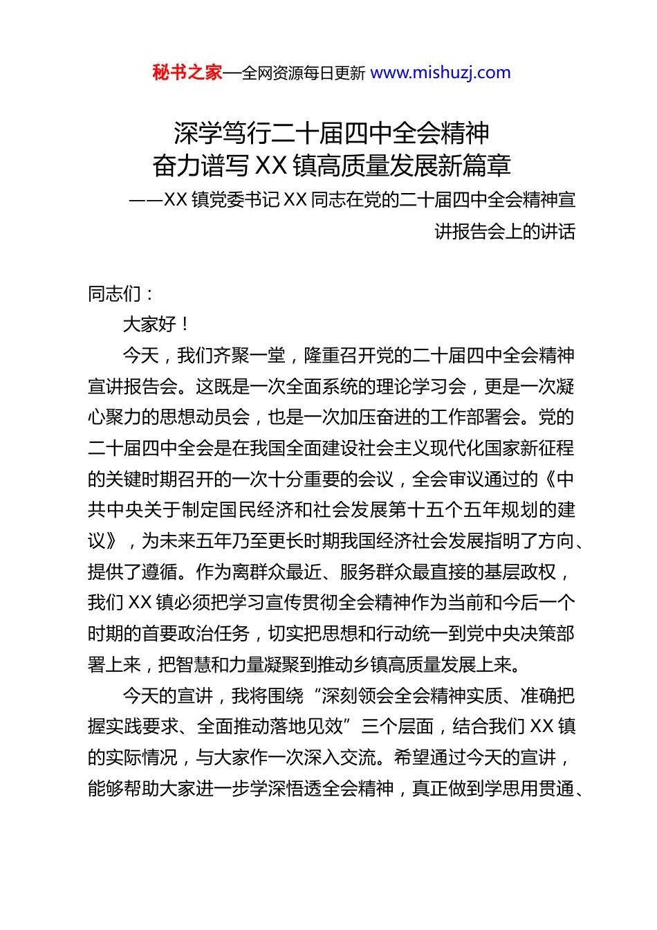 秘书之家—全网资源每日更新 www.mishuzj.com深学笃行二十届四中全会精神奋力谱写 XX 镇高质量发展新篇章——XX 镇党委书记 XX 同志在党的二十届四中全会精神宣讲报告会上的讲话同志们:大家好!今天,我们齐聚一堂,隆重召开党的二十届四中全会精神宣讲报告会。这既是一次全面系统的理论学习会,更是一次凝心聚力的思想动员会,也是一次加压奋进的工作部署会。党的二十届四中全会是在我国全面建设社会主义现代化国家新征程的关键时期召开的一次十分重要的会议,全会审议通过的《中共中央关于制定国民经济和社会发展第十五个五年规划的建议》,为未来五年乃至更长时期我国经济社会发展指明了方向、提供了遵循。作为离群众最近、服务群众最直接的基层政权,我们 XX 镇必须把学习宣传贯彻全会精神作为当前和今后一个时期的首要政治任务,切实把思想和行动统一到党中央决策部署上来,把智慧和力量凝聚到推动乡镇高质量发展上来。今天的宣讲,我将围绕“深刻领会全会精神实质、准确把握实践要求、全面推动落地见效”三个层面,结合我们 XX 镇的实际情况,与大家作一次深入交流。希望通过今天的宣讲,能够帮助大家进一步学深悟透全会精神,真正做到学思用贯通、秘书之家—全网资源每日更新 www.mishuzj.com知信行统一,以更加饱满的热情、更加务实的作风,共同描绘XX 镇现代化建设的新蓝图。一、提高政治站位,深刻认识党的二十届四中全会的重大历史意义党的二十届四中全会于 2025 年 10 月 20 日至 23 日在北京胜利召开,这次会议恰逢“十四五”规划即将圆满收官、“十五五”规划即将开局起步的关键节点,时机特殊、意义重大、影响深远。全会听取和讨论了习近平总书记受中央政治局委托所作的工作报告,审议通过了《中共中央关于制定国民经济和社会发展第十五个五年规划的建议》,习近平总书记就《建议(讨论稿)》向全会作了说明并发表重要讲话。学习贯彻全会精神,首先要从历史和现实、理论和实践、国内和国际的结合上,深刻认识这次全会的重大意义,切实增强学习贯彻的政治自觉、思想自觉和行动自觉。(一)这是一次承前启后的“里程碑”会议,为现代化建设指明方向“十四五”时期,在以习近平同志为核心的党中央坚强领导下,我国经济实力、科技实力、综合国力跃上新台阶,中国式现代化迈出新的坚实步伐,第二个百年奋斗目标新征程实现良好开局。特别是面对错综复杂的国际形势和艰巨繁重的国内改革发展稳定任务,我们经受住了世纪疫情严重冲击等一系列重大风险挑战,推动党和国家事业取得新的重大成就。在这样的秘书之家—全网资源每日更新 www.mishuzj.com背景下,党的二十届四中全会科学谋划“十五五”时期经济社会发展,既是对“十四五”发展成就的充分肯定,更是对未来五年发展的战略擘画。全会明确指出,“十五五”时期是基本实现社会主义现代化夯实基础、全面发力的关键时期,在基本实现社会主义现代化进程中具有承前启后的重要地位。这一判断深刻阐明了“十五五”时期的历史方位,为我们明确了“坐标”和“航向”。对于我们 XX 镇来说,“十五五”时期既是我们补齐发展短板、夯实产业基础的“攻坚期”,也是我们发挥资源优势、实现跨越发展的“黄金期”。我们必须牢牢把握这一历史机遇,顺势而为、乘势而上,努力在现代化建设浪潮中抢占先机、赢得主动。(二)这是一次凝聚共识的“动员会”议,为团结奋斗注入强大动力全会充分肯定了党的二十届三中全会以来中央政治局的工作,一致认为中央政治局认真落实党的二十大和二十届历次全会精神,坚持稳中求进工作总基调,完整准确全面贯彻新发展理念,统筹推进“五位一体”总体布局,协调推进“四个全面”战略布局,推动经济持续回升向好,各项事业取得显著成效。特别是全会隆重纪念中国人民抗日战争暨世界反法西斯战争胜利 80 周年,极大振奋了民族精神、激发了爱国热情、凝聚了奋斗力量。秘书之家—全网资源每日更新 www.mishuzj.com当前,我国发展环境面临深刻复杂变化,处于战略机遇和风险挑战并存、不确定难预料因素增多的时期。但全会明确指出,我国经济基础稳、优势多、韧性强、潜能大,长期向好的...