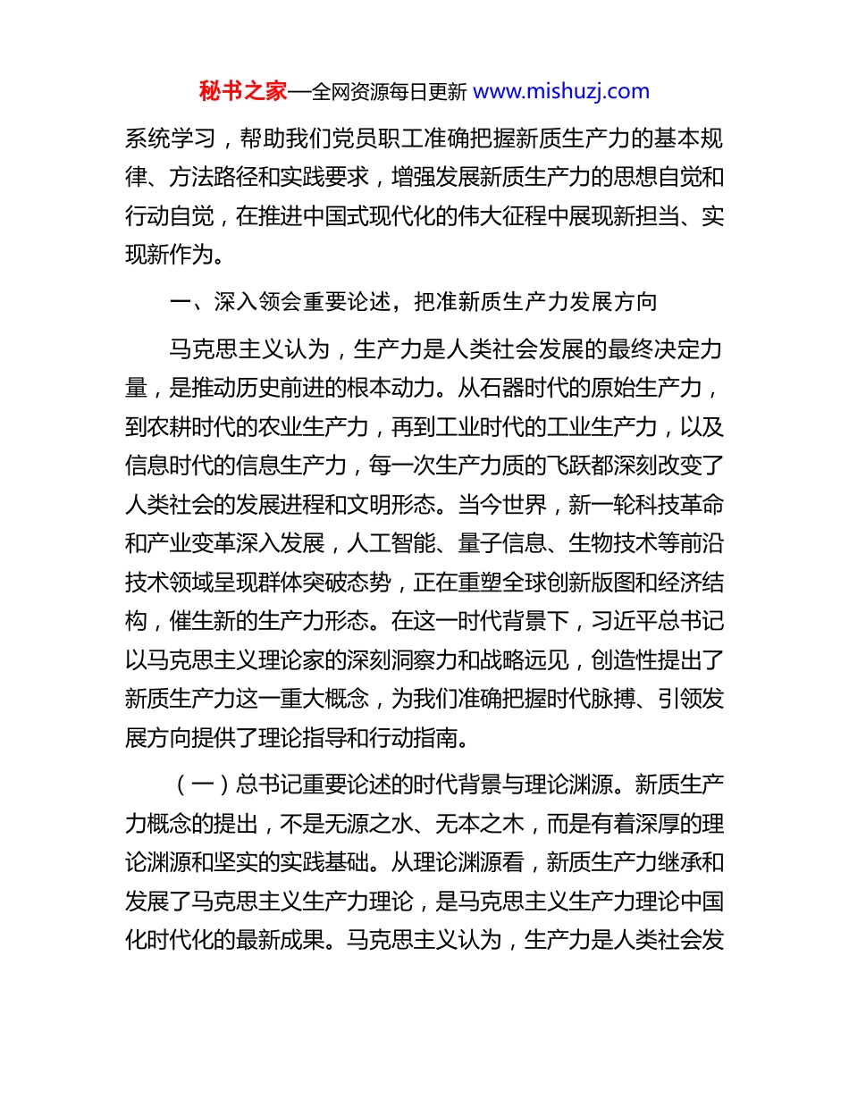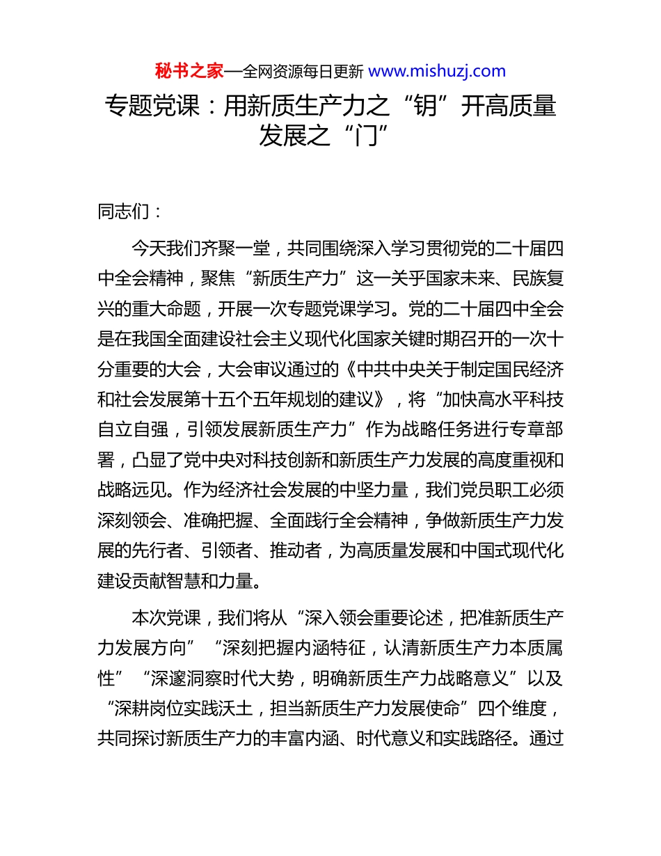秘书之家—全网资源每日更新 www.mishuzj.com专题党课:用新质生产力之“钥”开高质量发展之“门”同志们:今天我们齐聚一堂,共同围绕深入学习贯彻党的二十届四中全会精神,聚焦“新质生产力”这一关乎国家未来、民族复兴的重大命题,开展一次专题党课学习。党的二十届四中全会是在我国全面建设社会主义现代化国家关键时期召开的一次十分重要的大会,大会审议通过的《中共中央关于制定国民经济和社会发展第十五个五年规划的建议》,将“加快高水平科技自立自强,引领发展新质生产力”作为战略任务进行专章部署,凸显了党中央对科技创新和新质生产力发展的高度重视和战略远见。作为经济社会发展的中坚力量,我们党员职工必须深刻领会、准确把握、全面践行全会精神,争做新质生产力发展的先行者、引领者、推动者,为高质量发展和中国式现代化建设贡献智慧和力量。本次党课,我们将从“深入领会重要论述,把准新质生产力发展方向”“深刻把握内涵特征,认清新质生产力本质属性”“深邃洞察时代大势,明确新质生产力战略意义”以及“深耕岗位实践沃土,担当新质生产力发展使命”四个维度,共同探讨新质生产力的丰富内涵、时代意义和实践路径。通过秘书之家—全网资源每日更新 www.mishuzj.com系统学习,帮助我们党员职工准确把握新质生产力的基本规律、方法路径和实践要求,增强发展新质生产力的思想自觉和行动自觉,在推进中国式现代化的伟大征程中展现新担当、实现新作为。一、深入领会重要论述,把准新质生产力发展方向马克思主义认为,生产力是人类社会发展的最终决定力量,是推动历史前进的根本动力。从石器时代的原始生产力,到农耕时代的农业生产力,再到工业时代的工业生产力,以及信息时代的信息生产力,每一次生产力质的飞跃都深刻改变了人类社会的发展进程和文明形态。当今世界,新一轮科技革命和产业变革深入发展,人工智能、量子信息、生物技术等前沿技术领域呈现群体突破态势,正在重塑全球创新版图和经济结构,催生新的生产力形态。在这一时代背景下,习近平总书记以马克思主义理论家的深刻洞察力和战略远见,创造性提出了新质生产力这一重大概念,为我们准确把握时代脉搏、引领发展方向提供了理论指导和行动指南。(一)总书记重要论述的时代背景与理论渊源。新质生产力概念的提出,不是无源之水、无本之木,而是有着深厚的理论渊源和坚实的实践基础。从理论渊源看,新质生产力继承和发展了马克思主义生产力理论,是马克思主义生产力理论中国化时代化的最新成果。马克思主义认为,生产力是人类社会发秘书之家—全网资源每日更新 www.mishuzj.com展的最终决定力量,是生产方式的物质内容,生产关系则是其社会形式。生产力决定生产关系,生产关系反作用于生产力,这是人类社会发展的基本规律。马克思在《资本论》中分析了劳动过程中的简单要素,包括“有目的的活动或劳动本身、劳动对象和劳动资料”,这实质上就是从生产力要素角度对生产过程的解析。习近平总书记提出的新质生产力概念,坚持和继承了马克思主义生产力理论的基本原理,同时结合新时代新征程的新实践新要求,对生产力理论作出了原创性贡献。从实践基础看,新质生产力概念的提出,建立在对国内外发展环境和发展阶段的深刻洞察之上。从国际看,当今世界正经历百年未有之大变局,新一轮科技革命和产业变革深入发展,国际力量对比深刻调整,全球科技竞争空前激烈。科技创新成为国际战略博弈的主要战场,围绕科技制高点的竞争日趋白热化。从国内看,我国已进入高质量发展阶段,经济发展从高速增长转向中高速增长,传统动力减弱,资源环境约束趋紧,需要新的动力引擎推动经济持续健康发展。同时,我国科技发展取得历史性成就,国家综合创新能力从 2020 年的第 14 位提升至2024 年的第 10 位,具备了引领新质生产力发展的基础和条件。基于这样的国内外形势,习近平总书记审时度势,提出新质生产力这一重大概念,为我国抢占未来发展制高点、塑造国际竞争新优势指明了方向。(二)新质生产力概念的提出与发展脉络。新质生产力这秘书之家—全网资源每日更新 www.mishuzj.com一重大概念的提出和发展,经历...