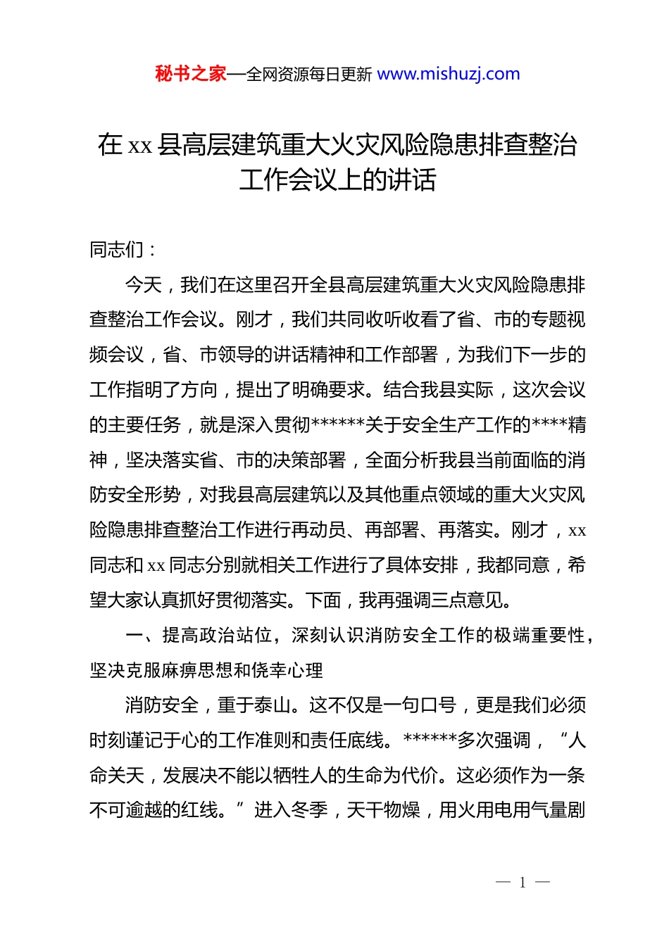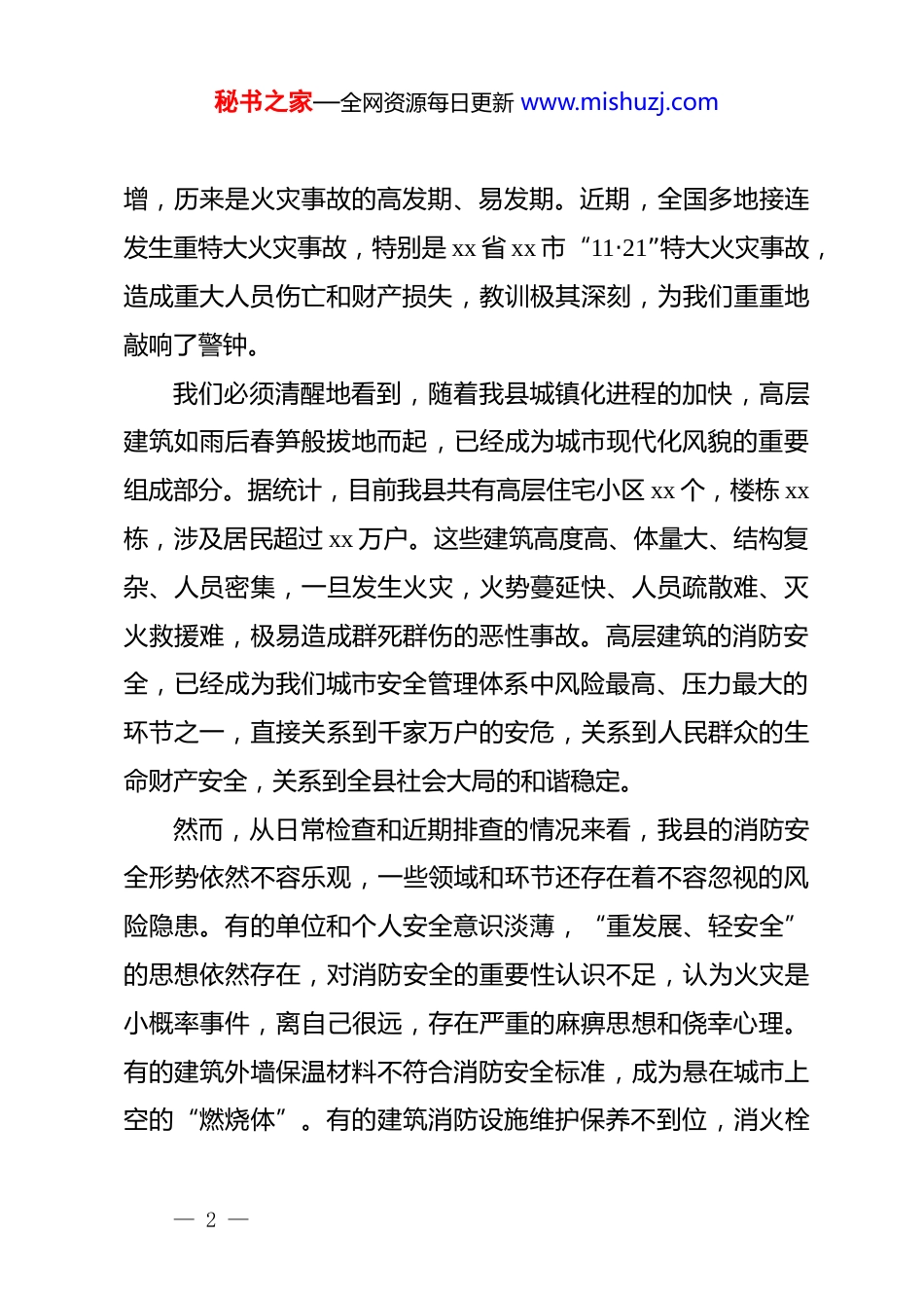 秘书之家—全网资源每日更新 www.mishuzj.com在 xx 县高层建筑重大火灾风险隐患排查整治工作会议上的讲话同志们:今天,我们在这里召开全县高层建筑重大火灾风险隐患排查整治工作会议。刚才,我们共同收听收看了省、市的专题视频会议,省、市领导的讲话精神和工作部署,为我们下一步的工作指明了方向,提出了明确要求。结合我县实际,这次会议的主要任务,就是深入贯彻******关于安全生产工作的****精神,坚决落实省、市的决策部署,全面分析我县当前面临的消防安全形势,对我县高层建筑以及其他重点领域的重大火灾风险隐患排查整治工作进行再动员、再部署、再落实。刚才,xx同志和 xx 同志分别就相关工作进行了具体安排,我都同意,希望大家认真抓好贯彻落实。下面,我再强调三点意见。一、提高政治站位,深刻认识消防安全工作的极端重要性,坚决克服麻痹思想和侥幸心理消防安全,重于泰山。这不仅是一句口号,更是我们必须时刻谨记于心的工作准则和责任底线。******多次强调,“人命关天,发展决不能以牺牲人的生命为代价。这必须作为一条不可逾越的红线。”进入冬季,天干物燥,用火用电用气量剧— 1 —秘书之家—全网资源每日更新 www.mishuzj.com增,历来是火灾事故的高发期、易发期。近期,全国多地接连发生重特大火灾事故,特别是 xx 省 xx 市“11·21”特大火灾事故,造成重大人员伤亡和财产损失,教训极其深刻,为我们重重地敲响了警钟。我们必须清醒地看到,随着我县城镇化进程的加快,高层建筑如雨后春笋般拔地而起,已经成为城市现代化风貌的重要组成部分。据统计,目前我县共有高层住宅小区 xx 个,楼栋 xx栋,涉及居民超过 xx 万户。这些建筑高度高、体量大、结构复杂、人员密集,一旦发生火灾,火势蔓延快、人员疏散难、灭火救援难,极易造成群死群伤的恶性事故。高层建筑的消防安全,已经成为我们城市安全管理体系中风险最高、压力最大的环节之一,直接关系到千家万户的安危,关系到人民群众的生命财产安全,关系到全县社会大局的和谐稳定。然而,从日常检查和近期排查的情况来看,我县的消防安全形势依然不容乐观,一些领域和环节还存在着不容忽视的风险隐患。有的单位和个人安全意识淡薄,“重发展、轻安全”的思想依然存在,对消防安全的重要性认识不足,认为火灾是小概率事件,离自己很远,存在严重的麻痹思想和侥幸心理。有的建筑外墙保温材料不符合消防安全标准,成为悬在城市上空的“燃烧体”。有的建筑消防设施维护保养不到位,消火栓— 2 —秘书之家—全网资源每日更新 www.mishuzj.com无水、喷淋系统瘫痪、火灾报警器失灵的现象时有发生。有的物业服务企业管理缺位,对堵塞、占用消防车通道和疏散楼梯的行为视而不见,对居民在楼道内堆放杂物、电动自行车违规停放充电等“小问题”听之任之,养痈成患。还有的居民安全用火用电常识匮乏,私拉乱接电线、违规使用大功率电器等现象屡禁不止,这些都为火灾事故的发生埋下了巨大的“不定时炸弹”。全县各级各部门必须以案为鉴、警钟长鸣,深刻汲取近期各类火灾事故的惨痛教训,把别人的事故当作自己的事故来对待,把今天排查出的隐患当作明天可能发生的事故来预防。我们必须站在讲政治、保民生、促发展的高度,充分认识到做好当前消防安全工作的极端重要性和现实紧迫性,切实增强责任感、使命感和危机感,坚决把思想和行动统一到*中央、国务院和省委省政府、市委市政府的决策部署上来,以“时时放心不下”的责任感,以对人民群众生命财产安全高度负责的态度,扎扎实实地抓好各项安全防范措施的落实,坚决遏制重特大火灾事故的发生,全力守护人民群众的生命财产安全。二、聚焦关键环节,全面开展隐患排查整治行动,坚决做到“全覆盖、零容忍、严执法”隐患险于明火,防范胜于救灾。开展此次排查整治行动,— 3 —秘书之家—全网资源每日更新 www.mishuzj.com绝不能搞形式、走过场,必须突出重点、精准发力,用最坚决的态度、最严格的标准、最果断的措施,对各类风险隐患进行一次彻底的“大扫除”“大体检”。第一,要突出排查重点,确保不留死角。此次排查整治要以高层建筑为重中之重,...