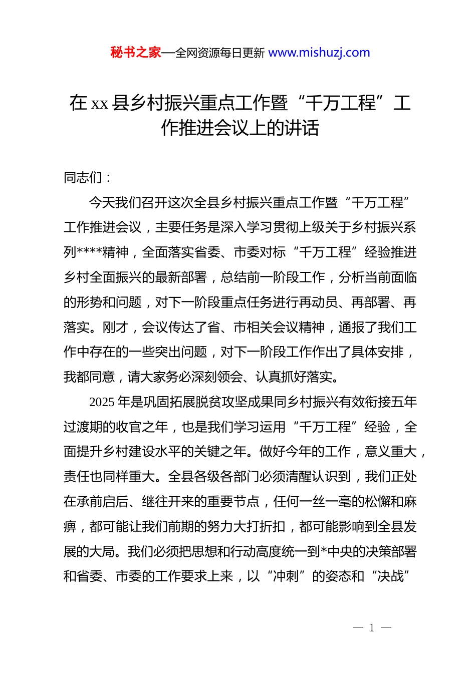 秘书之家—全网资源每日更新 www.mishuzj.com在 xx 县乡村振兴重点工作暨“千万工程”工作推进会议上的讲话同志们:今天我们召开这次全县乡村振兴重点工作暨“千万工程”工作推进会议,主要任务是深入学习贯彻上级关于乡村振兴系列****精神,全面落实省委、市委对标“千万工程”经验推进乡村全面振兴的最新部署,总结前一阶段工作,分析当前面临的形势和问题,对下一阶段重点任务进行再动员、再部署、再落实。刚才,会议传达了省、市相关会议精神,通报了我们工作中存在的一些突出问题,对下一阶段工作作出了具体安排,我都同意,请大家务必深刻领会、认真抓好落实。2025 年是巩固拓展脱贫攻坚成果同乡村振兴有效衔接五年过渡期的收官之年,也是我们学习运用“千万工程”经验,全面提升乡村建设水平的关键之年。做好今年的工作,意义重大,责任也同样重大。全县各级各部门必须清醒认识到,我们正处在承前启后、继往开来的重要节点,任何一丝一毫的松懈和麻痹,都可能让我们前期的努力大打折扣,都可能影响到全县发展的大局。我们必须把思想和行动高度统一到*中央的决策部署和省委、市委的工作要求上来,以“冲刺”的姿态和“决战”— 1 —秘书之家—全网资源每日更新 www.mishuzj.com的决心,全力以赴抓好各项工作,确保交出一份经得起历史和人民检验的合格答卷。下面,我讲三点意见。一、正视成绩与短板,以清醒的认识和高度的自觉扛起历史使命回顾过去的一年,在全县上下的共同努力下,我们紧紧围绕“守底线、抓发展、促振兴”的工作主线,推动巩固拓展脱贫攻坚成果同乡村振兴有效衔接取得了阶段性成效。我们的工作亮点纷呈,成果来之不易。一是脱贫基础持续巩固。我们始终把防止返贫作为首要任务,不断优化动态监测和精准帮扶机制,对全县所有农户进行常态化排查预警,确保问题早发现、早干预、早帮扶。截至目前,全县未发生一例规模性返贫事件,脱贫根基更加稳固。脱贫群众的收入实现了稳步增长。根据最新的统计数据,2023 年,全县脱贫人口人均纯收入达到了 18998 元,较上一年度的 16586元增长了 14.5%,增速喜人。2024 年,这一增长势头得以延续,脱贫人口和监测对象人均纯收入超过了 2 万元大关,这背后是无数干部群众的辛勤付出。二是产业发展提质增效。我们坚持把产业振兴作为重中之重,立足 xx 县的生态资源优势,大力发展以中药材、生态养殖、特色林果为主导的“3+x”现代农业产业体系。我们成功培育了— 2 —秘书之家—全网资源每日更新 www.mishuzj.com一批规模化、标准化的产业基地,引进了数家龙头企业,带动了上千户群众深度融入产业链。全县中药材种植面积稳定在 10万亩以上,生态猪、林下鸡等养殖规模持续扩大,农产品加工转化率稳步提升。我们还积极探索“生态+旅游”“农业+康养”等新业态,乡村旅游接待人次和综合收入均实现两位数增长,产业融合发展的路子越走越宽。三是群众就业渠道更加宽广。我们坚持“输血”与“造血”并重,全面落实各项就业创业扶持政策。通过深化与xx、xx 等地区的劳务协作,2024 年我们实现农村劳动力转移就业超过 4 万人次。同时,我们大力扶持就业帮扶车间、开发公益性岗位,确保了“家门口”就业的稳定性,让一大批弱劳动力、半劳动力实现了就近就地就业增收,真正做到了“一人就业、全家脱贫”。四是乡村面貌焕然一新。我们学习运用“千万工程”经验,扎实推进农村人居环境整治提升行动。2024 年,我们成功创建了 15 个人居环境整治示范村,完成了全县 80%以上村庄的实用性规划编制工作。垃圾分类处理、农村“厕所革命”、污水治理等工作深入推进,村容村貌发生了深刻变化。我们还统筹推进道路、供水、网络等基础设施建设,乡村的承载能力和宜居水平显著提升,群众的获得感和幸福感实实在在。— 3 —秘书之家—全网资源每日更新 www.mishuzj.com在肯定成绩的同时,我们更要清醒地看到工作中存在的短板和弱项。刚才通报的问题,可谓是一针见血、切中要害。比如,一些同志还存在“歇歇脚、松口气”的麻痹思想,工作标准有所降低;部分地区的产业发展还停留在“小、散、弱”的层面,龙头带动效应...