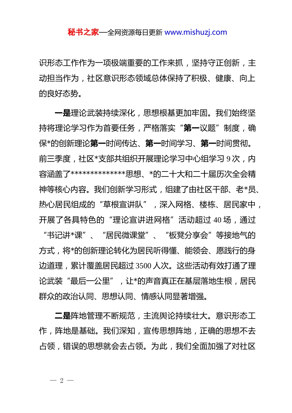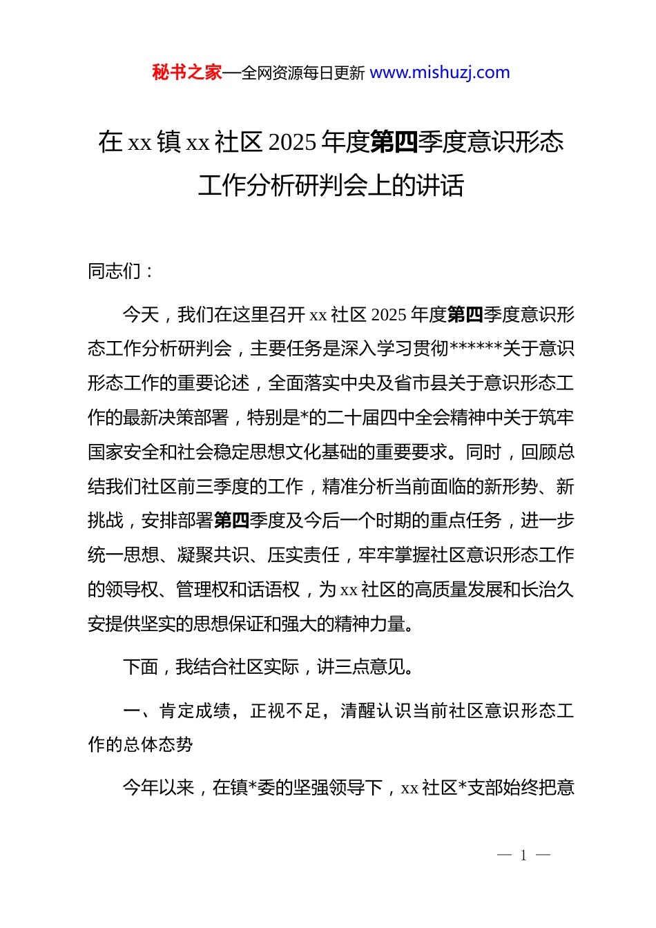 秘书之家—全网资源每日更新 www.mishuzj.com在 xx 镇 xx 社区 2025 年度第四季度意识形态工作分析研判会上的讲话同志们:今天,我们在这里召开 xx 社区 2025 年度第四季度意识形态工作分析研判会,主要任务是深入学习贯彻******关于意识形态工作的重要论述,全面落实中央及省市县关于意识形态工作的最新决策部署,特别是*的二十届四中全会精神中关于筑牢国家安全和社会稳定思想文化基础的重要要求。同时,回顾总结我们社区前三季度的工作,精准分析当前面临的新形势、新挑战,安排部署第四季度及今后一个时期的重点任务,进一步统一思想、凝聚共识、压实责任,牢牢掌握社区意识形态工作的领导权、管理权和话语权,为 xx 社区的高质量发展和长治久安提供坚实的思想保证和强大的精神力量。下面,我结合社区实际,讲三点意见。一、肯定成绩,正视不足,清醒认识当前社区意识形态工作的总体态势今年以来,在镇*委的坚强领导下,xx 社区*支部始终把意— 1 —秘书之家—全网资源每日更新 www.mishuzj.com识形态工作作为一项极端重要的工作来抓,坚持守正创新,主动担当作为,社区意识形态领域总体保持了积极、健康、向上的良好态势。一是理论武装持续深化,思想根基更加牢固。我们始终坚持将理论学习作为首要任务,严格落实“第一议题”制度,确保*的创新理论第一时间传达、第一时间学习、第一时间贯彻。前三季度,社区*支部共组织开展理论学习中心组学习 9 次,内容涵盖了**************思想、*的二十大和二十届历次全会精神等核心内容。我们创新学习形式,组建了由社区干部、老*员、热心居民组成的“草根宣讲队”,深入网格、楼栋、居民家中,开展了各具特色的“理论宣讲进网格”活动超过 40 场,通过“书记讲*课”、“居民微课堂”、“板凳分享会”等接地气的方式,将*的创新理论转化为居民听得懂、能领会、愿践行的身边道理,累计覆盖居民超过 3500 人次。这些活动有效打通了理论武装“最后一公里”,让*的声音真正在基层落地生根,居民群众的政治认同、思想认同、情感认同显著增强。二是阵地管理不断规范,主流舆论持续壮大。意识形态工作,阵地是基础。我们深知,宣传思想阵地,正确的思想不去占领,错误的思想就会去占领。为此,我们全面加强了对社区— 2 —秘书之家—全网资源每日更新 www.mishuzj.com宣传栏、电子显示屏、微信公众号等各类线上线下阵地的管理。我们建立了严格的“三审三校”制度,确保所有发布的内容都导向正确、信息准确、格调健康。社区微信公众号“xx 家园”关注人数稳步增长,前三季度累计发布各类信息 150 余条,内容涵盖政策解读、便民服务、社区动态、先进典型等,阅读总量超过 5 万人次,成为连接社区与居民的重要桥梁和弘扬正能量的主流舆论窗口。通过这些阵地,我们及时传达*和政府的声音,积极回应群众关切,有效引导了社区舆论,营造了风清气正、和谐稳定的社区氛围。三是风险防范精准有效,安全防线更加坚固。面对复杂多变的社会环境,我们始终保持高度的政治警觉,把防范化解意识形态领域风险摆在突出位置。我们建立了常态化的风险排查机制,由社区“两委”班子成员带队,网格员为主力,对辖区内的重点领域、重点人群和重点问题实行每月走访、动态更新风险台账。尤其在重要时间节点,我们提前研判、制定周密的舆情应对预案,做到防患于未然。前三季度,我们成功预警并妥善处置了因老旧小区改造施工扰民、物业管理权纠纷等引发的潜在舆情风险 3 起,通过及时沟通、公开信息、积极化解,避免了矛盾激化和事态扩大,有力维护了社区的和谐稳定。— 3 —秘书之家—全网资源每日更新 www.mishuzj.com在肯定成绩的同时,我们必须清醒地看到,工作中仍然存在一些不容忽视的短板和弱项。主要表现在:第一,理论学习的深度和转化率还有待提升。部分同志的学习还停留在“读过了、听过了”的层面,如何将学习成果内化为坚定的政治信念,外化为服务群众、化解矛盾的实际能力,这方面的转化应用还不够充分。第二,宣传引导的方式方法创新不足。面对居民群众日益多样化、个性化的信息需求,我们现有的宣传手段有时显得较为...