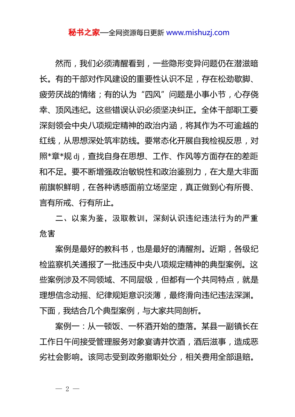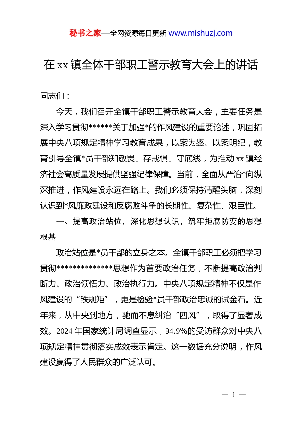 秘书之家—全网资源每日更新 www.mishuzj.com在 xx 镇全体干部职工警示教育大会上的讲话同志们:今天,我们召开全镇干部职工警示教育大会,主要任务是深入学习贯彻******关于加强*的作风建设的重要论述,巩固拓展中央八项规定精神学习教育成果,以案为鉴、以案明纪,教育引导全镇*员干部知敬畏、存戒惧、守底线,为推动 xx 镇经济社会高质量发展提供坚强纪律保障。当前,全面从严治*向纵深推进,作风建设永远在路上。我们必须保持清醒头脑,深刻认识到*风廉政建设和反腐败斗争的长期性、复杂性、艰巨性。一、提高政治站位,深化思想认识,筑牢拒腐防变的思想根基政治站位是*员干部的立身之本。全镇干部职工必须把学习贯彻**************思想作为首要政治任务,不断提高政治判断力、政治领悟力、政治执行力。中央八项规定精神不仅是作风建设的“铁规矩”,更是检验*员干部政治忠诚的试金石。近年来,从中央到地方,驰而不息纠治“四风”,取得了显著成效。2024 年国家统计局调查显示,94.9%的受访群众对中央八项规定精神贯彻落实成效表示肯定。这一数据充分说明,作风建设赢得了人民群众的广泛认可。— 1 —秘书之家—全网资源每日更新 www.mishuzj.com然而,我们必须清醒看到,一些隐形变异问题仍在潜滋暗长。有的干部对作风建设的重要性认识不足,存在松劲歇脚、疲劳厌战的情绪;有的认为“四风”问题是小事小节,心存侥幸、顶风违纪。这些错误认识必须坚决纠正。全体干部职工要深刻领会中央八项规定精神的政治内涵,将其作为不可逾越的红线,从思想深处筑牢防线。要常态化开展自我检视反思,对照*章*规 dj,查找自身在思想、工作、作风等方面存在的差距和不足。要不断增强政治敏锐性和政治鉴别力,在大是大非面前旗帜鲜明,在各种诱惑面前立场坚定,真正做到心有所畏、言有所戒、行有所止。二、以案为鉴,汲取教训,深刻认识违纪违法行为的严重危害案例是最好的教科书,也是最好的清醒剂。近期,各级纪检监察机关通报了一批违反中央八项规定精神的典型案例。这些案例涉及不同领域、不同层级,但都有一个共同特点,就是理想信念动摇、纪律规矩意识淡薄,最终滑向违纪违法深渊。下面,我结合几个典型案例,与大家共同剖析。案例一:从一顿饭、一杯酒开始的堕落。某县一副镇长在工作日午间接受管理服务对象宴请并饮酒,酒后滋事,造成恶劣社会影响。该同志受到政务撤职处分,相关费用全部退赔。— 2 —秘书之家—全网资源每日更新 www.mishuzj.com这个案例警示我们,违规吃喝绝不是小事。一顿饭、一杯酒,看似人之常情,实则背后往往隐藏着利益交换、权力寻租。近年来,违规吃喝问题呈现隐形变异趋势,有的转入私人会所,有的以“工作餐”名义公款报销,有的接受下级单位或管理服务对象安排的宴请。这些行为严重损害*和政府形象,破坏亲清政商关系。全镇*员干部必须牢记,公款姓公,一分一厘都不能乱花;公权为民,一丝一毫都不能私用。案例二:酒驾醉驾背后的纪律问题。某市一名*员干部因醉酒驾驶被公安机关查处,血液酒精含量远超法定标准。该同志不仅受到法律制裁,还被开除*籍、开除公职。数据显示,2022年全国酒后驾驶违规数量达 2143 起。酒驾醉驾不仅是对自身和他人生命安全的极端不负责任,更是对 dj 国法的公然挑衅。特别是*员干部酒驾醉驾,严重败坏*的形象,社会影响极坏。纪检监察机关在查处酒驾醉驾时,还要深挖背后的违规吃喝问题,做到“一案双查”。全镇干部职工必须深刻认识到,酒驾醉驾的代价是惨重的,既要承担法律责任,又要面临 dj 政务处分,政治生命就此终结,家庭幸福毁于一旦。案例三:年轻干部“早节不保”的警示。某市直单位一名85 后干部,利用职务便利,在审核购房资格过程中违规操作,收受他人财物数万元。该同志受到留*察看一年、政务撤职处分。— 3 —秘书之家—全网资源每日更新 www.mishuzj.com这个案例令人痛心。年轻干部本是*和国家事业的接班人,却因一时贪念,在人生起步阶段就栽了跟头。当前,年轻干部群体中出现了一些新情况新问题,有的沉迷网络游戏,有的热衷虚荣攀比,有的利用职权谋取私利。这些问题必须引起高...