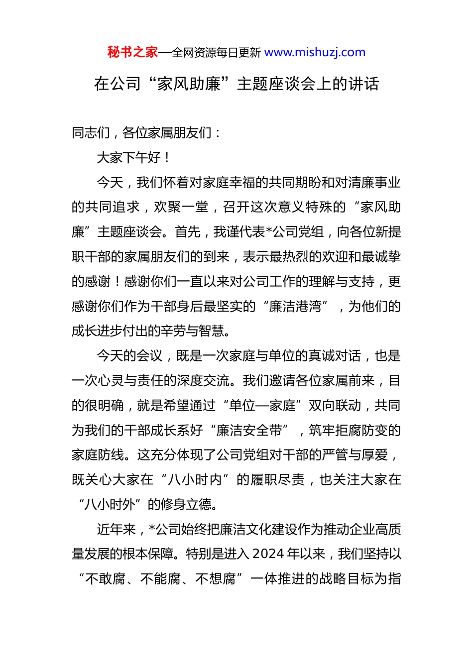 秘书之家—全网资源每日更新 www.mishuzj.com在公司“家风助廉”主题座谈会上的讲话 同志们,各位家属朋友们:大家下午好!今天,我们怀着对家庭幸福的共同期盼和对清廉事业的共同追求,欢聚一堂,召开这次意义特殊的“家风助廉”主题座谈会。首先,我谨代表*公司党组,向各位新提职干部的家属朋友们的到来,表示最热烈的欢迎和最诚挚的感谢!感谢你们一直以来对公司工作的理解与支持,更感谢你们作为干部身后最坚实的“廉洁港湾”,为他们的成长进步付出的辛劳与智慧。今天的会议,既是一次家庭与单位的真诚对话,也是一次心灵与责任的深度交流。我们邀请各位家属前来,目的很明确,就是希望通过“单位—家庭”双向联动,共同为我们的干部成长系好“廉洁安全带”,筑牢拒腐防变的家庭防线。这充分体现了公司党组对干部的严管与厚爱,既关心大家在“八小时内”的履职尽责,也关注大家在“八小时外”的修身立德。近年来,*公司始终把廉洁文化建设作为推动企业高质量发展的根本保障。特别是进入 2024 年以来,我们坚持以“不敢腐、不能腐、不想腐”一体推进的战略目标为指秘书之家—全网资源每日更新 www.mishuzj.com引,创新性地构建并深化了具有*特色的“136”廉洁文化建设工作机制。这个机制的核心,就是以“清风护企、清廉守家”为“1”个中心目标,通过强化“制度约束、文化涵养、家风助廉”等“3”大关键支柱,全面实施“理论武装、警示教育、风险防控、阵地建设、典型选树、监督问责”等“6”项重点任务。这一机制并非纸上谈兵,它已经深度融入我们公司的日常管理和运营血脉之中。例如,我们定期开展反商业贿赂、反贪污等专项培训,2024 年以来,已组织各类廉洁教育培训超过 50 场次,覆盖员工超过5000 人次。我们还通过设立廉洁文化墙、开辟新媒体宣传专栏等方式,让廉洁理念随处可见、深入人心。今天邀请家属参加座谈,正是我们“136”工作机制中“家风助廉”这一关键支柱的深化与落地。我们深知,家庭是社会的细胞,家风是干部作风的源头活水。一个家庭的清廉与否,直接关系到一名干部的成长轨迹,也深刻影响着企业的政治生态和发展前景。同志们,家属朋友们,习近平总书记深刻指出:“家风是社会风气的重要组成部分”,“领导干部的家风,不是个人小事、家庭私事,而是领导干部作风的重要表现”。这一重要论述,为我们抓好家风建设、深化廉洁治家指明了方向。今天,借此机会,我想和大家交流三个方秘书之家—全网资源每日更新 www.mishuzj.com面的期望,与同志们和家属朋友们共勉。一、以纯正家风涵养清廉党风,筑牢廉洁从业的“思想根基”家风正则党风正,家风廉则政风清。家庭是人生的第一个课堂,父母是孩子的第一任老师。一个干部能否做到清正廉洁,其背后往往蕴藏着深厚的家风渊源。回顾历史,从“杨震却金”的“四知”告诫,到“于谦为官”的“两袖清风”,再到老一辈无产阶级革命家为子女立下的严格家规,无不彰显着良好家风对个人品德塑造的决定性力量。对于我们的干部而言,职务的提升意味着责任的加重,也意味着面临更多的考验和诱惑。在这个关键节点,纯正的家风就是抵御歪风邪气的“防火墙”,是防止思想滑坡的“定盘星”。(一)要将理论学习作为家风建设的“必修课”。希望各位干部和家属能共同学习习近平总书记关于家庭家教家风建设的重要论述,深刻领会其精神实质,把家风建设摆在家庭生活的重要位置。要主动学习党纪国法,了解哪些是“高压线”,哪些是“警戒线”,做到知纪、明纪、守纪。公司纪检组会定期通过公众号、家属微信群等渠道,推送廉洁学习资料和警示案例,希望大家能够共同关秘书之家—全网资源每日更新 www.mishuzj.com注、共同学习,让学习成为家庭的一种习惯和风尚。(二)要将红色基因作为家风传承的“营养剂”。今天上午,我们一同参观了*工业史馆,重温了企业艰苦奋斗、锐意进取的峥嵘岁月。这段历史不仅是企业的宝贵财富,更是我们进行家风教育的生动教材。希望大家能将这种艰苦朴素、勤俭节约、爱岗敬业的优良传统带回家中,讲给子女听,融入日常生活中去。要教育家庭成员懂得,我们今天的美好生活来之不易,是无数前辈...
