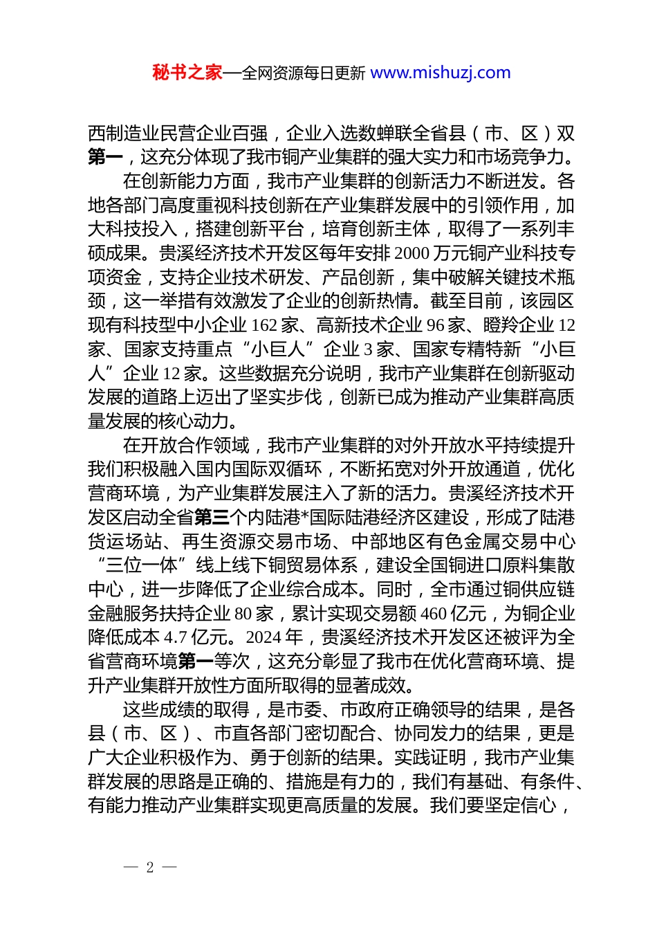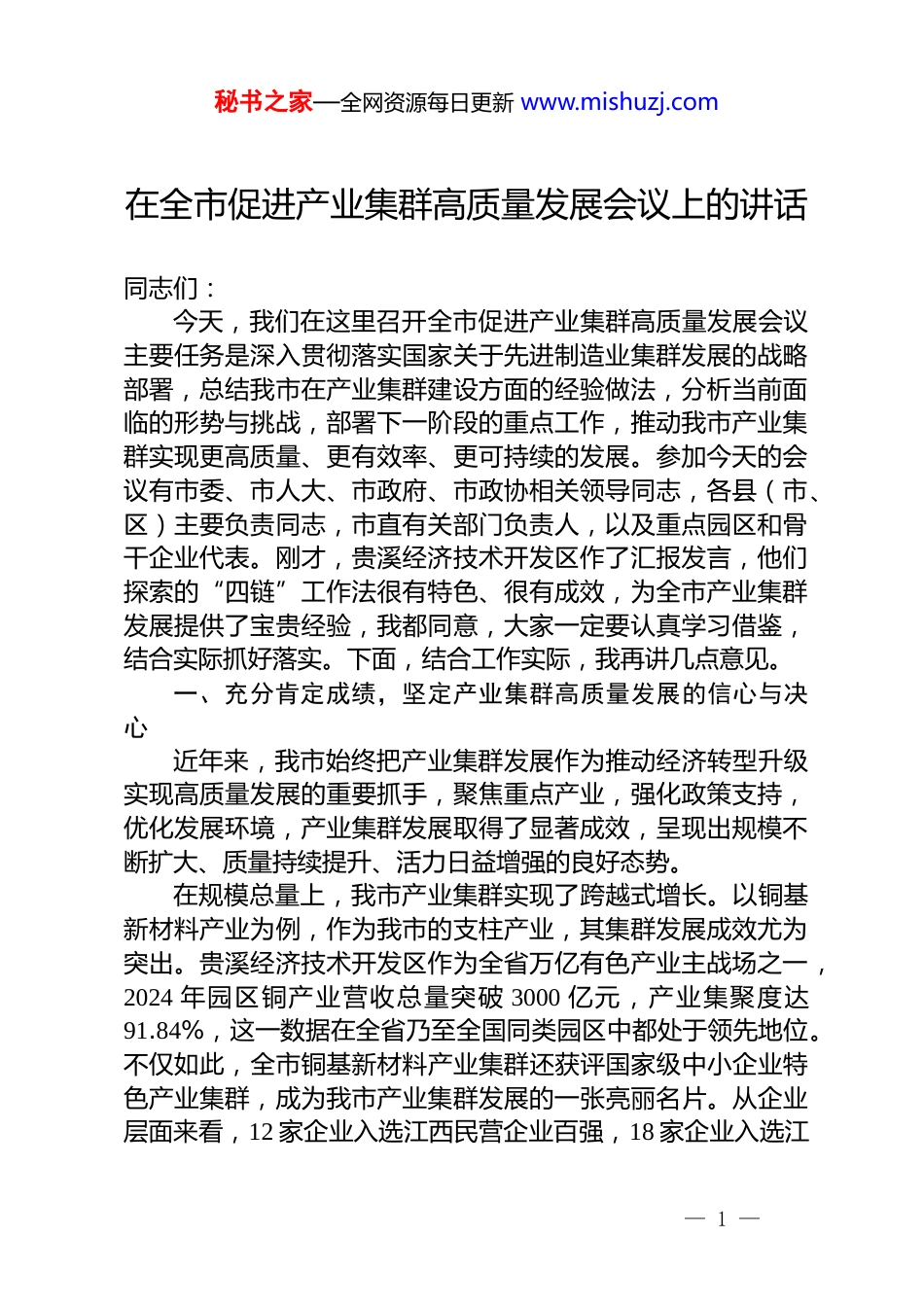 秘书之家—全网资源每日更新 www.mishuzj.com在全市促进产业集群高质量发展会议上的讲话同志们:今天,我们在这里召开全市促进产业集群高质量发展会议主要任务是深入贯彻落实国家关于先进制造业集群发展的战略部署,总结我市在产业集群建设方面的经验做法,分析当前面临的形势与挑战,部署下一阶段的重点工作,推动我市产业集群实现更高质量、更有效率、更可持续的发展。参加今天的会议有市委、市人大、市政府、市政协相关领导同志,各县(市、区)主要负责同志,市直有关部门负责人,以及重点园区和骨干企业代表。刚才,贵溪经济技术开发区作了汇报发言,他们探索的“四链”工作法很有特色、很有成效,为全市产业集群发展提供了宝贵经验,我都同意,大家一定要认真学习借鉴,结合实际抓好落实。下面,结合工作实际,我再讲几点意见。一、充分肯定成绩,坚定产业集群高质量发展的信心与决心近年来,我市始终把产业集群发展作为推动经济转型升级实现高质量发展的重要抓手,聚焦重点产业,强化政策支持,优化发展环境,产业集群发展取得了显著成效,呈现出规模不断扩大、质量持续提升、活力日益增强的良好态势。在规模总量上,我市产业集群实现了跨越式增长。以铜基新材料产业为例,作为我市的支柱产业,其集群发展成效尤为突出。贵溪经济技术开发区作为全省万亿有色产业主战场之一,2024 年园区铜产业营收总量突破 3000 亿元,产业集聚度达91.84%,这一数据在全省乃至全国同类园区中都处于领先地位。不仅如此,全市铜基新材料产业集群还获评国家级中小企业特色产业集群,成为我市产业集群发展的一张亮丽名片。从企业层面来看,12 家企业入选江西民营企业百强,18 家企业入选江— 1 —秘书之家—全网资源每日更新 www.mishuzj.com西制造业民营企业百强,企业入选数蝉联全省县(市、区)双第一,这充分体现了我市铜产业集群的强大实力和市场竞争力。在创新能力方面,我市产业集群的创新活力不断迸发。各地各部门高度重视科技创新在产业集群发展中的引领作用,加大科技投入,搭建创新平台,培育创新主体,取得了一系列丰硕成果。贵溪经济技术开发区每年安排 2000 万元铜产业科技专项资金,支持企业技术研发、产品创新,集中破解关键技术瓶颈,这一举措有效激发了企业的创新热情。截至目前,该园区现有科技型中小企业 162 家、高新技术企业 96 家、瞪羚企业 12家、国家支持重点“小巨人”企业 3 家、国家专精特新“小巨人”企业 12 家。这些数据充分说明,我市产业集群在创新驱动发展的道路上迈出了坚实步伐,创新已成为推动产业集群高质量发展的核心动力。在开放合作领域,我市产业集群的对外开放水平持续提升我们积极融入国内国际双循环,不断拓宽对外开放通道,优化营商环境,为产业集群发展注入了新的活力。贵溪经济技术开发区启动全省第三个内陆港*国际陆港经济区建设,形成了陆港货运场站、再生资源交易市场、中部地区有色金属交易中心“三位一体”线上线下铜贸易体系,建设全国铜进口原料集散中心,进一步降低了企业综合成本。同时,全市通过铜供应链金融服务扶持企业 80 家,累计实现交易额 460 亿元,为铜企业降低成本 4.7 亿元。2024 年,贵溪经济技术开发区还被评为全省营商环境第一等次,这充分彰显了我市在优化营商环境、提升产业集群开放性方面所取得的显著成效。这些成绩的取得,是市委、市政府正确领导的结果,是各县(市、区)、市直各部门密切配合、协同发力的结果,更是广大企业积极作为、勇于创新的结果。实践证明,我市产业集群发展的思路是正确的、措施是有力的,我们有基础、有条件、有能力推动产业集群实现更高质量的发展。我们要坚定信心,— 2 —秘书之家—全网资源每日更新 www.mishuzj.com乘势而上,不断开创我市产业集群高质量发展的新局面。二、正视问题挑战,清醒认识产业集群发展面临的严峻形势在肯定成绩的同时,我们也要清醒地认识到,我市产业集群发展还面临着一些不容忽视的问题和挑战,与先进地区相比还有一定的差距,需要我们高度重视并采取有效措施加以解决。一是产业集群的产业链条仍不够完善。虽然我市部分产业...