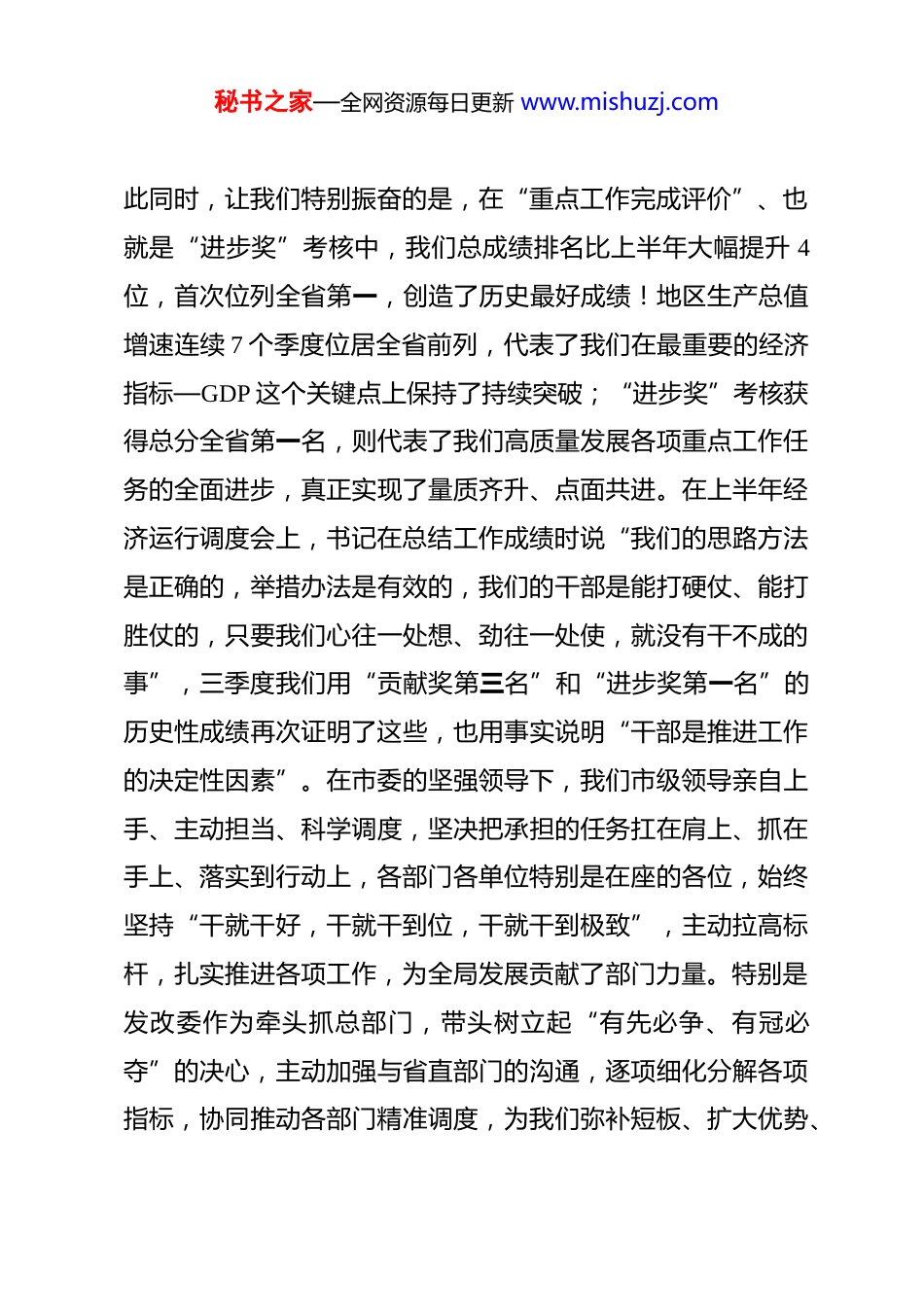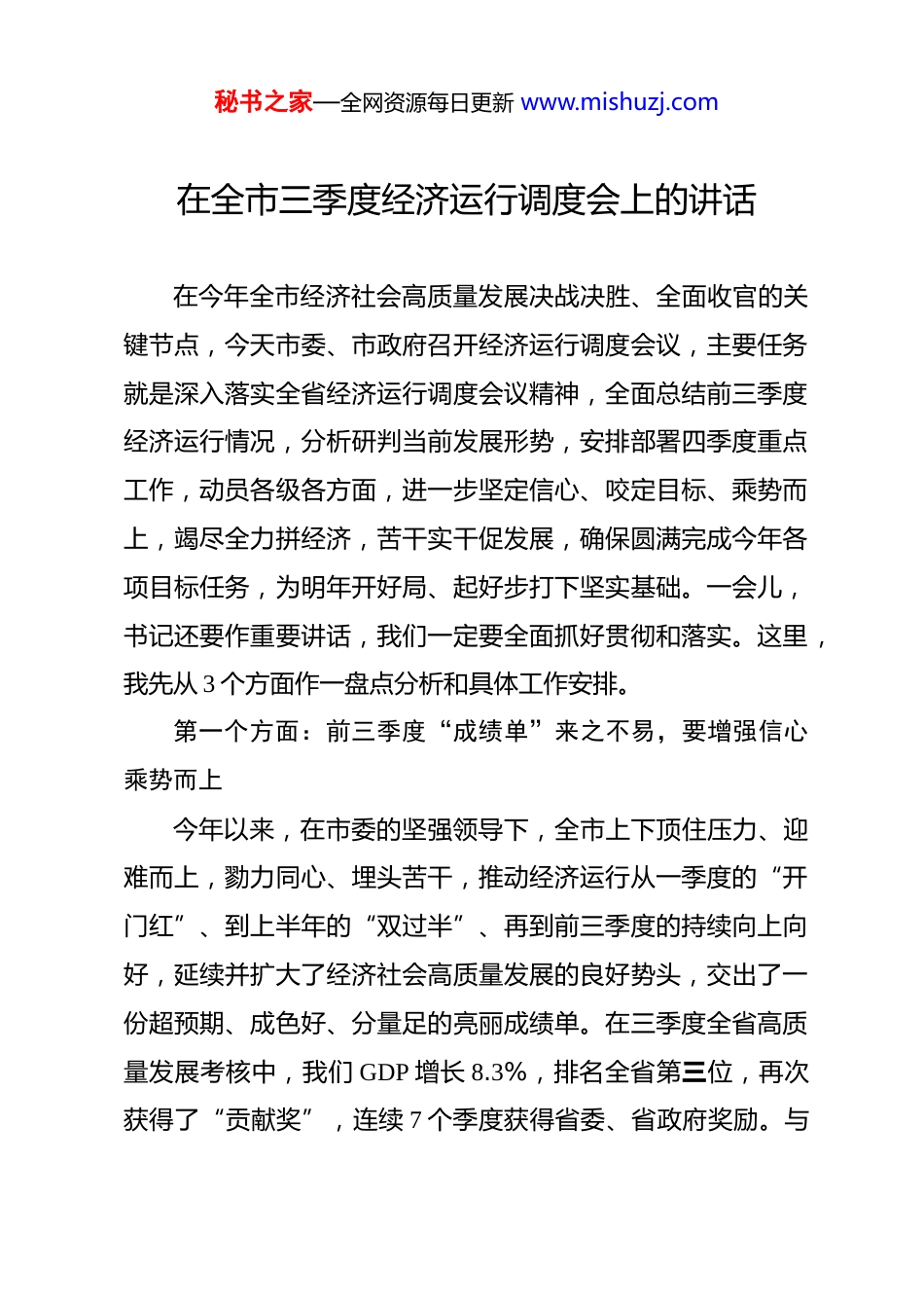 秘书之家—全网资源每日更新 www.mishuzj.com在全市三季度经济运行调度会上的讲话在今年全市经济社会高质量发展决战决胜、全面收官的关键节点,今天市委、市政府召开经济运行调度会议,主要任务就是深入落实全省经济运行调度会议精神,全面总结前三季度经济运行情况,分析研判当前发展形势,安排部署四季度重点工作,动员各级各方面,进一步坚定信心、咬定目标、乘势而上,竭尽全力拼经济,苦干实干促发展,确保圆满完成今年各项目标任务,为明年开好局、起好步打下坚实基础。一会儿,书记还要作重要讲话,我们一定要全面抓好贯彻和落实。这里,我先从 3 个方面作一盘点分析和具体工作安排。第一个方面:前三季度“成绩单”来之不易,要增强信心乘势而上今年以来,在市委的坚强领导下,全市上下顶住压力、迎难而上,勠力同心、埋头苦干,推动经济运行从一季度的“开门红”、到上半年的“双过半”、再到前三季度的持续向上向好,延续并扩大了经济社会高质量发展的良好势头,交出了一份超预期、成色好、分量足的亮丽成绩单。在三季度全省高质量发展考核中,我们 GDP 增长 8.3%,排名全省第三位,再次获得了“贡献奖”,连续 7 个季度获得省委、省政府奖励。与秘书之家—全网资源每日更新 www.mishuzj.com此同时,让我们特别振奋的是,在“重点工作完成评价”、也就是“进步奖”考核中,我们总成绩排名比上半年大幅提升 4位,首次位列全省第一,创造了历史最好成绩!地区生产总值增速连续 7 个季度位居全省前列,代表了我们在最重要的经济指标—GDP 这个关键点上保持了持续突破;“进步奖”考核获得总分全省第一名,则代表了我们高质量发展各项重点工作任务的全面进步,真正实现了量质齐升、点面共进。在上半年经济运行调度会上,书记在总结工作成绩时说“我们的思路方法是正确的,举措办法是有效的,我们的干部是能打硬仗、能打胜仗的,只要我们心往一处想、劲往一处使,就没有干不成的事”,三季度我们用“贡献奖第三名”和“进步奖第一名”的历史性成绩再次证明了这些,也用事实说明“干部是推进工作的决定性因素”。在市委的坚强领导下,我们市级领导亲自上手、主动担当、科学调度,坚决把承担的任务扛在肩上、抓在手上、落实到行动上,各部门各单位特别是在座的各位,始终坚持“干就干好,干就干到位,干就干到极致”,主动拉高标杆,扎实推进各项工作,为全局发展贡献了部门力量。特别是发改委作为牵头抓总部门,带头树立起“有先必争、有冠必夺”的决心,主动加强与省直部门的沟通,逐项细化分解各项指标,协同推动各部门精准调度,为我们弥补短板、扩大优势、秘书之家—全网资源每日更新 www.mishuzj.com取得突破发挥了重要作用。在此,向在座各位的辛勤付出和不懈努力表示衷心的感谢!具体来说,我们三季度工作呈现出“快”“进”“好”三个特点:一是“快”的势头更加明显。年初经济运行调度会上,书记就强调要强化“尽前不尽后、赶早不赶晚”的意识,在经济下行、同期基数高等两难甚至多难的形势下,我们始终保持“不进则退、慢进亦是退”的清醒,精细化管理、精准性调度,推动主要指标承压而上。最核心指标地区生产总值增长 8.3%,高于全国 3.5 个百分点,高于全省 2.3 个百分点,总量达到309.92 亿元,超过去年同期 25.1 亿元,为我们全市经济总量站上新的百亿元台阶奠定了坚实基础。规上工业在钢材价格大幅下滑、市场不景气等不利条件下,工信局精准调度、全力推进,实现了 10%的增长,超出上半年(9.3%)0.7 个百分点,取得了今年以来最好的成绩,增速连续 19 个月保持 9%以上快速增长,充分发挥了工业压舱石、顶梁柱作用。规下工业企业数量少、调度非常困难,但通过工业园区等单位的持续努力,规下工业增加值增速达到了难得的 13.2%,为工业增长发挥了很大的作用。建筑业大幅跃升,在建筑业产值持续回落的不利情况下,住建局精准施策、持续用力,建安投资保持了持续向好的趋势,大幅增长 65.4%,拉动建筑业增加值增长 31%,比去年秘书之家—全网资源每日更新 www.mishuzj.com同期提升 29.5 个百分点(去年三季度 1.5%),创造了近...
