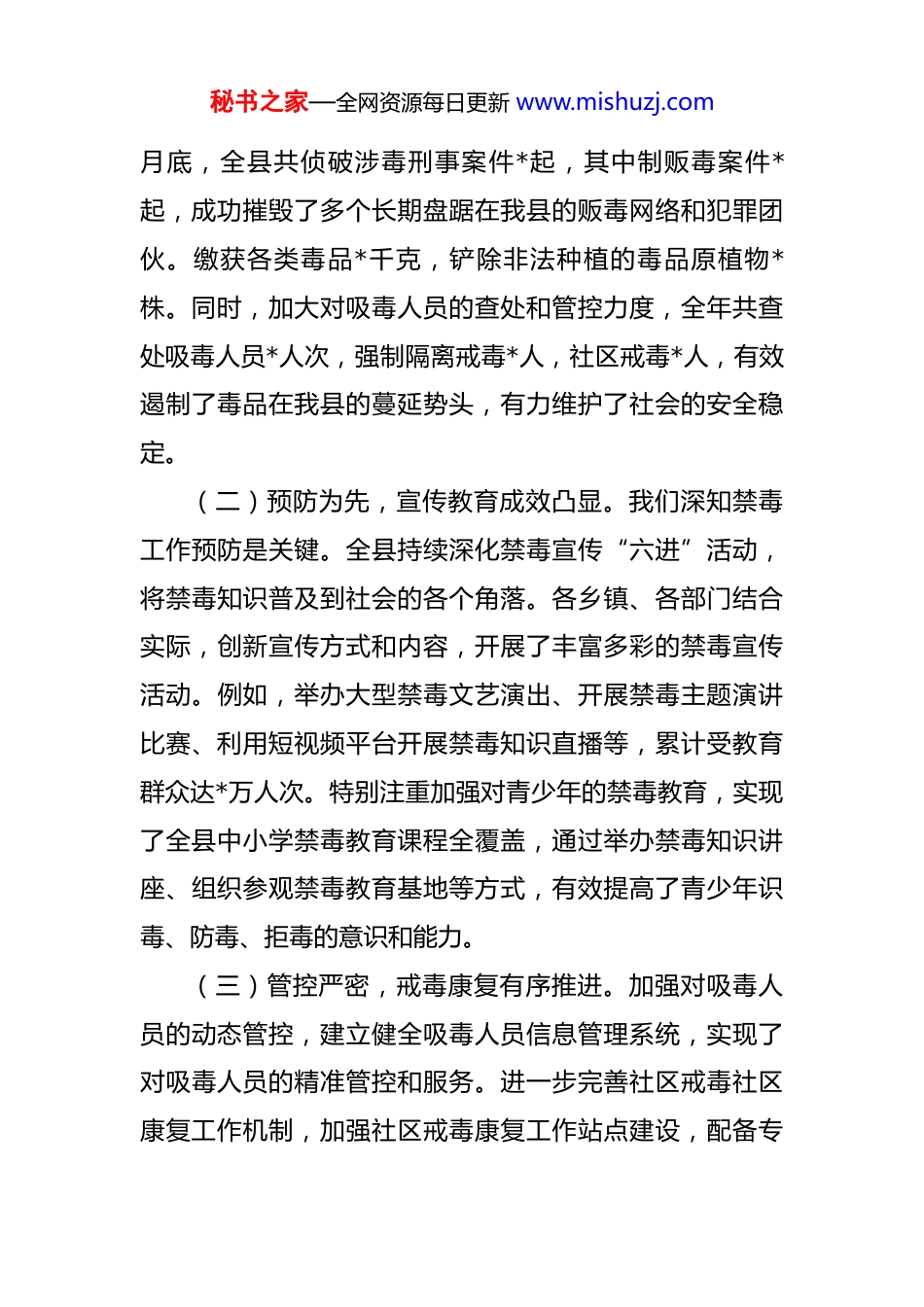 秘书之家—全网资源每日更新 www.mishuzj.com在全县 2025 年禁毒工作会议上的讲话 同志们:今天,我们在这里召开全县 2025 年禁毒工作会议,主要任务是深入贯彻落实省禁毒委相关会议及市禁毒工作最新部署要求,全面总结我县过去一年的禁毒工作,深刻剖析当前面临的复杂毒情形势,精心安排部署下一阶段全县的毒品问题整治工作。刚才,**同志详细通报了我县的禁毒工作情况和毒情形势,分析精准、内容详实,我完全赞同。下面,我讲三点意见。一、总结成绩、剖析问题,强化新时代禁毒工作使命感禁毒工作关乎国家长治久安、民族兴衰存亡、人民幸福安康,是一场必须取得胜利的全民战役。回顾过去的2025 年,在县委的坚强领导下,全县各级各部门,尤其是奋战在禁毒一线的公安干警和禁毒工作者们,以高度的政治责任感和强烈的担当精神,积极履职、奋勇攻坚,推动我县禁毒工作取得了新的阶段性成果。(一)打击有力,整治效能显著提升。全县始终保持对毒品犯罪“零容忍”的高压态势,深入开展“清源断流”“净边行动”等系列专项打击行动。截至 2025 年 11秘书之家—全网资源每日更新 www.mishuzj.com月底,全县共侦破涉毒刑事案件*起,其中制贩毒案件*起,成功摧毁了多个长期盘踞在我县的贩毒网络和犯罪团伙。缴获各类毒品*千克,铲除非法种植的毒品原植物*株。同时,加大对吸毒人员的查处和管控力度,全年共查处吸毒人员*人次,强制隔离戒毒*人,社区戒毒*人,有效遏制了毒品在我县的蔓延势头,有力维护了社会的安全稳定。(二)预防为先,宣传教育成效凸显。我们深知禁毒工作预防是关键。全县持续深化禁毒宣传“六进”活动,将禁毒知识普及到社会的各个角落。各乡镇、各部门结合实际,创新宣传方式和内容,开展了丰富多彩的禁毒宣传活动。例如,举办大型禁毒文艺演出、开展禁毒主题演讲比赛、利用短视频平台开展禁毒知识直播等,累计受教育群众达*万人次。特别注重加强对青少年的禁毒教育,实现了全县中小学禁毒教育课程全覆盖,通过举办禁毒知识讲座、组织参观禁毒教育基地等方式,有效提高了青少年识毒、防毒、拒毒的意识和能力。(三)管控严密,戒毒康复有序推进。加强对吸毒人员的动态管控,建立健全吸毒人员信息管理系统,实现了对吸毒人员的精准管控和服务。进一步完善社区戒毒社区康复工作机制,加强社区戒毒康复工作站点建设,配备专秘书之家—全网资源每日更新 www.mishuzj.com业的工作人员和志愿者,为吸毒人员提供心理辅导、就业培训、生活救助等全方位的服务。全年社区戒毒社区康复执行率达到*%,戒毒康复人员的复吸率明显下降,重新回归社会的比例显著提高。(四)协作紧密,部门联动形成合力。全县各级各部门牢固树立“一盘棋”思想,加强协作配合,形成了禁毒工作的强大合力。公安、检察、法院等司法部门密切配合,依法严厉打击毒品犯罪,提高了办案效率和质量。民政、人社、卫健等部门积极参与戒毒康复人员的帮扶救助工作,为他们解决实际困难。宣传、教育、文化等部门广泛开展禁毒宣传教育活动,营造了浓厚的禁毒氛围。同时,加强与周边地区的禁毒协作,建立了信息共享、联合执法等工作机制,共同打击跨区域毒品犯罪活动。在肯定成绩的同时,我们也要清醒地认识到,当前我县禁毒工作仍然面临着严峻的挑战。一是毒品犯罪形势依然复杂严峻,新型毒品不断出现,犯罪手段更加隐蔽,打击难度不断加大。二是毒品预防教育还存在薄弱环节,部分群众尤其是青少年对新型毒品的认识不足,防范意识不强。三是吸毒人员管控和戒毒康复工作还需要进一步加强,部分吸毒人员复吸率仍然较高,回归社会面临诸多困难。四是禁毒工作保障还不够有力,禁毒专业队伍建设、秘书之家—全网资源每日更新 www.mishuzj.com经费投入等方面还存在一定的差距。这些问题严重制约了我县禁毒工作的深入开展,必须引起我们的高度重视,采取有效措施加以解决。二、明确目标、突出重点,推动新时代禁毒工作新突破2026 年是全面贯彻落实党的二十大精神的关键一年,也是我县禁毒工作深入推进的重要一年。我们要以习近平新时代中国特色社会主义思想为指导,深入贯彻落实党中央关于禁毒工作的决策部...