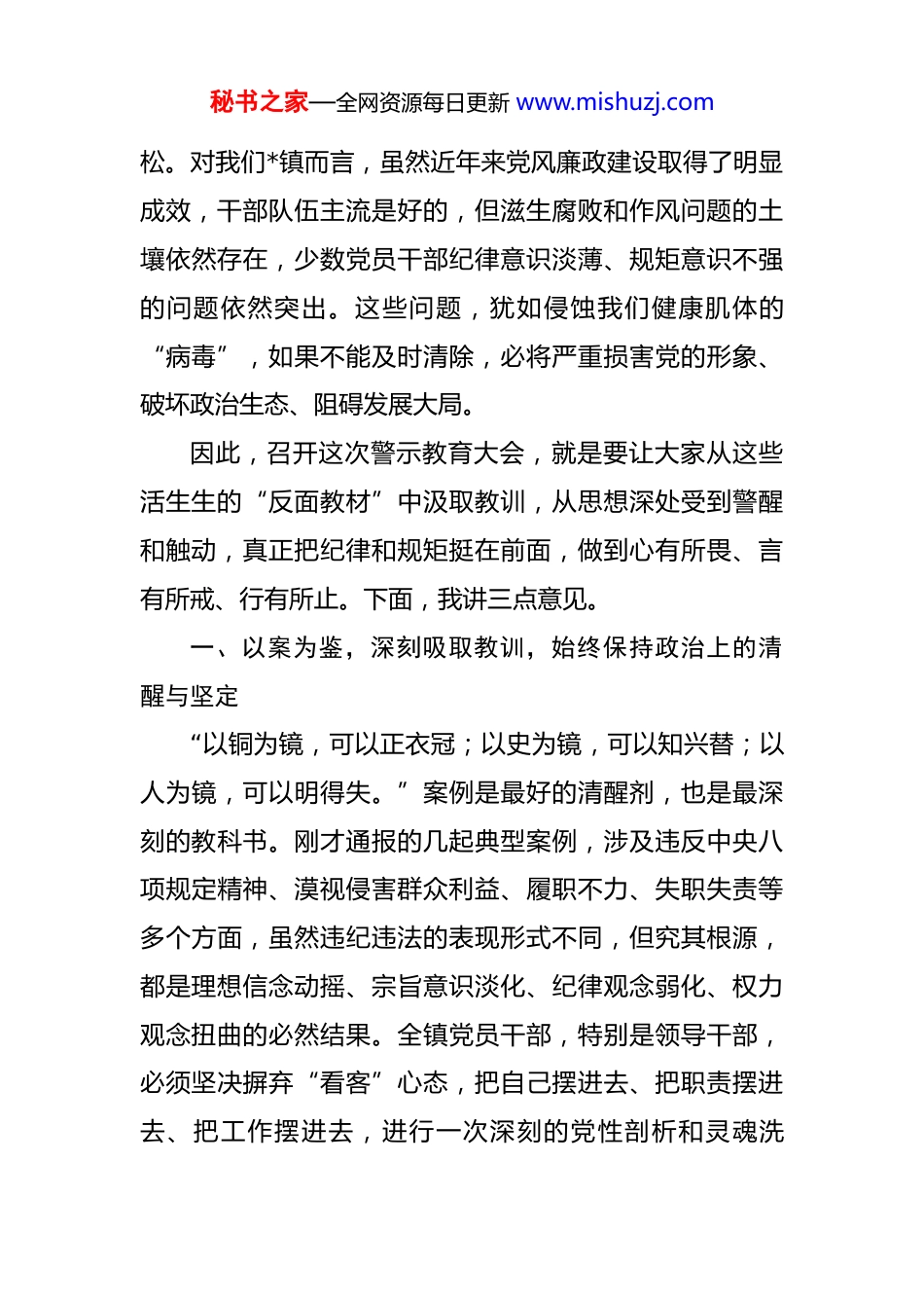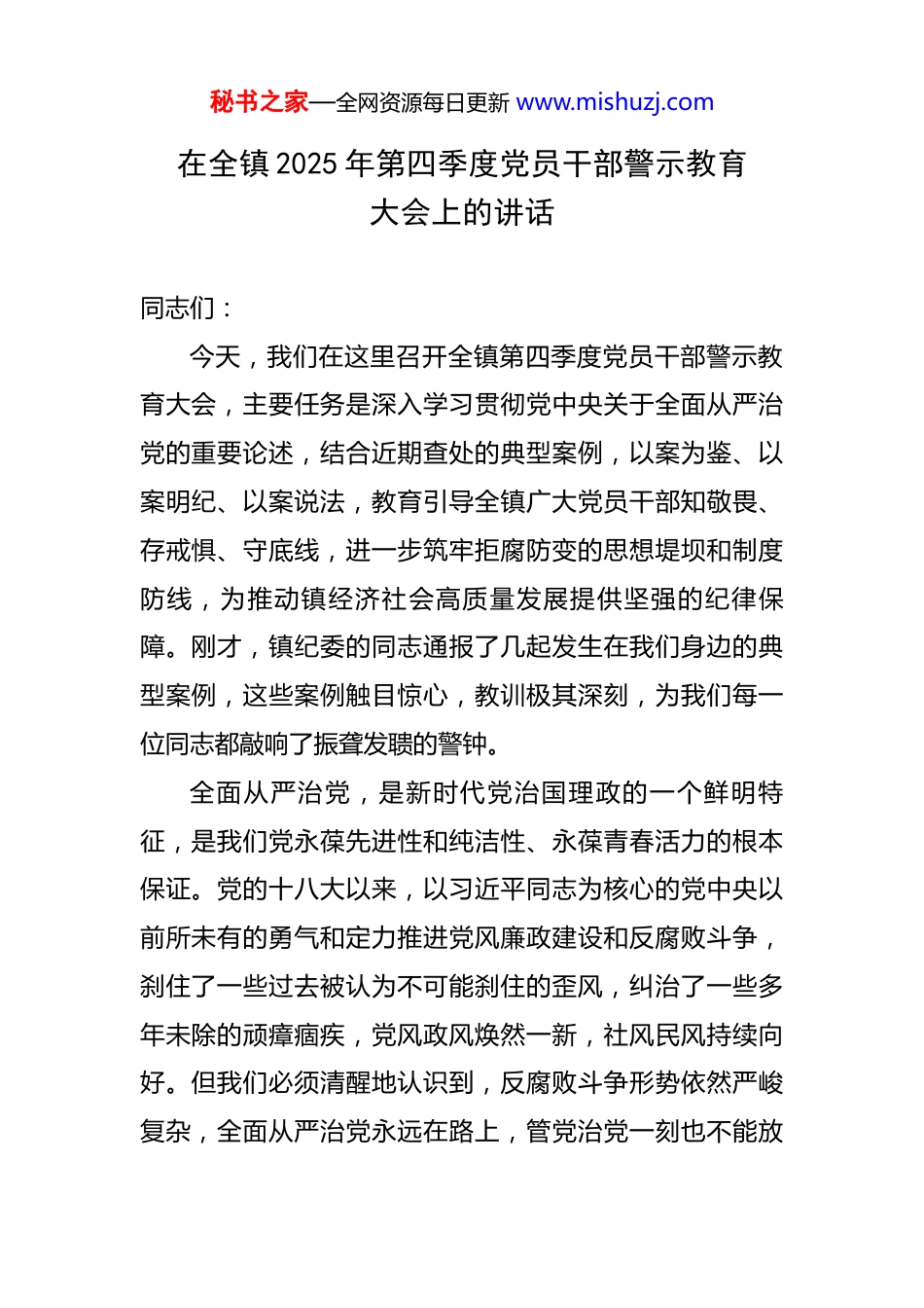 秘书之家—全网资源每日更新 www.mishuzj.com在全镇 2025 年第四季度党员干部警示教育大会上的讲话 同志们:今天,我们在这里召开全镇第四季度党员干部警示教育大会,主要任务是深入学习贯彻党中央关于全面从严治党的重要论述,结合近期查处的典型案例,以案为鉴、以案明纪、以案说法,教育引导全镇广大党员干部知敬畏、存戒惧、守底线,进一步筑牢拒腐防变的思想堤坝和制度防线,为推动镇经济社会高质量发展提供坚强的纪律保障。刚才,镇纪委的同志通报了几起发生在我们身边的典型案例,这些案例触目惊心,教训极其深刻,为我们每一位同志都敲响了振聋发聩的警钟。全面从严治党,是新时代党治国理政的一个鲜明特征,是我们党永葆先进性和纯洁性、永葆青春活力的根本保证。党的十八大以来,以习近平同志为核心的党中央以前所未有的勇气和定力推进党风廉政建设和反腐败斗争,刹住了一些过去被认为不可能刹住的歪风,纠治了一些多年未除的顽瘴痼疾,党风政风焕然一新,社风民风持续向好。但我们必须清醒地认识到,反腐败斗争形势依然严峻复杂,全面从严治党永远在路上,管党治党一刻也不能放秘书之家—全网资源每日更新 www.mishuzj.com松。对我们*镇而言,虽然近年来党风廉政建设取得了明显成效,干部队伍主流是好的,但滋生腐败和作风问题的土壤依然存在,少数党员干部纪律意识淡薄、规矩意识不强的问题依然突出。这些问题,犹如侵蚀我们健康肌体的“病毒”,如果不能及时清除,必将严重损害党的形象、破坏政治生态、阻碍发展大局。因此,召开这次警示教育大会,就是要让大家从这些活生生的“反面教材”中汲取教训,从思想深处受到警醒和触动,真正把纪律和规矩挺在前面,做到心有所畏、言有所戒、行有所止。下面,我讲三点意见。一、以案为鉴,深刻吸取教训,始终保持政治上的清醒与坚定“以铜为镜,可以正衣冠;以史为镜,可以知兴替;以人为镜,可以明得失。”案例是最好的清醒剂,也是最深刻的教科书。刚才通报的几起典型案例,涉及违反中央八项规定精神、漠视侵害群众利益、履职不力、失职失责等多个方面,虽然违纪违法的表现形式不同,但究其根源,都是理想信念动摇、宗旨意识淡化、纪律观念弱化、权力观念扭曲的必然结果。全镇党员干部,特别是领导干部,必须坚决摒弃“看客”心态,把自己摆进去、把职责摆进去、把工作摆进去,进行一次深刻的党性剖析和灵魂洗秘书之家—全网资源每日更新 www.mishuzj.com礼。(一)必须坚定理想信念,筑牢思想“压舱石”。理想信念是共产党人精神上的“钙”,没有理想信念,或者理想信念不坚定,精神上就会“缺钙”,就会得“软骨病”。从通报的案例来看,涉案人员无一不是从思想滑坡、信念动摇开始的。他们忘记了入党时的铮铮誓言,忘记了作为一名党员干部的初心和使命,在各种诱惑面前败下阵来,最终滑向了违纪违法的深渊。比如,一些干部沉迷于吃喝享乐,认为这是“人之常情”,结果在推杯换盏中迷失了自我,模糊了公与私的界限;一些干部把手中的权力视为谋取私利的工具,不是想着如何为民办事,而是琢磨着如何“靠山吃山”,雁过拔毛,最终损害的是群众的切身利益,啃食的是党的执政根基。这些沉痛的教训告诉我们,思想的堤坝一旦决口,腐败的洪水便会一泻千里。全镇党员干部要始终把加强理论学习、坚定理想信念作为终身课题,持续深入学习习近平新时代中国特色社会主义思想,不断提高政治判断力、政治领悟力、政治执行力。要经常性地重温入党誓词,对照党章党规党纪净化思想、检视言行,自觉拧紧世界观、人生观、价值观这个“总开关”,真正做到在党爱党、在党言党、在党忧党、在党为党。秘书之家—全网资源每日更新 www.mishuzj.com(二)必须恪守为民初心,站稳人民“硬立场”。江山就是人民,人民就是江山。我们党的根基在人民、血脉在人民、力量在人民。作为基层干部,我们直接面对群众,我们的一言一行,直接关系到党和政府在人民群众心中的形象。案例中,有的干部对群众的急难愁盼问题漠不关心、推诿扯皮,有的在惠民政策落实中优亲厚友、吃拿卡要,这些行为严重背离了我们党的根本宗旨,寒了群众的心。例如,据统计,...