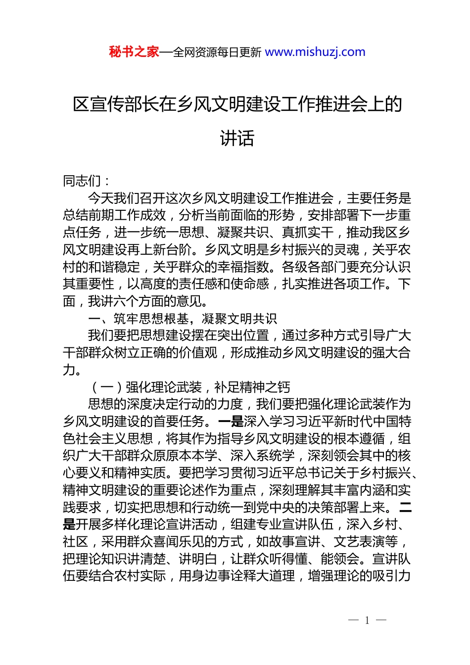 秘书之家—全网资源每日更新 www.mishuzj.com区宣传部长在乡风文明建设工作推进会上的讲话同志们:今天我们召开这次乡风文明建设工作推进会,主要任务是总结前期工作成效,分析当前面临的形势,安排部署下一步重点任务,进一步统一思想、凝聚共识、真抓实干,推动我区乡风文明建设再上新台阶。乡风文明是乡村振兴的灵魂,关乎农村的和谐稳定,关乎群众的幸福指数。各级各部门要充分认识其重要性,以高度的责任感和使命感,扎实推进各项工作。下面,我讲六个方面的意见。一、筑牢思想根基,凝聚文明共识我们要把思想建设摆在突出位置,通过多种方式引导广大干部群众树立正确的价值观,形成推动乡风文明建设的强大合力。(一)强化理论武装,补足精神之钙思想的深度决定行动的力度,我们要把强化理论武装作为乡风文明建设的首要任务。一是深入学习习近平新时代中国特色社会主义思想,将其作为指导乡风文明建设的根本遵循,组织广大干部群众原原本本学、深入系统学,深刻领会其中的核心要义和精神实质。要把学习贯彻习近平总书记关于乡村振兴、精神文明建设的重要论述作为重点,深刻理解其丰富内涵和实践要求,切实把思想和行动统一到党中央的决策部署上来。二是开展多样化理论宣讲活动,组建专业宣讲队伍,深入乡村、社区,采用群众喜闻乐见的方式,如故事宣讲、文艺表演等,把理论知识讲清楚、讲明白,让群众听得懂、能领会。宣讲队伍要结合农村实际,用身边事诠释大道理,增强理论的吸引力— 1 —秘书之家—全网资源每日更新 www.mishuzj.com和感染力。同时,要利用新时代文明实践中心(所、站)等阵地,定期开展理论学习交流活动。三是推动理论学习入脑入心,通过开展知识竞赛、主题征文等活动,检验学习成果,引导干部群众将理论知识转化为推动乡风文明建设的实际行动,真正补足精神之钙。要建立学习台账,对干部群众的学习情况进行跟踪管理,确保学习不走过场。此外,要注重发挥家庭在理论学习中的作用,开展“理论进家庭”活动,以家庭为单位传播先进思想。(二)弘扬主流价值,引领文明风尚主流价值是社会文明的风向标,弘扬主流价值对于引领文明风尚具有至关重要的作用。一是大力培育和践行社会主义核心价值观,将其融入乡村发展各方面,通过张贴宣传画、设置宣传栏等形式,让社会主义核心价值观家喻户晓、深入人心。要结合农村实际,将核心价值观转化为通俗易懂的语言和具体的行为规范,让群众易于理解和遵守。在学校、企业等场所也要加强核心价值观教育。二是开展“身边好人”“道德模范”评选活动,挖掘和宣传群众身边的先进典型,用榜样的力量引领社会风尚,营造“崇尚先进、学习先进、争当先进”的浓厚氛围。评选过程要公开、公平、公正,充分征求群众意见。对评选出的先进典型,要通过多种渠道进行宣传报道,让他们的事迹广为人知。同时,要建立先进典型帮扶机制,解决他们的实际困难。三是加强爱国主义教育,利用重要节日、纪念日等,组织开展升国旗、唱国歌、参观爱国主义教育基地等活动,增强群众的爱国情感和民族自豪感。在重大节日期间,要精心策划系列爱国主义教育活动,吸引群众广泛参与。要挖掘本地的红色资源,编写红色故事,让群众在耳濡目染中接受爱国主义教育。此外,要加强对青少年的爱国主义教育,培养他们的爱国情怀。(三)开展主题教育,提升思想觉悟— 2 —秘书之家—全网资源每日更新 www.mishuzj.com主题教育是提升群众思想觉悟的有效途径,要精心组织开展各类主题教育活动。一是组织开展“感恩奋进”主题教育,引导群众感恩党、感恩国家、感恩社会,增强对美好生活的向往和追求,激发参与乡风文明建设的积极性和主动性。可以通过举办座谈会、演讲比赛等形式,让群众分享自己的感恩故事和奋斗经历。要结合脱贫攻坚、乡村振兴等成果,展示党和国家对农村的关怀和支持,增强群众的感恩意识。二是开展“诚信友善”主题教育,倡导诚实守信、邻里互助的良好风尚,通过开展诚信经营户评选、邻里互助活动等,营造诚信友善的乡村氛围。要建立诚信档案,对村民的诚信行为进行记录和评价,对诚信户给予一定的奖励和优惠。在邻里之间,要组织开展互助...