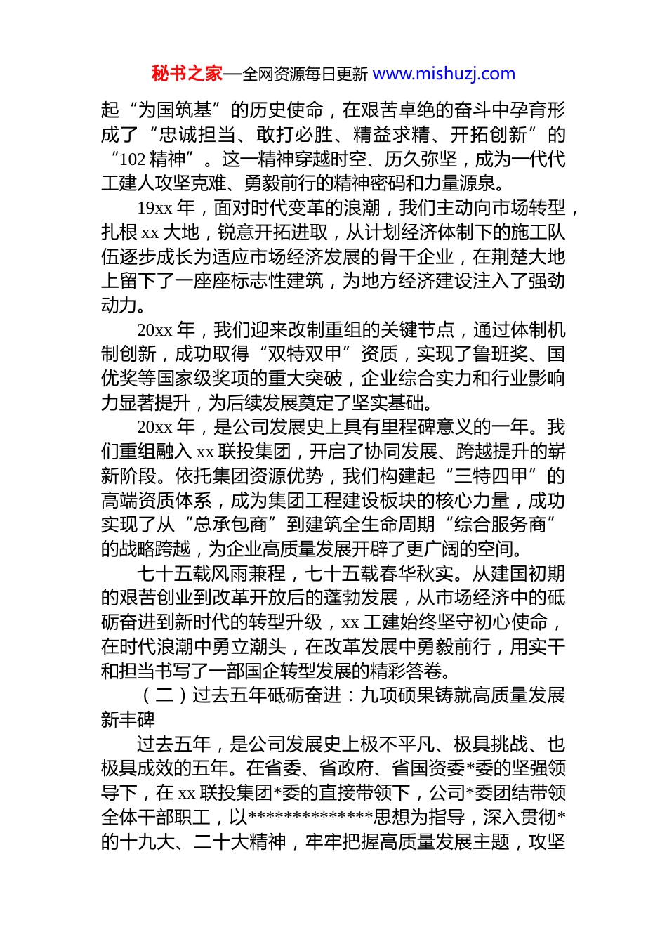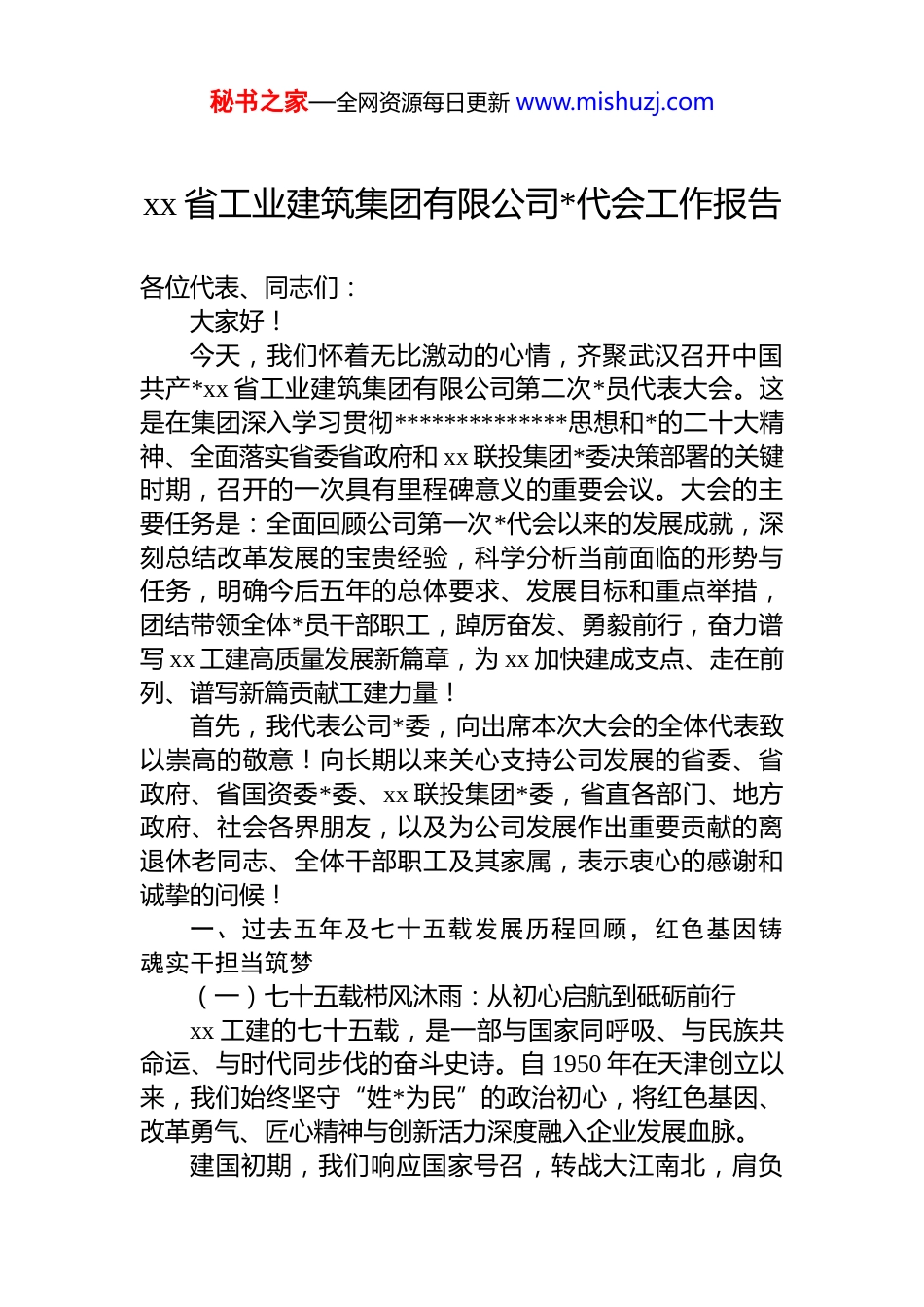 秘书之家—全网资源每日更新 www.mishuzj.comxx 省工业建筑集团有限公司*代会工作报告各位代表、同志们:大家好!今天,我们怀着无比激动的心情,齐聚武汉召开中国共产*xx 省工业建筑集团有限公司第二次*员代表大会。这是在集团深入学习贯彻**************思想和*的二十大精神、全面落实省委省政府和 xx 联投集团*委决策部署的关键时期,召开的一次具有里程碑意义的重要会议。大会的主要任务是:全面回顾公司第一次*代会以来的发展成就,深刻总结改革发展的宝贵经验,科学分析当前面临的形势与任务,明确今后五年的总体要求、发展目标和重点举措,团结带领全体*员干部职工,踔厉奋发、勇毅前行,奋力谱写 xx 工建高质量发展新篇章,为 xx 加快建成支点、走在前列、谱写新篇贡献工建力量!首先,我代表公司*委,向出席本次大会的全体代表致以崇高的敬意!向长期以来关心支持公司发展的省委、省政府、省国资委*委、xx 联投集团*委,省直各部门、地方政府、社会各界朋友,以及为公司发展作出重要贡献的离退休老同志、全体干部职工及其家属,表示衷心的感谢和诚挚的问候!一、过去五年及七十五载发展历程回顾,红色基因铸魂实干担当筑梦(一)七十五载栉风沐雨:从初心启航到砥砺前行xx 工建的七十五载,是一部与国家同呼吸、与民族共命运、与时代同步伐的奋斗史诗。自 1950 年在天津创立以来,我们始终坚守“姓*为民”的政治初心,将红色基因、改革勇气、匠心精神与创新活力深度融入企业发展血脉。建国初期,我们响应国家号召,转战大江南北,肩负秘书之家—全网资源每日更新 www.mishuzj.com起“为国筑基”的历史使命,在艰苦卓绝的奋斗中孕育形成了“忠诚担当、敢打必胜、精益求精、开拓创新”的“102 精神”。这一精神穿越时空、历久弥坚,成为一代代工建人攻坚克难、勇毅前行的精神密码和力量源泉。19xx 年,面对时代变革的浪潮,我们主动向市场转型,扎根 xx 大地,锐意开拓进取,从计划经济体制下的施工队伍逐步成长为适应市场经济发展的骨干企业,在荆楚大地上留下了一座座标志性建筑,为地方经济建设注入了强劲动力。20xx 年,我们迎来改制重组的关键节点,通过体制机制创新,成功取得“双特双甲”资质,实现了鲁班奖、国优奖等国家级奖项的重大突破,企业综合实力和行业影响力显著提升,为后续发展奠定了坚实基础。20xx 年,是公司发展史上具有里程碑意义的一年。我们重组融入 xx 联投集团,开启了协同发展、跨越提升的崭新阶段。依托集团资源优势,我们构建起“三特四甲”的高端资质体系,成为集团工程建设板块的核心力量,成功实现了从“总承包商”到建筑全生命周期“综合服务商”的战略跨越,为企业高质量发展开辟了更广阔的空间。七十五载风雨兼程,七十五载春华秋实。从建国初期的艰苦创业到改革开放后的蓬勃发展,从市场经济中的砥砺奋进到新时代的转型升级,xx 工建始终坚守初心使命,在时代浪潮中勇立潮头,在改革发展中勇毅前行,用实干和担当书写了一部国企转型发展的精彩答卷。(二)过去五年砥砺奋进:九项硕果铸就高质量发展新丰碑过去五年,是公司发展史上极不平凡、极具挑战、也极具成效的五年。在省委、省政府、省国资委*委的坚强领导下,在 xx 联投集团*委的直接带领下,公司*委团结带领全体干部职工,以**************思想为指导,深入贯彻*的十九大、二十大精神,牢牢把握高质量发展主题,攻坚秘书之家—全网资源每日更新 www.mishuzj.com克难、锐意进取,各项事业取得全面进步,交出了一份向难求成、殊为不易的优异答卷。1.dj 引领聚合力,强根铸魂显担当五年来,我们始终坚持以*的政治建设为统领,把 dj 工作深度融入企业改革发展、生产经营全过程,以高质量 dj引领高质量发展。组织体系不断健全。构建“1+26+n”dj 组织体系,实现工程项目*组织全覆盖,让*旗在施工一线高高飘扬。无论是重大工程建设现场,还是抗疫救灾前沿,*组织始终发挥着战斗堡垒作用,*员始终冲锋在前,成为攻坚克难的中坚力量。特色品牌亮点纷呈。创新打造“dj+eap”“dj+项目攻坚”“dj+廉洁文化”等一系列特色 dj 品牌,其中“dj+eap”模式荣...