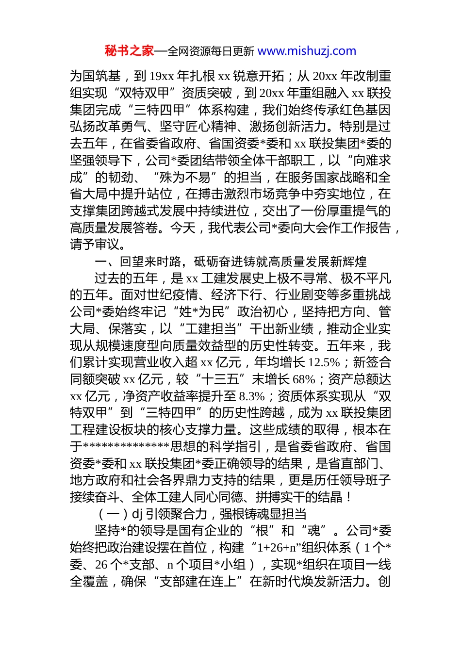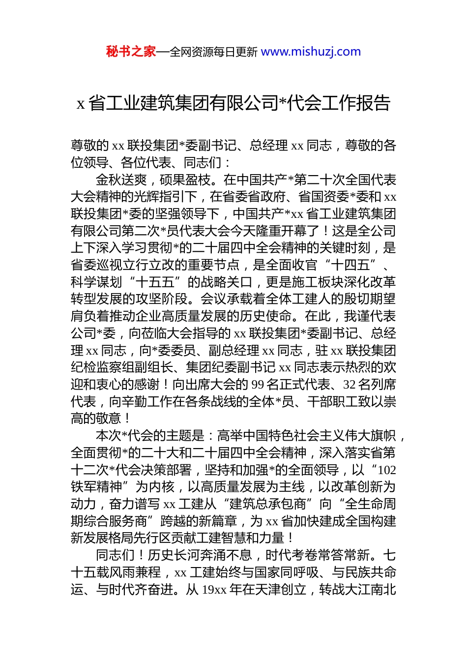 秘书之家—全网资源每日更新 www.mishuzj.comx 省工业建筑集团有限公司*代会工作报告尊敬的 xx 联投集团*委副书记、总经理 xx 同志,尊敬的各位领导、各位代表、同志们:金秋送爽,硕果盈枝。在中国共产*第二十次全国代表大会精神的光辉指引下,在省委省政府、省国资委*委和 xx联投集团*委的坚强领导下,中国共产*xx 省工业建筑集团有限公司第二次*员代表大会今天隆重开幕了!这是全公司上下深入学习贯彻*的二十届四中全会精神的关键时刻,是省委巡视立行立改的重要节点,是全面收官“十四五”、科学谋划“十五五”的战略关口,更是施工板块深化改革转型发展的攻坚阶段。会议承载着全体工建人的殷切期望肩负着推动企业高质量发展的历史使命。在此,我谨代表公司*委,向莅临大会指导的 xx 联投集团*委副书记、总经理 xx 同志,向*委委员、副总经理 xx 同志,驻 xx 联投集团纪检监察组副组长、集团纪委副书记 xx 同志表示热烈的欢迎和衷心的感谢!向出席大会的 99 名正式代表、32 名列席代表,向辛勤工作在各条战线的全体*员、干部职工致以崇高的敬意!本次*代会的主题是:高举中国特色社会主义伟大旗帜,全面贯彻*的二十大和二十届四中全会精神,深入落实省第十二次*代会决策部署,坚持和加强*的全面领导,以“102铁军精神”为内核,以高质量发展为主线,以改革创新为动力,奋力谱写 xx 工建从“建筑总承包商”向“全生命周期综合服务商”跨越的新篇章,为 xx 省加快建成全国构建新发展格局先行区贡献工建智慧和力量!同志们!历史长河奔涌不息,时代考卷常答常新。七十五载风雨兼程,xx 工建始终与国家同呼吸、与民族共命运、与时代齐奋进。从 19xx 年在天津创立,转战大江南北秘书之家—全网资源每日更新 www.mishuzj.com为国筑基,到 19xx 年扎根 xx 锐意开拓;从 20xx 年改制重组实现“双特双甲”资质突破,到 20xx 年重组融入 xx 联投集团完成“三特四甲”体系构建,我们始终传承红色基因弘扬改革勇气、坚守匠心精神、激扬创新活力。特别是过去五年,在省委省政府、省国资委*委和 xx 联投集团*委的坚强领导下,公司*委团结带领全体干部职工,以“向难求成”的韧劲、“殊为不易”的担当,在服务国家战略和全省大局中提升站位,在搏击激烈市场竞争中夯实地位,在支撑集团跨越式发展中持续进位,交出了一份厚重提气的高质量发展答卷。今天,我代表公司*委向大会作工作报告,请予审议。一、回望来时路,砥砺奋进铸就高质量发展新辉煌过去的五年,是 xx 工建发展史上极不寻常、极不平凡的五年。面对世纪疫情、经济下行、行业剧变等多重挑战公司*委始终牢记“姓*为民”政治初心,坚持把方向、管大局、保落实,以“工建担当”干出新业绩,推动企业实现从规模速度型向质量效益型的历史性转变。五年来,我们累计实现营业收入超 xx 亿元,年均增长 12.5%;新签合同额突破 xx 亿元,较“十三五”末增长 68%;资产总额达xx 亿元,净资产收益率提升至 8.3%;资质体系实现从“双特双甲”到“三特四甲”的历史性跨越,成为 xx 联投集团工程建设板块的核心支撑力量。这些成绩的取得,根本在于**************思想的科学指引,是省委省政府、省国资委*委和 xx 联投集团*委正确领导的结果,是省直部门、地方政府和社会各界鼎力支持的结果,更是历任领导班子接续奋斗、全体工建人同心同德、拼搏实干的结晶!(一)dj 引领聚合力,强根铸魂显担当坚持*的领导是国有企业的“根”和“魂”。公司*委始终把政治建设摆在首位,构建“1+26+n”组织体系(1 个*委、26 个*支部、n 个项目*小组),实现*组织在项目一线全覆盖,确保“支部建在连上”在新时代焕发新活力。创秘书之家—全网资源每日更新 www.mishuzj.com新打造“dj+eap”(员工援助计划)特色品牌,将心理疏导、职业规划融入 dj,累计服务职工 1.2 万人次,相关经验荣获全省国企 dj 创新实践一等奖。深入开展“第一议题”学习制度,建立“中心组领学、支部深学、*员践学”三级联动机制,五年来组织专题学习 320 余场次,覆盖*员 8000 余人次,推动*的创新理论进车间、进班...