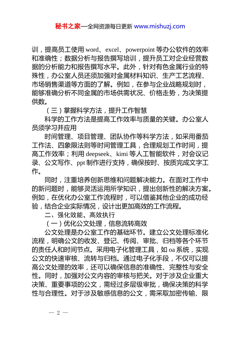 秘书之家—全网资源每日更新 www.mishuzj.com办公室工作实施“四维提升”的探索实践(集团公司)国有有色金属企业是国家经济发展的重要支柱,其办公室工作的效能直接关系到企业的战略实施、文化传承及创新能力提升。然而,面对信息爆炸、任务繁重、要求严格等现实挑战,办公室工作往往陷入效率瓶颈,难以充分发挥其应有的作用。因此,探索并实施一套科学、系统的效能提升策略,成为促进有色金属国有企业健康发展的必然选择。一、深化学习,提高素养(一)深化理论学习,提升政策敏锐度有色金属行业,政策导向与市场变化紧密相关。办公室人员需紧跟国家政策导向与行业发展趋势,通过参加高级研讨会、订阅专业期刊、利用在线学习平台等多种方式,深入学习*的最新理论成果、政策法规及行业知识。积极参与中国有色金属工业协会或政府部门组织的有色金属产业论坛,了解国家对有色金属行业的最新政策导向,如环保政策、资源税改革等,以及国际市场动态,如金属价格波动、国际贸易形势等。通过上述学习,提升政策敏锐度和理论素养,为组织决策提供科学、前瞻性的建议。同时,办公室人员还须关注企业内部政策与规章制度的更新,确保在日常工作中能够准确执行,避免因理解偏差而导致决策失误。(二)精进业务知识,提升专业能力国有有色金属企业的办公室工作涉及多个专业领域,如人力资源管理、财务管理、物资管理等,人员须持续学习新知识、新技能,以适应不断变化的工作需求。针对办公室工作的专业性特点,可以组织定期的业务培训,如办公软件的高级应用培— 1 —秘书之家—全网资源每日更新 www.mishuzj.com训,提高员工使用 word、excel、powerpoint 等办公软件的效率和准确性;数据分析与报告撰写培训,提升员工对企业经营数据的分析能力和报告撰写水平。此外,针对有色金属行业的特殊性,办公室人员还须加强对金属材料知识、生产工艺流程、市场销售渠道等方面的了解。例如,在参与企业战略规划时,能够准确分析不同金属的市场供需状况、价格走势,为决策提供数。(三)掌握科学方法,提升工作智慧科学的工作方法是提高工作效率与质量的关键。办公室人员须学习并应用时间管理、项目管理、团队协作等科学方法,如采用番茄工作法、四象限法则等时间管理工具,合理规划工作时间,提高工作效率;利用 deepseek、kimi 等人工智能软件,对会议记录、公文写作、ppt 制作进行支持,确保按时、按质完成文字工作。同时,注重培养创新思维和问题解决能力。在面对工作中的新问题时,能够灵活运用所学知识,提出创新性的解决方案。例如,在优化办公室工作流程时,可以借鉴其他企业的成功经验,结合企业实际情况,设计出更加高效的工作流程。二、强化效能,高效执行(一)优化公文处理,信息流转高效公文处理是办公室工作的基础环节。建立公文处理标准化流程,明确公文的收发、登记、传阅、审批、归档等各个环节的责任人和时间节点。采用电子化管理工具,如 oa 系统,实现公文的快速审核、流转与归档。通过电子化手段,不仅可以提高公文处理的效率,还可以确保信息的准确性、完整性与安全性。同时,加强对公文内容的审核与把关。对于涉及企业重大决策、重要事项的公文,需经过多层级审批,确保决策的科学性与合理性。对于涉及敏感信息的公文,需采取加密传输、限— 2 —秘书之家—全网资源每日更新 www.mishuzj.com制访问等措施,确保信息安全。(二)精细会议组织,提升决策效率会议是组织决策的重要形式。遵循“精简高效”原则,精心策划会议内容、议程及参会人员,建立会前材料预审制度,提前 2 天发送会议资料,便于参会人提前酝酿。在会议内容方面,应围绕企业中心工作,突出重点、难点问题,确保会议针对性强、效率高。在议程安排方面,应合理安排会议时间,避免会议时间过长或过短,影响会议效果。在参会人员方面,应根据会议主题,邀请相关领导和部门负责人参加,确保决策的全面性与权威性。利用会议管理系统进行会议记录与任务分配。会议结束后应及时整理会议纪要,明确会议决策和后续工作任务,并通过会议管理系统将任务分配给相关部门和人员。同时,建立会议跟踪机制,对...
