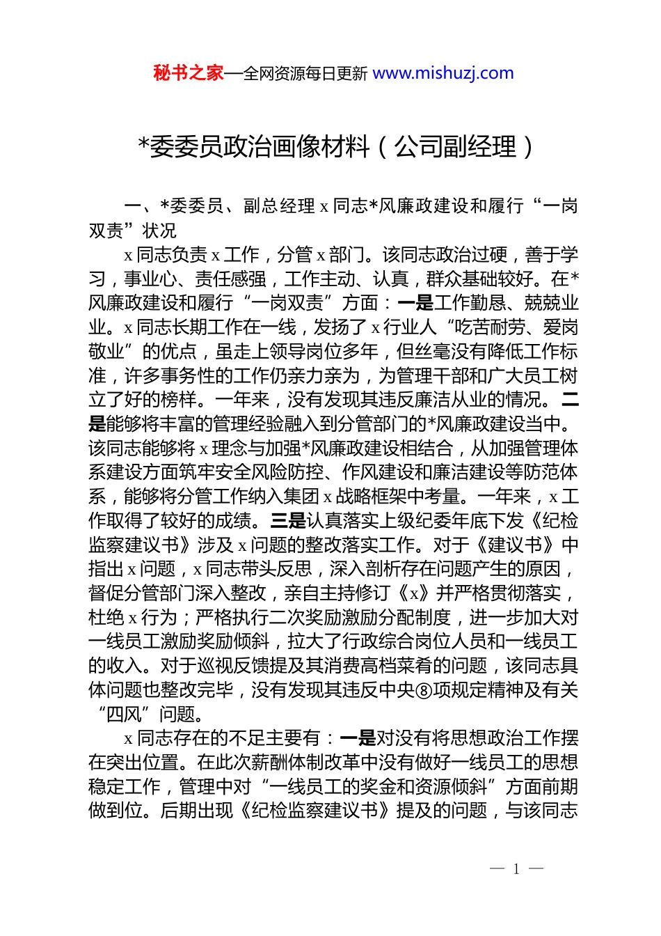 秘书之家—全网资源每日更新 www.mishuzj.com*委委员政治画像材料(公司副经理)一、*委委员、副总经理 x 同志*风廉政建设和履行“一岗双责”状况x 同志负责 x 工作,分管 x 部门。该同志政治过硬,善于学习,事业心、责任感强,工作主动、认真,群众基础较好。在*风廉政建设和履行“一岗双责”方面:一是工作勤恳、兢兢业业。x 同志长期工作在一线,发扬了 x 行业人“吃苦耐劳、爱岗敬业”的优点,虽走上领导岗位多年,但丝毫没有降低工作标准,许多事务性的工作仍亲力亲为,为管理干部和广大员工树立了好的榜样。一年来,没有发现其违反廉洁从业的情况。二是能够将丰富的管理经验融入到分管部门的*风廉政建设当中。该同志能够将 x 理念与加强*风廉政建设相结合,从加强管理体系建设方面筑牢安全风险防控、作风建设和廉洁建设等防范体系,能够将分管工作纳入集团 x 战略框架中考量。一年来,x 工作取得了较好的成绩。三是认真落实上级纪委年底下发《纪检监察建议书》涉及 x 问题的整改落实工作。对于《建议书》中指出 x 问题,x 同志带头反思,深入剖析存在问题产生的原因,督促分管部门深入整改,亲自主持修订《x》并严格贯彻落实,杜绝 x 行为;严格执行二次奖励激励分配制度,进一步加大对一线员工激励奖励倾斜,拉大了行政综合岗位人员和一线员工的收入。对于巡视反馈提及其消费高档菜肴的问题,该同志具体问题也整改完毕,没有发现其违反中央⑧项规定精神及有关“四风”问题。x 同志存在的不足主要有:一是对没有将思想政治工作摆在突出位置。在此次薪酬体制改革中没有做好一线员工的思想稳定工作,管理中对“一线员工的奖金和资源倾斜”方面前期做到位。后期出现《纪检监察建议书》提及的问题,与该同志— 1 —秘书之家—全网资源每日更新 www.mishuzj.com没有重视思想政治建设息息相关。二是还没有将***关于安全的****批示精神与日常安全管理工作高度融合,安全管理虽然处于较好的水平,但对部分管理岗位的安全风险关注不多,部分管理人员存在报喜不报忧的错误思想虽得到遏制,但还需时间的检验。三是 dj 和业务工作融合的还不够紧密。履行*风廉政建设“一岗双责”还存在着抓业务一手硬、抓廉政一手软的不平衡现象。二、*委委员、财务总监 x 同志*风廉政建设和履行“一岗双责”状况x 同志负责财务、后勤保障工作,分管 x 部,协助总经理分管财务部。该同志理想信念坚定,财务管理经验丰富,工作严谨细致、坚持原则。一年来,较好完成了协助总经理分管财务部的工作任务,分管部门为公司安全生产运行提供了保障。在*风廉政建设和履行“一岗双责”方面:一是狠抓关键岗位和人员的廉洁风险防控工作。x同志将财务管理、维修采购等岗位作为廉洁风险防控重点,督促分管部门建立预防为主的廉洁风险防控体系,严格做好预算管理、财务报销、“小金库”排查等各项工作,财务和后勤工作逐步科学化、规范化。二是贯彻过“紧日子”的思想,遵循成本控制的原则,对全面预算管理、大额资金使用、各类费用报销等工作能够认真审核把关,在担任财务总监的多年来,严格公司财务制度,严把审批、报销权限,为公司层面遵守中央违反中央⑧项规定精神提供了保障。三是严格贯彻***关于制止餐饮浪费的****批示精神,深入职工食堂调研,不但在公司营造了较好地氛围,更是在职工餐厅管理上下功夫,推出了单份餐盘可拼多种菜品等有效管用的措施,有效地防止了浪费行为发生。x 同志存在不足主要有:一是相比去年,虽然对成本核算、收入结算等财务岗位对资源的调配的分析作了一些探索,但总— 2 —秘书之家—全网资源每日更新 www.mishuzj.com体效果不明显,没有从发挥财务高效的统计应用功能,对于公司面临的经营压力,在建言献策如何降本增效方面的贡献还不够多,财务人员处理和分析问题的能力还不够强。二是如何做好新形势下的群众工作,提高群众的满意度,缺乏新意和有效手段。如于群众反映强烈的职工餐厅问题,x 同志虽然也从制止餐饮浪费行为上下了很多功夫,也取得了成效,但在餐厅整体满意度上,但较群众的期待还有很大的距离,餐厅饭菜质量不高、价格偏贵...