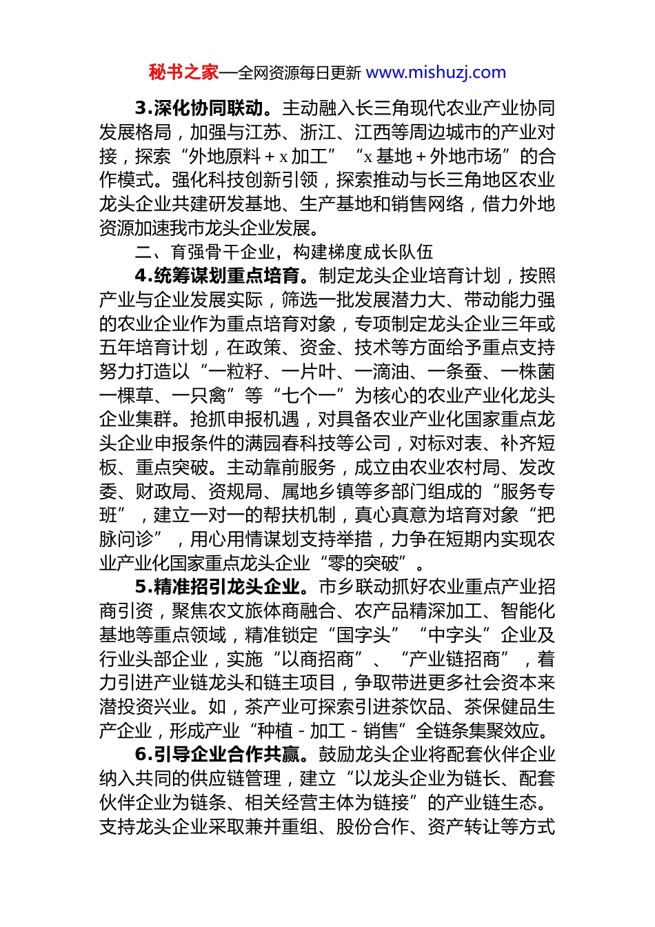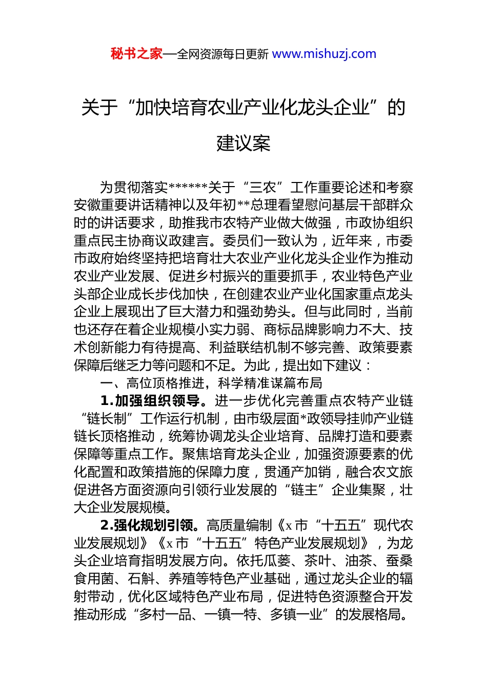 秘书之家—全网资源每日更新 www.mishuzj.com关于“加快培育农业产业化龙头企业”的建议案为贯彻落实******关于“三农”工作重要论述和考察安徽重要讲话精神以及年初**总理看望慰问基层干部群众时的讲话要求,助推我市农特产业做大做强,市政协组织重点民主协商议政建言。委员们一致认为,近年来,市委市政府始终坚持把培育壮大农业产业化龙头企业作为推动农业产业发展、促进乡村振兴的重要抓手,农业特色产业头部企业成长步伐加快,在创建农业产业化国家重点龙头企业上展现出了巨大潜力和强劲势头。但与此同时,当前也还存在着企业规模小实力弱、商标品牌影响力不大、技术创新能力有待提高、利益联结机制不够完善、政策要素保障后继乏力等问题和不足。为此,提出如下建议:一、高位顶格推进,科学精准谋篇布局1.加强组织领导。进一步优化完善重点农特产业链“链长制”工作运行机制,由市级层面*政领导挂帅产业链链长顶格推动,统筹协调龙头企业培育、品牌打造和要素保障等重点工作。聚焦培育龙头企业,加强资源要素的优化配置和政策措施的保障力度,贯通产加销,融合农文旅促进各方面资源向引领行业发展的“链主”企业集聚,壮大企业发展规模。2.强化规划引领。高质量编制《x 市“十五五”现代农业发展规划》《x 市“十五五”特色产业发展规划》,为龙头企业培育指明发展方向。依托瓜蒌、茶叶、油茶、蚕桑食用菌、石斛、养殖等特色产业基础,通过龙头企业的辐射带动,优化区域特色产业布局,促进特色资源整合开发推动形成“多村一品、一镇一特、多镇一业”的发展格局。秘书之家—全网资源每日更新 www.mishuzj.com3.深化协同联动。主动融入长三角现代农业产业协同发展格局,加强与江苏、浙江、江西等周边城市的产业对接,探索“外地原料+x 加工”“x 基地+外地市场”的合作模式。强化科技创新引领,探索推动与长三角地区农业龙头企业共建研发基地、生产基地和销售网络,借力外地资源加速我市龙头企业发展。二、育强骨干企业,构建梯度成长队伍4.统筹谋划重点培育。制定龙头企业培育计划,按照产业与企业发展实际,筛选一批发展潜力大、带动能力强的农业企业作为重点培育对象,专项制定龙头企业三年或五年培育计划,在政策、资金、技术等方面给予重点支持努力打造以“一粒籽、一片叶、一滴油、一条蚕、一株菌一棵草、一只禽”等“七个一”为核心的农业产业化龙头企业集群。抢抓申报机遇,对具备农业产业化国家重点龙头企业申报条件的满园春科技等公司,对标对表、补齐短板、重点突破。主动靠前服务,成立由农业农村局、发改委、财政局、资规局、属地乡镇等多部门组成的“服务专班”,建立一对一的帮扶机制,真心真意为培育对象“把脉问诊”,用心用情谋划支持举措,力争在短期内实现农业产业化国家重点龙头企业“零的突破”。5.精准招引龙头企业。市乡联动抓好农业重点产业招商引资,聚焦农文旅体商融合、农产品精深加工、智能化基地等重点领域,精准锁定“国字头”“中字头”企业及行业头部企业,实施“以商招商”、“产业链招商”,着力引进产业链龙头和链主项目,争取带进更多社会资本来潜投资兴业。如,茶产业可探索引进茶饮品、茶保健品生产企业,形成产业“种植-加工-销售”全链条集聚效应。6.引导企业合作共赢。鼓励龙头企业将配套伙伴企业纳入共同的供应链管理,建立“以龙头企业为链长、配套伙伴企业为链条、相关经营主体为链接”的产业链生态。支持龙头企业采取兼并重组、股份合作、资产转让等方式秘书之家—全网资源每日更新 www.mishuzj.com成立集团企业、组建产业联盟,发挥规模优势、技术优势和创新优势,提高对产能、技术的掌控能力,提升行业竞争力。全面组建重点农特产业行业协会,充分发挥行业协会的引导作用,促进资源共享、优势互补、产业链协同发展。三、扩大品牌影响,擦亮特色产品名片7.叫响区域公用品牌。加强“天柱山瓜蒌籽”“天柱剑毫”品牌的使用与管理,完善公用品牌+企业品牌的“母子品牌”使用模式。积极申报“天柱山瓜蒌籽”加工制作技艺列入国家级非物质文化遗产、申报“天柱剑毫”地理标志保护产品认证,丰富公用品牌内涵。管好用好...