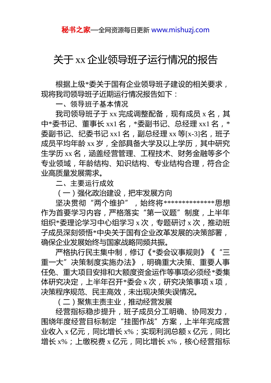 秘书之家—全网资源每日更新 www.mishuzj.com关于 xx 企业领导班子运行情况的报告根据上级*委关于国有企业领导班子建设的相关要求,现将我司领导班子近期运行情况报告如下:一、领导班子基本情况我司领导班子于 xx 完成调整配备,现有成员 x 名,其中*委书记、董事长 xx1 名,*委副书记、总经理 xx1 名,*委副书记、纪委书记 xx1 名,副总经理 xx 等[x-3]名,班子成员平均年龄 xx 岁,全部具备大学及以上学历,其中研究生学历 xx 名,涵盖经营管理、工程技术、财务金融等多个专业领域,年龄结构、知识结构、专业结构合理,符合企业高质量发展需求。二、主要运行成效(一)强化政治建设,把牢发展方向坚决贯彻“两个维护”,始终将**************思想作为首要学习内容,严格落实“第一议题”制度,上半年组织*委理论学习中心组学习 x 次,专题研讨 x 次,推动班子成员深刻领悟*中央关于国有企业改革发展的决策部署,确保企业发展始终与国家战略同频共振。严格执行民主集中制,修订《*委会议事规则》《“三重一大”决策制度实施办法》,明确重大决策、重要人事任免、重大项目安排和大额度资金运作等事项必须经*委集体研究决定,上半年召开*委会 x 次,研究决策事项 x 项,决策程序规范、民主高效,未出现决策失误情况。(二)聚焦主责主业,推动经营发展经营指标稳步提升,班子成员分工明确、协同发力,围绕年度经营目标制定“挂图作战”方案,上半年完成营业收入 x 亿元,同比增长 x%;实现利润总额 x 亿元,同比增长 x%;上缴税费 x 亿元,同比增长 x%,核心经营指标秘书之家—全网资源每日更新 www.mishuzj.com均超额完成阶段性任务。重大项目扎实推进,针对 xx、xx 等关键项目,成立由班子成员牵头的专项工作组,建立“周调度、月复盘”机制,解决项目推进中的土地审批、资金保障等问题 x 个,目前 xx 已完成总工程量的 x%,预计年底如期竣工;xx 已进入试运营阶段,预计年新增产值 x 亿元。改革创新持续深化,班子牵头推进混合所有制改革,完成[子公司名称]股权多元化改革,引入战略投资者资金 x亿元;推动数字化转型,上线 xx 数字化平台,实现生产、销售、管理全流程线上化,运营效率提升 x%;鼓励技术创新,设立 x 万元创新基金,上半年获得发明专利 x 项、实用新型专利 x 项。(三)严守风险底线,保障稳健运营安全生产形势稳定,班子成员落实“*政同责、一岗双责”,开展安全生产大检查 x 次,排查整改隐患 x 处,组织应急演练 x 场,上半年未发生一般及以上生产安全事故,轻伤事故同比下降 x%。合规风控体系完善,修订《合规管理办法》《风险防控应急预案》,建立“业务部门+风控部门+审计部门”三级风控机制,上半年开展合规培训 x 场,覆盖员工 x 人次,未发生重大合规风险事件及债务违约、重大诉讼等问题。(四)加强自身建设,凝聚班子合力团结协作氛围浓厚,班子成员定期开展谈心谈话,上半年累计谈话 x 人次,及时沟通思想、交换意见,在重大工作中相互补位、相互支持,未出现推诿扯皮、各自为政情况,班子凝聚力、战斗力显著增强。作风建设持续深化,严格落实中央八项规定及其实施细则精神,开展“形式主义、官僚主义”专项整治,班子成员带头深入基层调研 x 次,解决员工急难愁盼问题 x 个,压缩“三公”经费支出 x%,树立了务实清廉的良好形象。廉洁自律严格落实,召开*风廉政建设专题会议 x 次,秘书之家—全网资源每日更新 www.mishuzj.com组织观看警示教育片 x 部,班子成员签订《廉洁从业承诺书》,主动报告个人有关事项,未发生班子成员违纪违法问题,营造了风清气正的政治生态。三、存在的主要问题(一)理论学习与实践结合不够紧密部分班子成员在学习 **************思想时,存在“学用脱节”现象,对如何将理论转化为解决企业改革发展难题的具体举措思考不深、谋划不足,如在推动传统业务转型升级过程中,未能充分运用新发展理念破解技术瓶颈、市场拓展等问题。(二)创新驱动能力有待进一步提升班子在推动企业创新发展上,虽然出台了相关政策,但在创新资源整合、高...