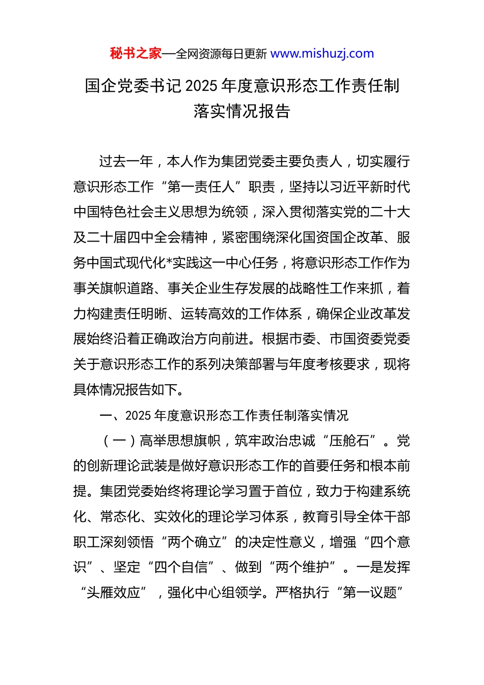 秘书之家—全网资源每日更新 www.mishuzj.com国企党委书记 2025 年度意识形态工作责任制落实情况报告 过去一年,本人作为集团党委主要负责人,切实履行意识形态工作“第一责任人”职责,坚持以习近平新时代中国特色社会主义思想为统领,深入贯彻落实党的二十大及二十届四中全会精神,紧密围绕深化国资国企改革、服务中国式现代化*实践这一中心任务,将意识形态工作作为事关旗帜道路、事关企业生存发展的战略性工作来抓,着力构建责任明晰、运转高效的工作体系,确保企业改革发展始终沿着正确政治方向前进。根据市委、市国资委党委关于意识形态工作的系列决策部署与年度考核要求,现将具体情况报告如下。一、2025 年度意识形态工作责任制落实情况(一)高举思想旗帜,筑牢政治忠诚“压舱石”。党的创新理论武装是做好意识形态工作的首要任务和根本前提。集团党委始终将理论学习置于首位,致力于构建系统化、常态化、实效化的理论学习体系,教育引导全体干部职工深刻领悟“两个确立”的决定性意义,增强“四个意识”、坚定“四个自信”、做到“两个维护”。一是发挥“头雁效应”,强化中心组领学。严格执行“第一议题”秘书之家—全网资源每日更新 www.mishuzj.com制度,全年召开党委会及理论学习中心组学习会议共计*次,第一时间传达学习习近平总书记最新重要讲话和指示批示精神,特别是关于经济工作、国有企业改革发展和党的建设等重要论述。围绕党的二十届四中全会审议通过的《中共中央关于制定国民经济和社会发展第十五个五年规划的建议》,组织专题学习研讨*次,班子成员结合分管领域撰写高质量调研报告*篇,深刻把握党中央对“十五五”时期发展的战略谋划与对国资国企的新要求,切实把学习成果转化为谋划集团“十五五”战略的具体思路。二是推动全员覆盖,深化基层研学。制定并实施了《2025 年度党员职工理论学习计划》,依托“三会一课”、主题党日、线上学习平台等载体,组织开展党的二十届四中全会精神专题宣讲*场,覆盖全体党员和基层骨干。创新开展“书记下午茶”“车间微党课”等学习形式*次,推动党的创新理论进部门、进车间、进班组、进头脑。三是注重学用结合,促进成果转化。将学习宣传贯彻党的二十届四中全会精神与落实集团年度重点任务紧密结合,组织开展“对标‘十五五’规划、谋划高质量发展”大讨论活动,引导干部职工找准工作切入点和发力点。全年通过理论学习,推动解决制约企业发展的瓶颈问题*项,完成技术革新项目*个,有效促进了理论学习成果向企业治理效能和发展动能秘书之家—全网资源每日更新 www.mishuzj.com的转化。(二)扛牢主体责任,拧紧齐抓共管“责任链”。严格落实意识形态工作责任制,是确保各项任务落地见效的关键保障。集团党委牢固树立“抓意识形态工作是本职、不抓是失职、抓不好是渎职”的理念,着力构建党委统一领导、党政齐抓共管、宣传部门组织协调、有关部门分工负责、全体干部职工共同参与的工作格局。一是健全责任体系,明确“任务书”。年初召开专题党委会,研究制定《集团党委 2025 年意识形态工作要点与责任清单》,明确党委书记第一责任、班子成员“一岗双责”及各部门、各子公司的具体责任,将意识形态工作要求细化分解为*项具体任务。修订完善《“三重一大”决策制度实施办法》,确保党组织在重大事项决策中的前置把关作用,从制度源头巩固意识形态阵地。二是强化压力传导,用好“指挥棒”。将意识形态工作纳入年度党建工作考核、领导班子和领导干部年度考核、党组织书记抓基层党建述职评议的重要内容,权重不低于*%。年内召开意识形态工作专题会议*次、分析研判会议*次,定期听取工作汇报,研究解决突出问题。由党委书记牵头,对各子公司意识形态工作责任制落实情况进行专项督查*次,对发现的*个问题进行现场反馈并督促整改到位。三是完善工作机制,织密“防护秘书之家—全网资源每日更新 www.mishuzj.com网”。建立了涵盖舆情监测、分析研判、应急处突、部门协同的意识形态风险防控机制。与市网信部门建立了常态化沟通渠道,严格执行信息发布“三审三校”制度,加强对集团官网、微信公众号、内部刊物及各类工...