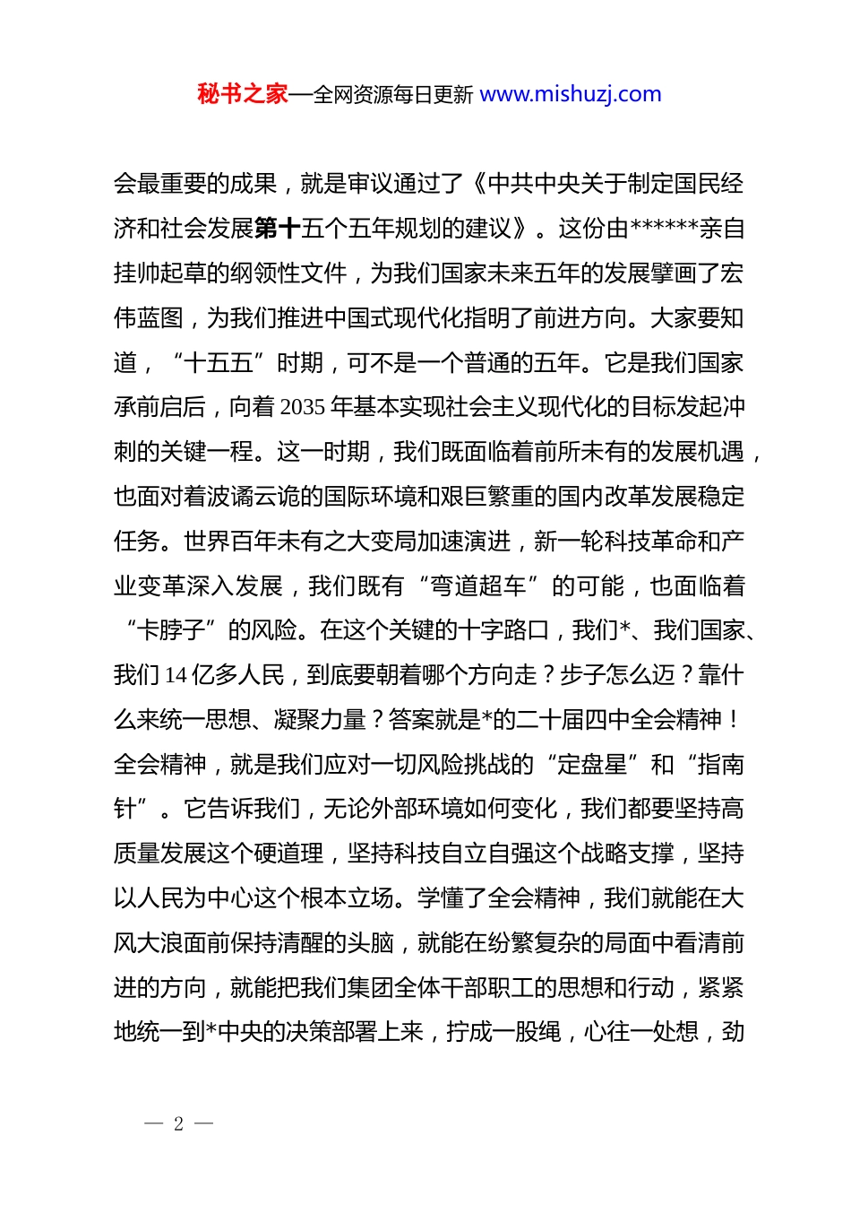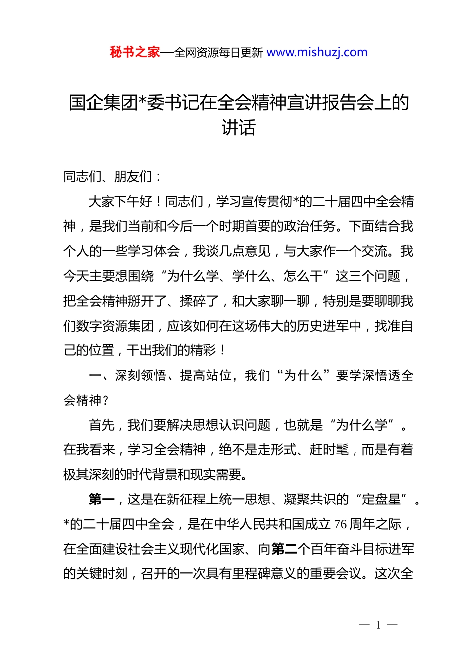 秘书之家—全网资源每日更新 www.mishuzj.com国企集团*委书记在全会精神宣讲报告会上的讲话同志们、朋友们:大家下午好!同志们,学习宣传贯彻*的二十届四中全会精神,是我们当前和今后一个时期首要的政治任务。下面结合我个人的一些学习体会,我谈几点意见,与大家作一个交流。我今天主要想围绕“为什么学、学什么、怎么干”这三个问题,把全会精神掰开了、揉碎了,和大家聊一聊,特别是要聊聊我们数字资源集团,应该如何在这场伟大的历史进军中,找准自己的位置,干出我们的精彩!一、深刻领悟、提高站位,我们“为什么”要学深悟透全会精神?首先,我们要解决思想认识问题,也就是“为什么学”。在我看来,学习全会精神,绝不是走形式、赶时髦,而是有着极其深刻的时代背景和现实需要。第一,这是在新征程上统一思想、凝聚共识的“定盘星”。*的二十届四中全会,是在中华人民共和国成立 76 周年之际,在全面建设社会主义现代化国家、向第二个百年奋斗目标进军的关键时刻,召开的一次具有里程碑意义的重要会议。这次全— 1 —秘书之家—全网资源每日更新 www.mishuzj.com会最重要的成果,就是审议通过了《中共中央关于制定国民经济和社会发展第十五个五年规划的建议》。这份由******亲自挂帅起草的纲领性文件,为我们国家未来五年的发展擘画了宏伟蓝图,为我们推进中国式现代化指明了前进方向。大家要知道,“十五五”时期,可不是一个普通的五年。它是我们国家承前启后,向着 2035 年基本实现社会主义现代化的目标发起冲刺的关键一程。这一时期,我们既面临着前所未有的发展机遇,也面对着波谲云诡的国际环境和艰巨繁重的国内改革发展稳定任务。世界百年未有之大变局加速演进,新一轮科技革命和产业变革深入发展,我们既有“弯道超车”的可能,也面临着“卡脖子”的风险。在这个关键的十字路口,我们*、我们国家、我们 14 亿多人民,到底要朝着哪个方向走?步子怎么迈?靠什么来统一思想、凝聚力量?答案就是*的二十届四中全会精神!全会精神,就是我们应对一切风险挑战的“定盘星”和“指南针”。它告诉我们,无论外部环境如何变化,我们都要坚持高质量发展这个硬道理,坚持科技自立自强这个战略支撑,坚持以人民为中心这个根本立场。学懂了全会精神,我们就能在大风大浪面前保持清醒的头脑,就能在纷繁复杂的局面中看清前进的方向,就能把我们集团全体干部职工的思想和行动,紧紧地统一到*中央的决策部署上来,拧成一股绳,心往一处想,劲— 2 —秘书之家—全网资源每日更新 www.mishuzj.com往一处使。第二,这是在新起点上把握机遇、应对挑战的“金钥匙”。全会《建议》不仅指明了方向,更给出了方法论。它深刻分析了我国发展面临的内外部环境,精准指出了我们的优势、短板和潜力所在。比如,全会强调要加快发展新质生产力,这对于我们这样一家以数字科技为核心的企业来说,是多大的利好?再比如,全会把“深入推进数字中国建设”摆在了战略任务的突出位置这不就是为我们量身打造的历史舞台吗?我们数字资源集团,生逢其时,更要重任在肩。我们是市属重点国企,是支撑保障数字建设和新型能源算力枢纽建设的高科技创新型企业。我们的使命,就是要在数字经济的浪潮中,当好主力军、排头兵。当前,数字建设已经进入了全面形成基本能力的冲刺阶段,市委、市政府对我们寄予厚望。面对这样的历史机遇,我们如果不学深悟透全会精神,就可能看不清政策背后的深意,抓不住产业变革的风口,找不到自身发展的结合点。反过来讲,我们也要看到挑战。市场竞争日益激烈,技术迭代不断加速,我们面临着改革整合的艰巨任务,面临着核心技术“卡脖子”的风险,面临着数据安全、网络安全的严峻考验。这些问题怎么破?答案同样在全会精神里。全会强调要统筹发展和安全,要强化企业科技创新主体地位,要构建全国一体化算力网络,— 3 —秘书之家—全网资源每日更新 www.mishuzj.com这些都为我们破解难题提供了“金钥匙”。所以说,学习全会精神,对我们而言,就是一次精准的战略寻路、一次深刻的能力充电、一次主动的自我革新。第三,这是在实干担当中淬炼*性、提升能力的“磨刀石...