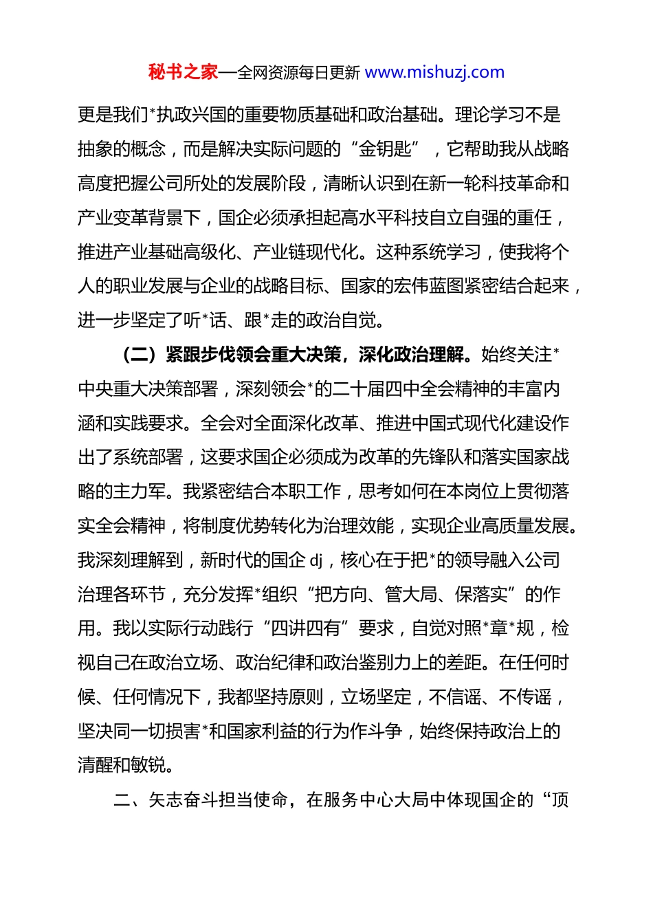 秘书之家—全网资源每日更新 www.mishuzj.com国企入*积极分子 2025 年度思想汇报尊敬的*组织:自被确定为入*积极分子以来,我始终以一名共产*员的标准严格要求自己,坚持不懈地深化理论学习、锤炼*性修养、投身工作实践。在思想、学习、工作和作风建设等方面均取得了一定的进 步,现将具体情况汇报如下:一、持续深化理论武装,在学习贯彻*的创新理论中坚定政治信仰旗帜引领方向,思想照亮前路。我深刻认识到,理论上的清醒是政治上坚定的前提。作为一名渴望加入*组织的积极分子,首要任务是掌握*的创新理论,以科学的世界观和方法论指导实践。(一)深学笃行*的创新理论,筑牢思想根基。坚持将学习贯彻**************思想作为终身课题,特别是紧密结合******关于国有企业改革发展和*的建设的重要论述进行深入研读。我通过参加*组织组织的集中学习、主题*日活动,以及利用“学习强国”等平台进行自学,系统学习了《***谈治国理政》最新卷,认真领会“两个确立”的决定性意义,坚决做到“两个维护”。在学习中,我聚焦国企的战略定位和使命要求,重点学习了关于加快发展新质生产力、深化国资国企改革,以及防范化解重大风险等方面的****精神。我深刻认识到,国有企业不仅是经济组织,秘书之家—全网资源每日更新 www.mishuzj.com更是我们*执政兴国的重要物质基础和政治基础。理论学习不是抽象的概念,而是解决实际问题的“金钥匙”,它帮助我从战略高度把握公司所处的发展阶段,清晰认识到在新一轮科技革命和产业变革背景下,国企必须承担起高水平科技自立自强的重任,推进产业基础高级化、产业链现代化。这种系统学习,使我将个人的职业发展与企业的战略目标、国家的宏伟蓝图紧密结合起来,进一步坚定了听*话、跟*走的政治自觉。(二)紧跟步伐领会重大决策,深化政治理解。始终关注*中央重大决策部署,深刻领会*的二十届四中全会精神的丰富内涵和实践要求。全会对全面深化改革、推进中国式现代化建设作出了系统部署,这要求国企必须成为改革的先锋队和落实国家战略的主力军。我紧密结合本职工作,思考如何在本岗位上贯彻落实全会精神,将制度优势转化为治理效能,实现企业高质量发展。我深刻理解到,新时代的国企 dj,核心在于把*的领导融入公司治理各环节,充分发挥*组织“把方向、管大局、保落实”的作用。我以实际行动践行“四讲四有”要求,自觉对照*章*规,检视自己在政治立场、政治纪律和政治鉴别力上的差距。在任何时候、任何情况下,我都坚持原则,立场坚定,不信谣、不传谣,坚决同一切损害*和国家利益的行为作斗争,始终保持政治上的清醒和敏锐。二、矢志奋斗担当使命,在服务中心大局中体现国企的“顶秘书之家—全网资源每日更新 www.mishuzj.com梁柱”作用思想的提升最终要体现在实践的成效上。作为市属国企的一员,我将理论学习成果转化为推动工作的强大动力,始终把“干事创业、服务人民”作为检验*性的试金石,努力在企业高质量发展和城市运行保障中发挥模范带头作用。(一)聚焦主责主业,以新质生产力赋能国企转型升级。市属国企肩负着保障城市功能运行、提升城市服务品质的重任。在我的本职工作中,我始终以创新驱动发展为核心,积极响应国家关于培育和发展新质生产力的号召。我深知,只有不断创新,才能让企业立于不败之地。在具体业务推进中,我主动承担难度高、要求严的任务,将技术攻关与效率提升作为重点。例如,在参与某项重大基础设施建设项目过程中,我注重引入数字化、智能化管理手段,优化传统施工流程。我们通过应用物联网技术对关键设备的运行状态进行实时监测,通过大数据分析预测项目风险点,不仅大幅缩短了工期,提高了工程质量的精细化水平,还实现了能源消耗和安全事故率的双下降。我认识到,这不仅仅是完成一项技术指标,更是践行国有企业作为科技创新主体的使命,通过技术变革和管理创新,为城市的可持续发展贡献力量。在与同事协作过程中,我主动分享学习成果和技术经验,鼓励团队成员打破思维定势,营造积极向上的创新氛围,力求让*组织的先进性在创新实践中得到充分彰显。秘书之家—全网资源每日更新 www.mishuzj.com(二)坚持...