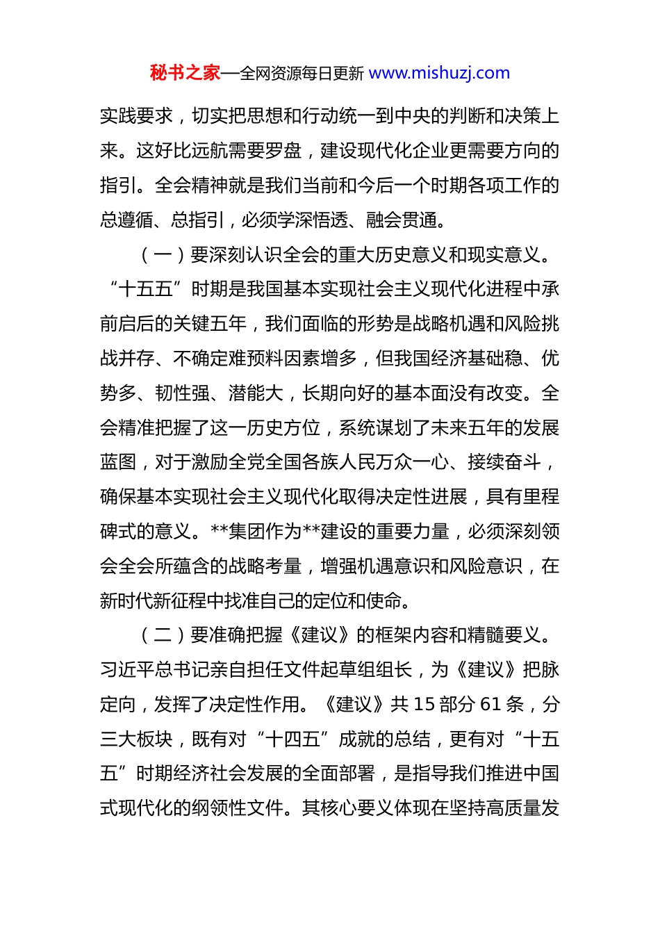 秘书之家—全网资源每日更新 www.mishuzj.com集团党委书记、董事长在党委会传达学习党的二十届四中全会精神时的讲话 同志们:党的二十届四中全会于 2025 年 10 月 20 日至 23 日在北京胜利召开,是在我国即将胜利完成“十四五”规划主要目标任务、进入为 2035 年基本实现社会主义现代化夯实基础、全面发力的关键时期召开的一次极其重要的会议。全会听取和讨论了习近平总书记受中央政治局委托作的工作报告,审议通过了《中共中央关于制定国民经济和社会发展第十五个五年规划的建议》,取得了丰硕的政治成果、理论成果和实践成果,为我们指明了前进方向。我们召开会议,主要目的进一步深入系统地解读全会精神,结合**实际,动员全体干部职工迅速掀起学习宣传贯彻热潮,确保党中央的各项重大决策部署在海南农垦落地生根、开花结果。刚才,我们初步学习了全会公报和相关信息,大家进行了热烈讨论,达成了高度共识。下面,我讲四个部分的内容。一、立足高远,深刻领悟全会核心要义这次全会内涵丰富、思想深邃,我们要站在党和国家事业发展全局的高度,深入理解其历史方位、理论创新和秘书之家—全网资源每日更新 www.mishuzj.com实践要求,切实把思想和行动统一到中央的判断和决策上来。这好比远航需要罗盘,建设现代化企业更需要方向的指引。全会精神就是我们当前和今后一个时期各项工作的总遵循、总指引,必须学深悟透、融会贯通。(一)要深刻认识全会的重大历史意义和现实意义。“十五五”时期是我国基本实现社会主义现代化进程中承前启后的关键五年,我们面临的形势是战略机遇和风险挑战并存、不确定难预料因素增多,但我国经济基础稳、优势多、韧性强、潜能大,长期向好的基本面没有改变。全会精准把握了这一历史方位,系统谋划了未来五年的发展蓝图,对于激励全党全国各族人民万众一心、接续奋斗,确保基本实现社会主义现代化取得决定性进展,具有里程碑式的意义。**集团作为**建设的重要力量,必须深刻领会全会所蕴含的战略考量,增强机遇意识和风险意识,在新时代新征程中找准自己的定位和使命。(二)要准确把握《建议》的框架内容和精髓要义。习近平总书记亲自担任文件起草组组长,为《建议》把脉定向,发挥了决定性作用。《建议》共 15 部分 61 条,分三大板块,既有对“十四五”成就的总结,更有对“十五五”时期经济社会发展的全面部署,是指导我们推进中国式现代化的纲领性文件。其核心要义体现在坚持高质量发秘书之家—全网资源每日更新 www.mishuzj.com展为主题,以中国式现代化全面推进中华民族伟大复兴。我们要深刻理解《建议》中关于建设现代化产业体系、加快科技自立自强、扩大高水平对外开放、促进共同富裕、统筹发展和安全等一系列战略部署,将其作为我们谋划未来发展的根本依据。(三)要深入理解“阶梯式递进”的现代化进程规律。全会指出,实现社会主义现代化是一个阶梯式递进、不断发展进步的历史过程,需要不懈努力、接续奋斗。这体现了事物发展的客观规律,启示我们事业的发展不可能一蹴而就,必须一步一个脚印,扎实前行。对于**而言,改革发展的任务艰巨繁重,正需要这种“阶梯式”的进取精神,既要勇于攀登,也要脚踏实地,每一个阶段都要打下坚实的基础,才能最终实现高质量跨越式发展。我们要摒弃急功近利的思想,树立长期奋斗的信念,按照全会指引的方向,稳扎稳打,积小胜为大胜。(四)要牢固树立以人民为中心的发展思想。全会将“人民生活品质不断提高”作为“十五五”时期的主要目标之一,并部署了一系列注重均衡性、可及性的政策举措,充分彰显了我们党始终不变的为民初心。**的发展,根基在职工群众,力量在职工群众。我们谋划任何工作,都要思考是否有利于增进垦区职工群众的福祉,是否能让秘书之家—全网资源每日更新 www.mishuzj.com职工群众有更多的获得感、幸福感、安全感。要将推动垦地协调发展、促进职工增收、改善生产生活条件作为贯彻落实全会精神的重要着力点,让改革发展成果更多更公平惠及全体垦区人民。二、聚焦重点,科学谋划**发展蓝图“一分部署,九分落实”。全会的宏伟蓝图能否变为现实,关键看我们如何...