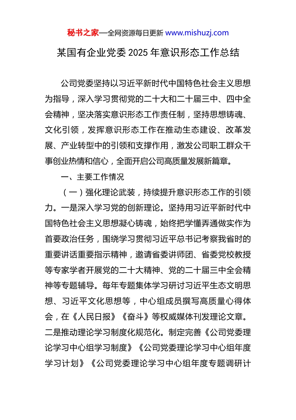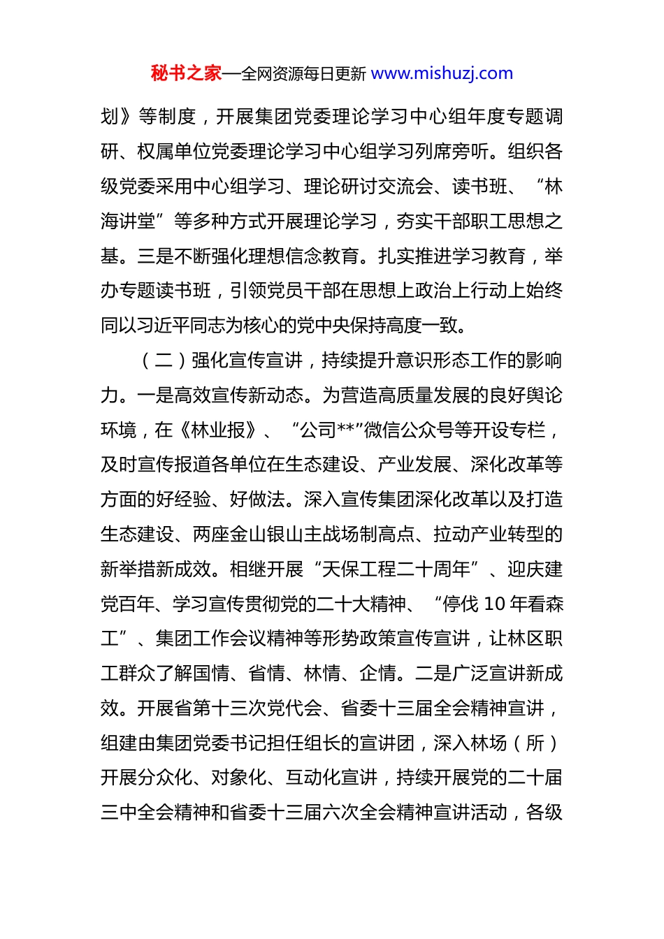 秘书之家—全网资源每日更新 www.mishuzj.com某国有企业党委 2025 年意识形态工作总结 公司党委坚持以习近平新时代中国特色社会主义思想为指导,深入学习贯彻党的二十大和二十届三中、四中全会精神,坚决落实意识形态工作责任制,坚持思想铸魂、文化引领,发挥意识形态工作在推动生态建设、改革发展、产业转型中的引领和支撑作用,激发公司职工群众干事创业热情和信心,全面开启公司高质量发展新篇章。一、主要工作情况(一)强化理论武装,持续提升意识形态工作的引领力。一是深入学习党的创新理论。坚持用习近平新时代中国特色社会主义思想凝心铸魂,始终把学懂弄通做实作为首要政治任务,围绕学习贯彻习近平总书记考察我省时的重要讲话重要指示精神,邀请省委讲师团、省委党校教授等专家学者开展党的二十大精神、党的二十届三中全会精神等专题辅导。每年专题集体学习研讨习近平生态文明思想、习近平文化思想等,中心组成员撰写高质量心得体会,在《人民日报》《奋斗》等权威媒体刊发理论文章。二是推动理论学习制度化规范化。制定完善《公司党委理论学习中心组学习制度》《公司党委理论学习中心组年度学习计划》《公司党委理论学习中心组年度专题调研计秘书之家—全网资源每日更新 www.mishuzj.com划》等制度,开展集团党委理论学习中心组年度专题调研、权属单位党委理论学习中心组学习列席旁听。组织各级党委采用中心组学习、理论研讨交流会、读书班、“林海讲堂”等多种方式开展理论学习,夯实干部职工思想之基。三是不断强化理想信念教育。扎实推进学习教育,举办专题读书班,引领党员干部在思想上政治上行动上始终同以习近平同志为核心的党中央保持高度一致。(二)强化宣传宣讲,持续提升意识形态工作的影响力。一是高效宣传新动态。为营造高质量发展的良好舆论环境,在《林业报》、“公司**”微信公众号等开设专栏,及时宣传报道各单位在生态建设、产业发展、深化改革等方面的好经验、好做法。深入宣传集团深化改革以及打造生态建设、两座金山银山主战场制高点、拉动产业转型的新举措新成效。相继开展“天保工程二十周年”、迎庆建党百年、学习宣传贯彻党的二十大精神、“停伐 10 年看森工”、集团工作会议精神等形势政策宣传宣讲,让林区职工群众了解国情、省情、林情、企情。二是广泛宣讲新成效。开展省第十三次党代会、省委十三届全会精神宣讲,组建由集团党委书记担任组长的宣讲团,深入林场(所)开展分众化、对象化、互动化宣讲,持续开展党的二十届三中全会精神和省委十三届六次全会精神宣讲活动,各级秘书之家—全网资源每日更新 www.mishuzj.com宣讲团累计覆盖 3 万余人次。持续办好具有森工特色的“林海讲堂”,让党的创新理论“飞入寻常百姓家”。三是全面展示好形象。加强网络意识形态工作,积极开展网上正面舆论引导工作,多人获评中央网信办“优秀网评员(先进工作者)”、省委网信办“森工好网民”。充分利用《林业报》、微信公众号等阵地持续推出有深度、有影响的正面宣传报道,公司微信公众号荣获省委网信办授予的全省新媒体“优秀账号”。(三)强化文化浸润,持续提升意识形态工作的感染力。一是突出文化引领。公司注重从深厚独特的林区文化中挖掘思想政治教育内涵,坚持在培育和践行社会主义核心价值观中汲取力量源泉,形成林区干部职工高度思想认同根基。集团党委立足历史和现实,打造“树人树木,开物成务”的企业核心文化,不断挖掘森工精神、雪乡精神、铁军精神等内涵。建成全国林业系统首个集勤政教育、廉洁文化、生态建设成果于一体的综合性展馆,组织职工群众到“勤廉森工”教育基地参观学习。打造“4·20”森工植树日生态文化,在社会各界形成了良好的示范和带动效应,扩绿、兴绿、护绿已成为全社会共识。“红色领航、同唱国歌”活动持续开展,教育广大党员干部传承红色基因、厚植爱国情怀。“林海党旗红”系列活动深入人秘书之家—全网资源每日更新 www.mishuzj.com心,在全社会产生积极反响。二是强化文明创建。2025年,4 个单位当选新一届“全国文明单位”,3 个单位顺利通过“全国文明单位”复评,19 个单位荣获省级文明单...