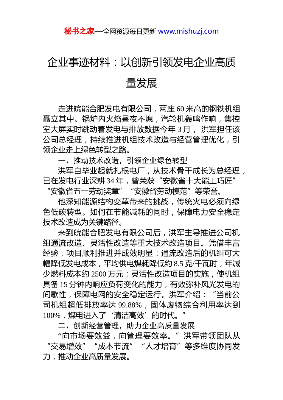 秘书之家—全网资源每日更新 www.mishuzj.com企业事迹材料:以创新引领发电企业高质量发展走进皖能合肥发电有限公司,两座 60 米高的钢铁机组矗立其中。锅炉内火焰昼夜不熄,汽轮机轰鸣作响,集控室大屏实时跳动着发电与排放数据今年 3 月, 洪军担任该公司总经理,持续推进机组技术改造与经营管理优化,引领企业走上绿色转型之路。一、推动技术改造,引领企业绿色转型洪军自毕业起就扎根电厂,从技术骨干成长为总经理,已在发电行业深耕 34 年,曾荣获“安徽省十大能工巧匠”“安徽省五一劳动奖章”“安徽省劳动模范”等荣誉。他深知能源结构变革带来的挑战,传统火电必须向绿色低碳转型。如何在节能减耗的同时,保障电力安全稳定技术改造成为关键路径。来到皖能合肥发电有限公司后,洪军主导推进公司机组通流改造、灵活性改造等重大技术改造项目。凭借丰富经验,项目顺利推进并成效明显:通流改造后的机组可大幅降低发电成本,平均供电煤耗降低约 8.5 克/千瓦时,年减少燃料成本约 2500 万元;灵活性改造项目的实施,使机组具备 15 分钟内响应负荷变化的能力,有效弥补风光发电的间歇性,保障电网的安全稳定运行。洪军介绍:“当前公司机组超低排放率达 99.88%,固体废物综合利用率达到100%,煤电进入了‘清洁高效’的时代。”二、创新经营管理,助力企业高质量发展“向市场要效益,向管理要效率。”洪军带领团队从“交易增效”“成本节流”“人才培育”等多维度协同发力,推动企业高质量发展。秘书之家—全网资源每日更新 www.mishuzj.com在交易增效方面,通过构建精细化报价管理体系,最大化挖掘电力交易价值。他主导构建了一套以专业团队为核心、以数据分析和决策流程为支撑的精细化报价管理体系,提升电力营销的科学性和前瞻性。在成本节流方面,通过优化煤炭采购节奏,再通过科学掺配、提升储煤管理水平等“拧毛巾”措施,使标煤单价同比下降 87 元/吨,有效降低燃料成本。在人才培育上,他招聘管培生作为人才储备,创立“皖合课堂”并授课,推行“导师带徒”,设立技术攻关奖励。短短数月,一套“招聘+培训+传帮带+激励”的组合拳,让员工积极性显著提升,为公司可持续发展注入动能。截至今年 9 月,皖能合肥发电有限公司发电量达 xx 亿千瓦时,营业总额实 xx 亿元,盈利 xx 万元。在汽轮机旁观察实时温度,在集中控制室关注排放与实发总负荷洪军的身影遍布厂区各个关键岗位。如今,洪军正带领企业推进供热带冷、冷链物流等新业态,推动多元发展。展望未来,他表示,将努力把企业打造为“保障有力、绿色低碳、治理现代” 的先进发电企业,在构建清洁低碳、安全高效的新型能源体系中展现国企担当。