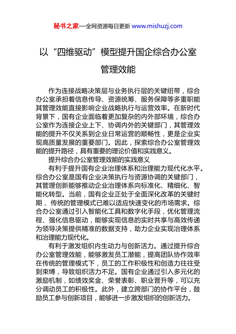 秘书之家—全网资源每日更新 www.mishuzj.com以“四维驱动”模型提升国企综合办公室管理效能作为连接战略决策层与业务执行层的关键纽带,综合办公室承担着信息传导、资源统筹、服务保障等多重职能其管理效能直接影响企业战略执行与运营效率。在新时代背景下,国有企业面临着更加复杂的内外部环境,综合办公室作为连接企业上下、协调内外的关键部门,其管理效能的提升不仅关系到企业日常运营的顺畅性,更是企业实现高质量发展的重要部门。因此,探索综合办公室管理效能的提升路径,具有重要的理论价值和实践意义。提升综合办公室管理效能的实践意义有利于提升国有企业治理体系和治理能力现代化水平。综合办公室是国有企业决策执行与资源协调的关键部门,其管理创新能够推动企业治理体系向标准化、精细化、智能化转型。当前,国有企业正处于全面深化改革的关键时期, 传统的管理模式已难以适应快速变化的市场需求。综合办公室通过引入智能化工具和数字化手段,优化管理流程、强化信息驱动,能够实现信息的实时共享与高效传递为领导决策提供精准的数据支持,助力企业实现治理体系和治理能力现代化。有利于激发组织内生动力与创新活力。通过提升综合办公室管理效能,能够激发员工潜能,提高团队协作效率在传统的管理模式下,员工的工作积极性和创造力往往受到束缚,导致组织活力不足。国有企业通过引入多元化的激励机制,如绩效奖金、荣誉表彰、职业晋升等,可以充分调动员工的积极性。此外,建立跨部门的协作平台,鼓励员工参与创新项目,能够进一步激发组织的创新活力。秘书之家—全网资源每日更新 www.mishuzj.com有利于适应新时代国企发展需求。随着信息技术快速发展,传统的办公方式已无法满足高效、便捷的需求,数字化转型已成为国企改革的必然趋势。综合办公室通过引入智能办公系统、优化运用信息设备等措施,可显著提升公文处理、会议管理等核心业务效率,例如,通过引入人工智能技术,可以实现公文的自动分类和智能归档,减少人工操作的时间成本;通过视频会议系统,可以实现跨地域的实时沟通,降低差旅成本。这些数字化手段不仅提升了办公效率,也为企业的可持续发展奠定了坚实基础。提升综合办公室管理效能的实践方法与效果基于 pdca 循环理论与价值链分析,本文结合大庆钻探工程有限公司固井公司提升综合办公室管理实践,提出涵盖技术赋能、流程重构、人才培养、文化塑造四个维度的综合办公室管理创新“四维驱动”模型,该模型通过系统化的方法,将管理创新贯穿于综合办公室的各个环节,有效解决了当前国企综合办公室管理实践中的突出问题,实现了管理效能的全面提升。技术赋能,构建智能化办公体系数字系统办文。将公文管理接入集团综合办公管理平台,非涉密文件全部在网上办理。建立公文提醒督办机制每日由负责文书的员工在工作群发送督办提醒通知,特殊紧急文件通过电话督办,办文效率得到显著提高,年均接收办理文件 800 余份,平均每个工作日办理文件 3.2 份。此外,通过引入 ocr 技术, 实现了非涉密公文的快速扫描和数字化处理,进一步缩短了文件处理周期。同时,数字系统还具备智能检索功能,员工可以通过关键词快速定位所需文件, 大幅提升了信息检索效率。网络系统办会。充分运用腾讯会议等线上平台,运用投影、屏幕共享等方式,减少会议文件打印,保障了会议效果,提高了会议效率,节约了会议成本。以 5 个外部市场,每个市场年均参会 10 次测算,年均节省费用 25 万元以上。秘书之家—全网资源每日更新 www.mishuzj.com此外, 通过引入会议管理系统,实现了会议预约、通知等环节的自动化管理,减少了人工协调的工作量。信息系统办事。根据业务需要,建立不同业务工作群,实现工作信息“一键传达”,沟通效率得到极大提高。非敏感工作利用网络共享文档,节省汇总整理环节,提高工作效率。通过信息化办公软件,实现了任务的在线分配和进度跟踪,团队成员可以实时更新工作状态,确保按时完成任务。流程重构,实现标准化与效率化建设制度体系。梳理企业行政办公需要的公文处理、印信管理、**管理、会议管理等 6 大类业务管理制度,汇编成《...