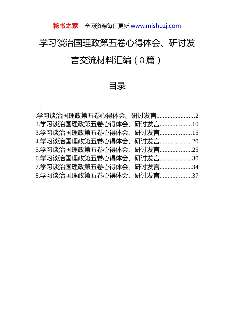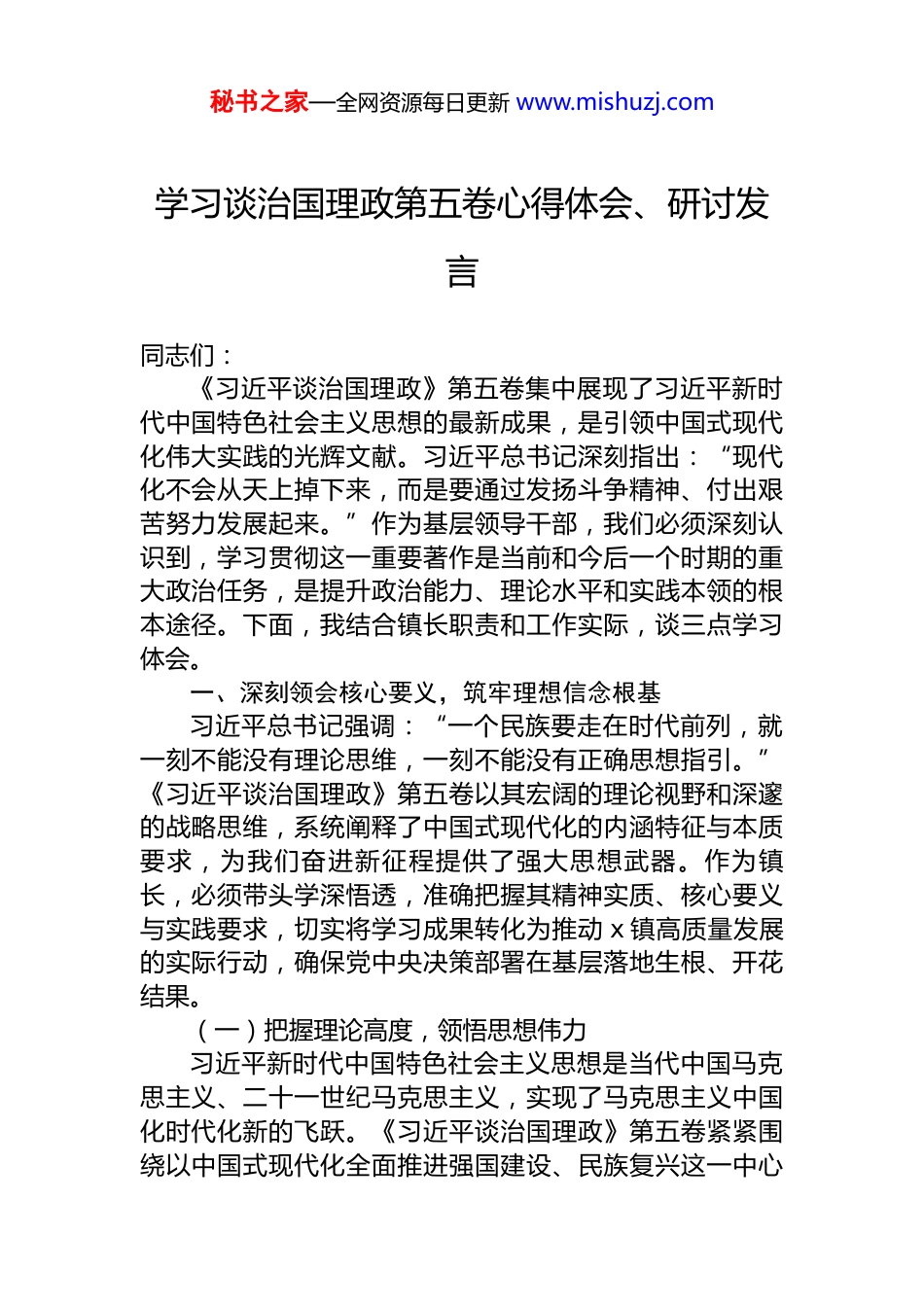 秘书之家—全网资源每日更新 www.mishuzj.com学习谈治国理政第五卷心得体会、研讨发言交流材料汇编(8 篇)目录1.学习谈治国理政第五卷心得体会、研讨发言........................22.学习谈治国理政第五卷心得体会、研讨发言....................103.学习谈治国理政第五卷心得体会、研讨发言....................154.学习谈治国理政第五卷心得体会、研讨发言....................205.学习谈治国理政第五卷心得体会、研讨发言....................256.学习谈治国理政第五卷心得体会、研讨发言....................307.学习谈治国理政第五卷心得体会、研讨发言....................348.学习谈治国理政第五卷心得体会、研讨发言....................37秘书之家—全网资源每日更新 www.mishuzj.com学习谈治国理政第五卷心得体会、研讨发言同志们:《习近平谈治国理政》第五卷集中展现了习近平新时代中国特色社会主义思想的最新成果,是引领中国式现代化伟大实践的光辉文献。习近平总书记深刻指出:“现代化不会从天上掉下来,而是要通过发扬斗争精神、付出艰苦努力发展起来。”作为基层领导干部,我们必须深刻认识到,学习贯彻这一重要著作是当前和今后一个时期的重大政治任务,是提升政治能力、理论水平和实践本领的根本途径。下面,我结合镇长职责和工作实际,谈三点学习体会。一、深刻领会核心要义,筑牢理想信念根基习近平总书记强调:“一个民族要走在时代前列,就一刻不能没有理论思维,一刻不能没有正确思想指引。”《习近平谈治国理政》第五卷以其宏阔的理论视野和深邃的战略思维,系统阐释了中国式现代化的内涵特征与本质要求,为我们奋进新征程提供了强大思想武器。作为镇长,必须带头学深悟透,准确把握其精神实质、核心要义与实践要求,切实将学习成果转化为推动 x 镇高质量发展的实际行动,确保党中央决策部署在基层落地生根、开花结果。(一)把握理论高度,领悟思想伟力习近平新时代中国特色社会主义思想是当代中国马克思主义、二十一世纪马克思主义,实现了马克思主义中国化时代化新的飞跃。《习近平谈治国理政》第五卷紧紧围绕以中国式现代化全面推进强国建设、民族复兴这一中心秘书之家—全网资源每日更新 www.mishuzj.com任务,深刻回答了关系党和国家事业发展的重大理论与实践问题。其理论贡献体现在多个维度:一是深化了对共产党执政规律、社会主义建设规律、人类社会发展规律的认识,提出了一系列原创性、标志性的新理念新思想新战略;二是系统阐述了中国式现代化的中国特色、本质要求和重大原则,打破了“现代化等于西方化”的迷思,为广大发展中国家独立自主迈向现代化提供了全新选择;三是强调了高质量发展是全面建设社会主义现代化国家的首要任务,必须完整、准确、全面贯彻新发展理念,着力推动经济实现质的有效提升和量的合理增长。学习这些内容,要求我们必须坚持读原著、学原文、悟原理,深刻理解其时代背景、理论渊源、实践基础,不断增强对党的创新理论的政治认同、思想认同、理论认同、情感认同,从而更加自觉地用以武装头脑、指导实践、推动工作。(二)拓展认识深度,明晰战略部署《习近平谈治国理政》第五卷通篇贯穿着强烈的历史自觉和战略自信,对党和国家事业发展作出了全局性、长远性、系统性的战略谋划。其战略部署具有鲜明的特征:一是突出系统性,强调各项工作都要服务于和融入中国式现代化这个最大的政治,统筹推进“五位一体”总体布局和协调推进“四个全面”战略布局;二是体现实践性,聚焦进一步全面深化改革、扩大高水平对外开放、因地制宜发展新质生产力、一体推进教育科技人才事业发展等重大课题,提出了明确的路线图和时间表;三是富于斗争性,要求全党同志务必敢于斗争、善于斗争,通过顽强斗争打开事业发展新天地。对于乡镇工作而言,我们必须深刻领会这些战略部署背后的深远考量,自觉将 x 镇的发展置于国家发展和民族复兴的大局中去谋划和推进,确保我们的工作不偏向、不掉队、不落伍,始终沿着正确方向前进。(三)强化实践维度,汲取奋进力量理论的价值在于指导实践,学习的目的全在于运用。秘书之家—全网资源每日...