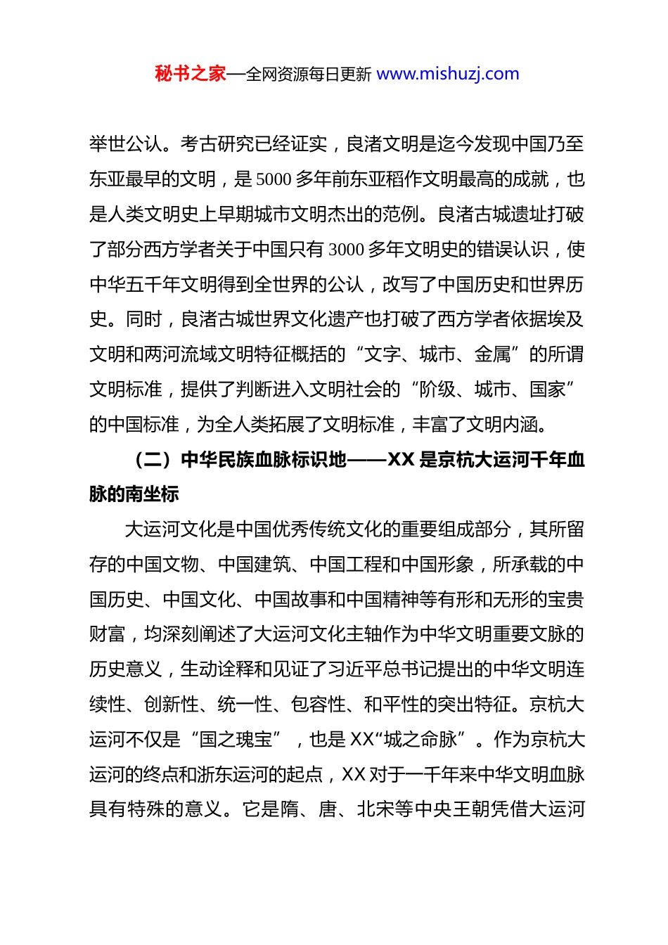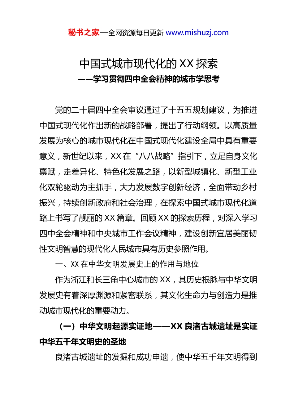 秘书之家—全网资源每日更新 www.mishuzj.com中国式城市现代化的 XX 探索——学习贯彻四中全会精神的城市学思考党的二十届四中全会审议通过了十五五规划建议,为推进中国式现代化作出新的战略部署,提出了行动纲领。以高质量发展为核心的城市现代化在中国式现代化建设全局中具有重要意义,新世纪以来,XX 在“八八战略”指引下,立足自身文化禀赋,走差异化、特色化发展之路,以新型城镇化、新型工业化双轮驱动为主抓手,大力发展数字创新经济,全面带动乡村振兴,持续创新政府和社会治理,在探索中国式城市现代化道路上书写了靓丽的 XX 篇章。回顾 XX 的探索历程,对深入学习四中全会精神和中央城市工作会议精神,建设创新宜居美丽韧性文明智慧的现代化人民城市具有历史参照作用。一、XX 在中华文明发展史上的作用与地位作为浙江和长三角中心城市的 XX,其历史根脉与中华文明发展史有着深厚渊源和紧密联系,其文化生命力与创造力是推动城市现代化的重要动力。(一)中华文明起源实证地——XX 良渚古城遗址是实证中华五千年文明史的圣地良渚古城遗址的发掘和成功申遗,使中华五千年文明得到秘书之家—全网资源每日更新 www.mishuzj.com举世公认。考古研究已经证实,良渚文明是迄今发现中国乃至东亚最早的文明,是 5000 多年前东亚稻作文明最高的成就,也是人类文明史上早期城市文明杰出的范例。良渚古城遗址打破了部分西方学者关于中国只有 3000 多年文明史的错误认识,使中华五千年文明得到全世界的公认,改写了中国历史和世界历史。同时,良渚古城世界文化遗产也打破了西方学者依据埃及文明和两河流域文明特征概括的“文字、城市、金属”的所谓文明标准,提供了判断进入文明社会的“阶级、城市、国家”的中国标准,为全人类拓展了文明标准,丰富了文明内涵。(二)中华民族血脉标识地——XX 是京杭大运河千年血脉的南坐标大运河文化是中国优秀传统文化的重要组成部分,其所留存的中国文物、中国建筑、中国工程和中国形象,所承载的中国历史、中国文化、中国故事和中国精神等有形和无形的宝贵财富,均深刻阐述了大运河文化主轴作为中华文明重要文脉的历史意义,生动诠释和见证了习近平总书记提出的中华文明连续性、创新性、统一性、包容性、和平性的突出特征。京杭大运河不仅是“国之瑰宝”,也是 XX“城之命脉”。作为京杭大运河的终点和浙东运河的起点,XX 对于一千年来中华文明血脉具有特殊的意义。它是隋、唐、北宋等中央王朝凭借大运河秘书之家—全网资源每日更新 www.mishuzj.com“漕运”、以南北互通维系中央政权的典型见证,也是古代中国经济重心南移、成就灿烂江南文化的人文渊薮。(三)东方山水文化典范地——XX 西湖是中国传统文化和东方审美的典范之作XX 西湖承载着悠久的历史,积淀着深厚的文化,本质上是一种以中国传统文化为核心、以 XX 地域文化为特色,不断演进、始终活着的文化形态。既是自然的杰作,也是人工的造化,是一个以山水等物质世界为依托、以儒家审美导向为基础创造出来的美的典范,是东方传统文化“天人合一”理念与实践的结晶。西湖的自然美折射出中国传统哲学、美学、人文、建筑等诸多文化理念,西湖的人文美则渗透了许多自然的、物候的意象。作为自然和文化高度复合的产物,西湖是历史上最能体现中国传统文化核心价值的审美实体,也是东方审美体系中最具经典性的文化景观。历代西湖山水文化和文学艺术对中国影响深远,并对东亚园林、文学、艺术和审美文化也产生了深刻影响。(四)中华民族和平统一和爱国主义高地——XX 吴越国“纳土归宋”开创了维护国家统一和民族利益的先河XX 历史上的第一次大发展,是在五代十国的吴越国时期。吴越国主第三代选择“纳土归宋”,与北宋合二为一,使国家秘书之家—全网资源每日更新 www.mishuzj.com实现了和平统一,百姓臣民避免了生灵涂炭,经济社会持续繁荣发展。王室三千人北上开封,形成了中华南北文化的又一次大合流。南宋定都临安(XX),不仅使文化重心回到江南,而且受到吴越国文化的深刻影响,维护国家统一的爱国主义成为文化主流,元明清代再未发生过宋之前的历次国家民...