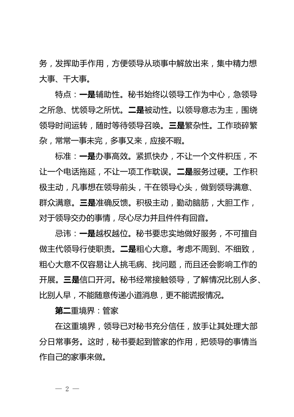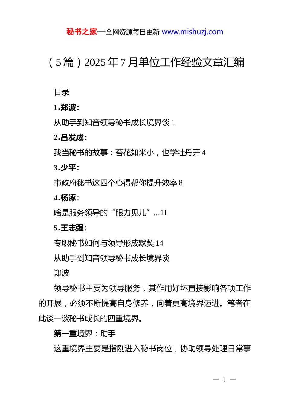 秘书之家—全网资源每日更新 www.mishuzj.com(5 篇)2025 年 7 月单位工作经验文章汇编目录1.郑波:从助手到知音领导秘书成长境界谈 12.吕发成:我当秘书的故事:苔花如米小,也学牡丹开 43.少平:市政府秘书这四个心得帮你提升效率 84.杨涿:啥是服务领导的“眼力见儿”…115.王志强:专职秘书如何与领导形成默契 14从助手到知音领导秘书成长境界谈郑波领导秘书主要为领导服务,其作用好坏直接影响各项工作的开展,必须不断提高自身修养,向着更高境界迈进。笔者在此谈一谈秘书成长的四重境界。第一重境界:助手这重境界主要是指刚进入秘书岗位,协助领导处理日常事— 1 —务,发挥助手作用,方便领导从琐事中解放出来,集中精力想大事、干大事。特点:一是辅助性。秘书始终以领导工作为中心,急领导之所急、忧领导之所忧。二是被动性。以领导意志为主,围绕领导时间运转,随时等待领导召唤。三是繁杂性。工作琐碎繁杂,常常一事未完,多事又来,应接不暇。标准:一是办事高效。紧抓快办,不让一个文件积压,不让一个电话拖延,不让一项工作耽误。二是服务过硬。工作积极主动,凡事想在领导前头,干在领导心头,做到领导满意、群众满意。三是准确反馈。积极主动,勤动脑筋,大胆工作,对于领导交办的事情,尽心尽力并且件件有回音。忌讳:一是越权越位。秘书要忠实地做好服务,不可擅自做主代领导行使职责。二是粗心大意。考虑不周到、不细致,粗心大意不仅容易让人挑毛病、找问题,而且还会影响工作的开展。三是信口开河。秘书经常接触领导,了解情况比别人多、比别人早,不能随意传递小道消息,更不能谎报情况。第二重境界:管家在这重境界,领导已对秘书充分信任,放手让其处理大部分日常事务。这时,秘书要起到管家的作用,把领导的事情当作自己的家事来做。— 2 —秘书之家—全网资源每日更新 www.mishuzj.com特点:一是举轻若重。每件事都要明确做什么、为什么做、谁来做、何时做、何处做、怎么做、做到什么程度,即用“5w2h”分析法办完办好。二是周到细致。对每个环节和步骤都要前思后想、深思细想,真正做到周全细致,避免疏漏。三是善于协调。秘书要同方方面面保持良好沟通,注意谦虚低调,主动汇报、衔接。遇到冲突时尽可能寻找重合点,让各方都能满意认可,从而方便领导开展工作。标准:一是遵规守纪。dj 国法是最大的规矩,时常提醒自己能干什么、不能干什么,做到知法、知理、知畏。二是井井有条。权衡大事小事、急事缓事,要项目化管理、链条式推进,有条不紊开展各项工作。三是敬业奉献。用极其用心的态度对待每项工作,做到精准精细精到,不管何时,只要有命令,马上就办,办出水平。忌讳:一是狐假虎威。秘书处在聚光灯下,需要格外小心谨慎,不可以身居“要职”呼风唤雨。二是优柔寡断。出现超出预见、难以料理的事情,不可瞻前顾后、顾虑重重。三是心理失衡。秘书时常身处矛盾交汇处,难免受到委屈,切忌愤愤不平。第三重境界:高参进入这重境界的秘书已经是领导左右手,须在领导需要时— 3 —给出恰当建议,辅助作出科学合理的决策。特点:一是信得过。领导需要与人商量问题时,第一时间想到的就是高参,秘书要成为信得过的高参并设身处地为领导出谋划策。二是离不开。秘书接到工作,能在第一时间作出较为准确的判断,提出应变方案,供领导决策参考。三是用得上。秘书要准确吃透文件精神和上级领导指示,当领导需要时,可以随时提出解决问题的思路及方案。标准:一是超前。善于站在时代潮头看问题,敏锐判断时代发展大势,紧紧围绕领导关注的重点,结合具体工作给出富有预见性的方案。二是精准。筛选、捕捉领导最关心、最急切需要解决的问题,多谋并参,供领导选择。三是实用。决策前站在全局和领导的高度出主意,决策中拾遗补阙、完善决策,决策后站在受众的角度审视,提高可操作性。忌讳:一是不合口味。习惯从自身出发,提的意见建议参不到领导的心坎上。二是不合时宜。已经出台的政策、已经解决的诉求再提出来就不合适。三是不合实情。看到别地的好经验,不作“本土化”调研,不经深思熟虑就提出。第四重境界:知音这是一重可遇不可求...