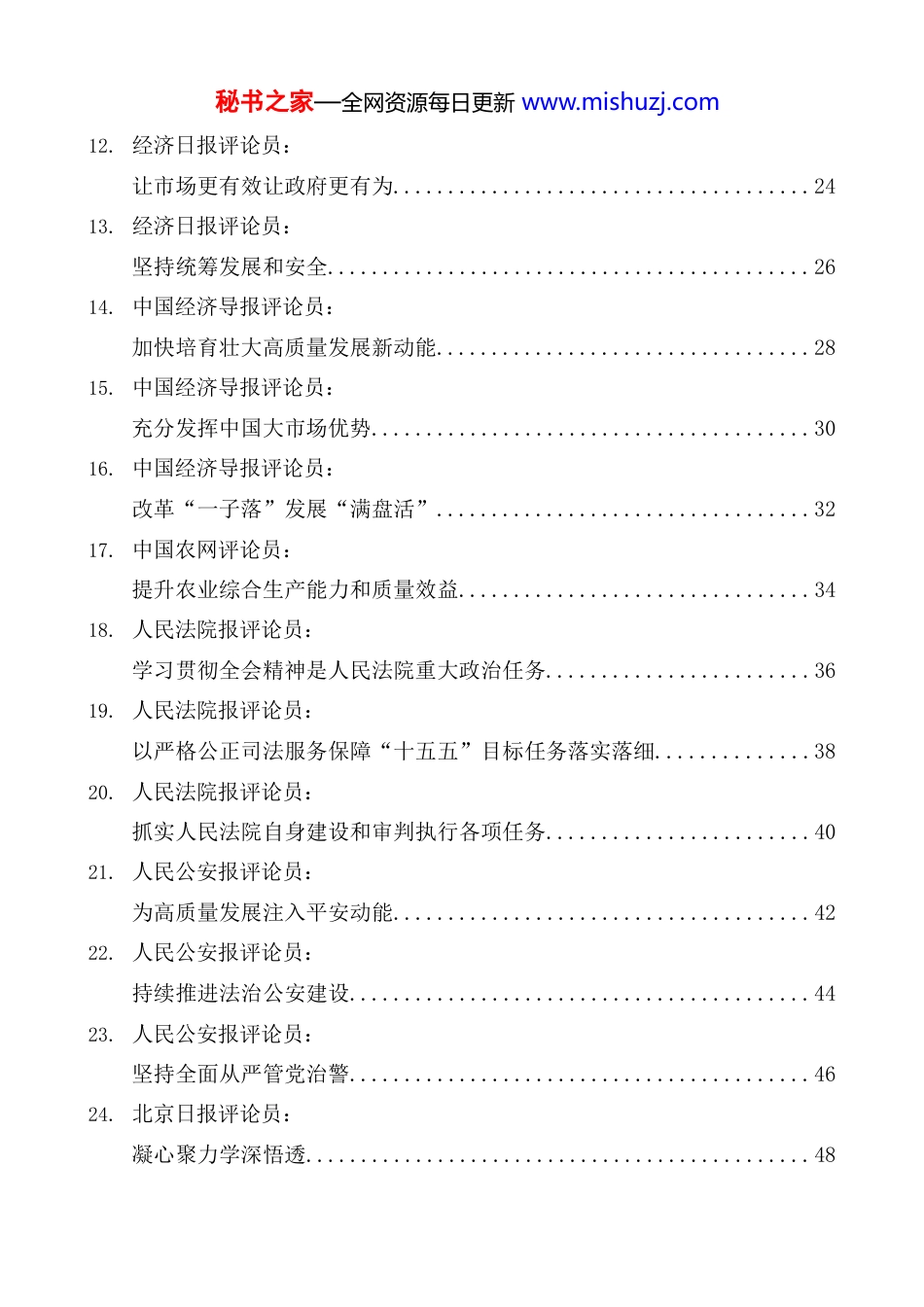 秘书之家—全网资源每日更新 www.mishuzj.com目 录一、中央级媒体评论员文章1. 人民日报评论员: 以推动高质量发展为主题,因地制宜发展新质生产力..................1 2. 人民日报评论员: 加快构建新发展格局,牢牢把握发展主动权..........................3 3. 人民日报评论员: 保障和改善民生,推动全体人民共同富裕迈出坚实步伐................5 4. 人民日报评论员: 在发展中固安全,在安全中谋发展..................................7 5. 人民日报评论员: 坚持党的全面领导,为推进中国式现代化凝聚磅礴力量................9 6. 新华社评论员: 让现代化建设成果更多更公平惠及全体人民........................11 7. 新华社评论员: 牢牢把握推动高质量发展这个主题.................................13 8. 新华社评论员: 以全面深化改革增动力激活力.....................................16 9. 新华社评论员: 坚持有效市场和有为政府相结合...................................18 10. 新华社评论员: 更好统筹发展和安全两件大事....................................20 11. 经济日报评论员: 全面推动建设强大国内市场......................................22 秘书之家—全网资源每日更新 www.mishuzj.com12. 经济日报评论员: 让市场更有效让政府更有为......................................24 13. 经济日报评论员: 坚持统筹发展和安全............................................26 14. 中国经济导报评论员: 加快培育壮大高质量发展新动能..................................28 15. 中国经济导报评论员: 充分发挥中国大市场优势........................................30 16. 中国经济导报评论员: 改革“一子落”发展“满盘活”..................................32 17. 中国农网评论员: 提升农业综合生产能力和质量效益................................34 18. 人民法院报评论员: 学习贯彻全会精神是人民法院重大政治任务........................36 19. 人民法院报评论员: 以严格公正司法服务保障“十五五”目标任务落实落细..............38 20. 人民法院报评论员: 抓实人民法院自身建设和审判执行各项任务........................40 21. 人民公安报评论员: 为高质量发展注入平安动能......................................42 22. 人民公安报评论员: 持续推进法治公安建设..........................................44 23. 人民公安报评论员: 坚持全面从严管党治警..........................................46 24. 北京日报评论员: 凝心聚力学深悟透..............................................48 秘书之家—全网资源每日更新 www.mishuzj.com二、省级媒体评论员文章25. 北京日报评论员: 坚定信心接续奋斗..............................................50 26. 北京日报评论员: 牢记使命担当作为..............................................52 27. 南方日报评论员: 加快构建更具国际竞争力的现代化产业体系........................54 28. 南方日报评论员: 以高水平科技自立自强引领发展新质生产力........................57 29. 南方日报评论员: 建设强大国内市场加快构建新发展格局............................59 30. 南方日报评论员: 加快构建高水平社会主义市场经济体制............................62 31. 南方日报评论员: 扩大高水平对外开放开创合作共赢新局面..........................64 32. 南方日报评论员: 优先补上农业农村现代化这块最大短板............................66 33. 南方日报评论员: 发挥“四大战略”叠加效应促进区域协调发展......................68 34. 南方日报评论员: 激发创新创造活力加快建设文化强省..............................70 35. 海南日报评论员: 勇践使命确保封关运作平稳有序..................................73 36. 海南日报评论员:...