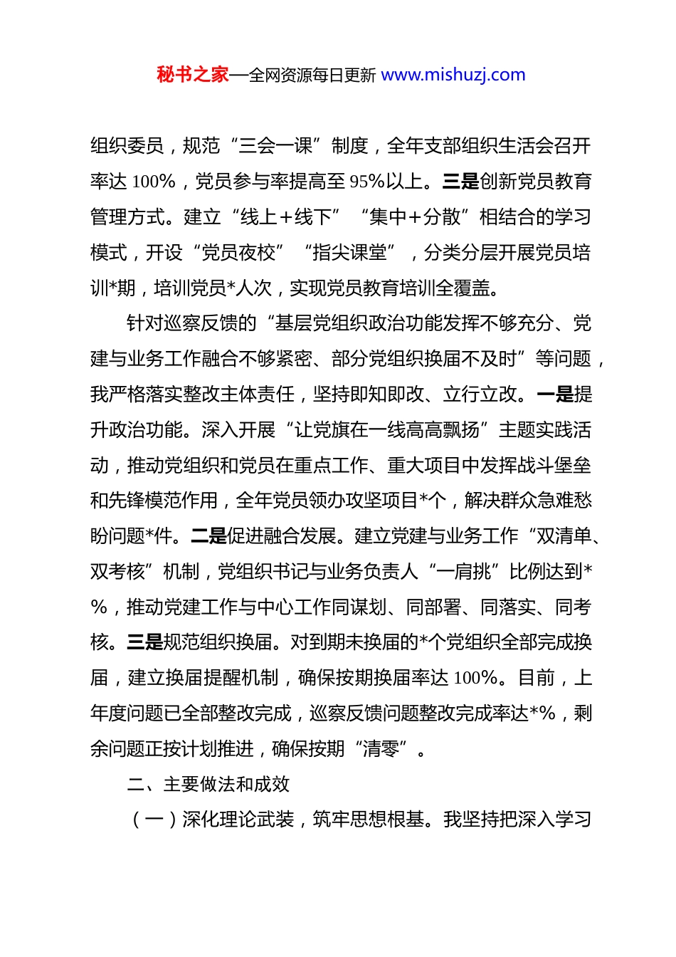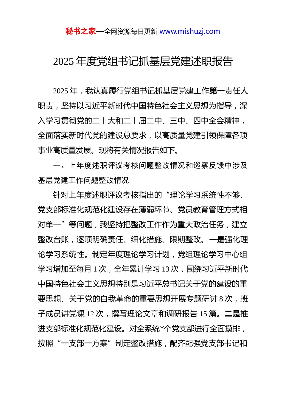 秘书之家—全网资源每日更新 www.mishuzj.com2025 年度党组书记抓基层党建述职报告 2025 年,我认真履行党组书记抓基层党建工作第一责任人职责,坚持以习近平新时代中国特色社会主义思想为指导,深入学习贯彻党的二十大和二十届二中、三中、四中全会精神,全面落实新时代党的建设总要求,以高质量党建引领保障各项事业高质量发展。现将有关情况报告如下。一、上年度述职评议考核问题整改情况和巡察反馈中涉及基层党建工作问题整改情况针对上年度述职评议考核指出的“理论学习系统性不够、党支部标准化规范化建设存在薄弱环节、党员教育管理方式相对单一”等问题,我坚持把整改工作作为重大政治任务,建立整改台账,逐项明确责任、细化措施、限期整改。一是强化理论学习系统性。制定年度理论学习计划,党组理论学习中心组学习增加至每月 1 次,全年累计学习 13 次,围绕习近平新时代中国特色社会主义思想特别是习近平总书记关于党的建设的重要思想、关于党的自我革命的重要思想开展专题研讨 8 次,班子成员讲党课 12 次,撰写理论文章和调研报告 15 篇。二是推进支部标准化规范化建设。对全系统*个党支部进行全面摸排,按照“一支部一方案”制定整改措施,配齐配强党支部书记和秘书之家—全网资源每日更新 www.mishuzj.com组织委员,规范“三会一课”制度,全年支部组织生活会召开率达 100%,党员参与率提高至 95%以上。三是创新党员教育管理方式。建立“线上+线下”“集中+分散”相结合的学习模式,开设“党员夜校”“指尖课堂”,分类分层开展党员培训*期,培训党员*人次,实现党员教育培训全覆盖。针对巡察反馈的“基层党组织政治功能发挥不够充分、党建与业务工作融合不够紧密、部分党组织换届不及时”等问题,我严格落实整改主体责任,坚持即知即改、立行立改。一是提升政治功能。深入开展“让党旗在一线高高飘扬”主题实践活动,推动党组织和党员在重点工作、重大项目中发挥战斗堡垒和先锋模范作用,全年党员领办攻坚项目*个,解决群众急难愁盼问题*件。二是促进融合发展。建立党建与业务工作“双清单、双考核”机制,党组织书记与业务负责人“一肩挑”比例达到*%,推动党建工作与中心工作同谋划、同部署、同落实、同考核。三是规范组织换届。对到期未换届的*个党组织全部完成换届,建立换届提醒机制,确保按期换届率达 100%。目前,上年度问题已全部整改完成,巡察反馈问题整改完成率达*%,剩余问题正按计划推进,确保按期“清零”。二、主要做法和成效(一)深化理论武装,筑牢思想根基。我坚持把深入学习秘书之家—全网资源每日更新 www.mishuzj.com贯彻习近平新时代中国特色社会主义思想作为首要政治任务,持续在学懂弄通做实上下功夫,推动党的创新理论武装走深走实。一是健全理论学习机制。严格落实党组理论学习中心组学习制度,制定年度学习计划和专题学习方案,采取集体学习、专题研讨、个人自学、专家辅导相结合的方式,系统学习党的二十大报告、党章党规党纪,深入学习贯彻党的二十届二中、三中、四中全会精神,重点学习《中共中央关于制定国民经济和社会发展第十五个五年规划的建议》,推动领导班子在学习上走在前、作表率。严格落实“第一议题”制度,及时传达学习习近平总书记最新重要讲话和重要指示批示精神,确保党中央决策部署第一时间传达贯彻、第一时间落地见效。全年党组理论学习中心组学习 13 次,举办专题读书班 3 期,班子成员撰写学习心得体会文章*篇。二是扎实开展学习教育。按照党中央统一部署,认真组织开展深入贯彻中央八项规定精神学习教育。我带头学习《习近平关于加强党的作风建设论述摘编》和中央八项规定及其实施细则精神,组织全系统党员干部通过党组理论学习中心组学习、支部学习会、专题党课等形式,深入学习领会习近平总书记关于加强党的作风建设的重要论述,系统总结党的十八大以来深秘书之家—全网资源每日更新 www.mishuzj.com入贯彻中央八项规定精神取得的显著成效。开展“对标对表查摆问题”专题活动,全面查找在落实中央八项规定精神方面存在的问题,建立问题清单*个,已完成整改*个。三是推进作风建设常...