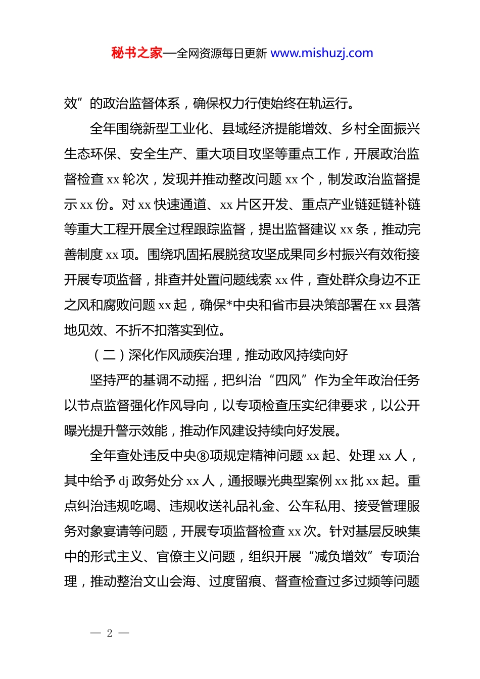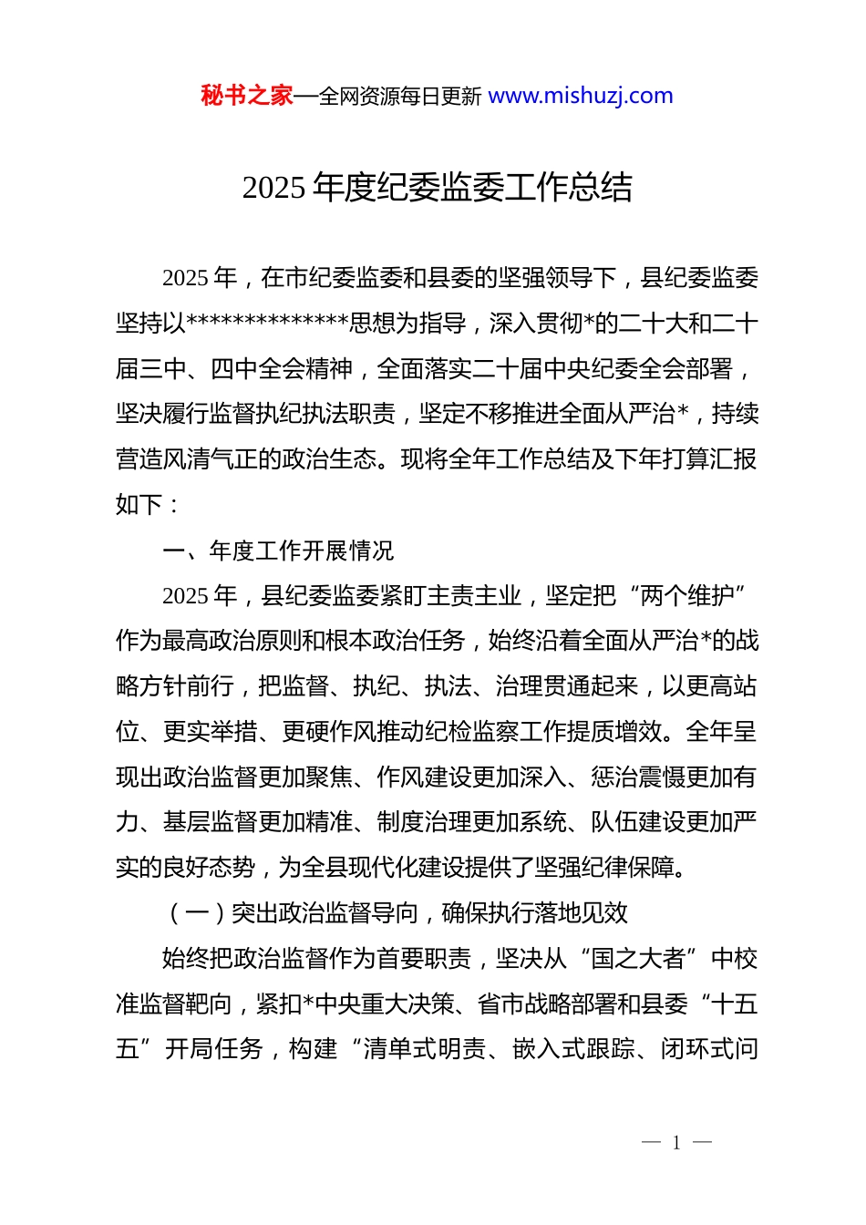 秘书之家—全网资源每日更新 www.mishuzj.com2025 年度纪委监委工作总结2025 年,在市纪委监委和县委的坚强领导下,县纪委监委坚持以**************思想为指导,深入贯彻*的二十大和二十届三中、四中全会精神,全面落实二十届中央纪委全会部署,坚决履行监督执纪执法职责,坚定不移推进全面从严治*,持续营造风清气正的政治生态。现将全年工作总结及下年打算汇报如下:一、年度工作开展情况2025 年,县纪委监委紧盯主责主业,坚定把“两个维护”作为最高政治原则和根本政治任务,始终沿着全面从严治*的战略方针前行,把监督、执纪、执法、治理贯通起来,以更高站位、更实举措、更硬作风推动纪检监察工作提质增效。全年呈现出政治监督更加聚焦、作风建设更加深入、惩治震慑更加有力、基层监督更加精准、制度治理更加系统、队伍建设更加严实的良好态势,为全县现代化建设提供了坚强纪律保障。(一)突出政治监督导向,确保执行落地见效始终把政治监督作为首要职责,坚决从“国之大者”中校准监督靶向,紧扣*中央重大决策、省市战略部署和县委“十五五”开局任务,构建“清单式明责、嵌入式跟踪、闭环式问— 1 —秘书之家—全网资源每日更新 www.mishuzj.com效”的政治监督体系,确保权力行使始终在轨运行。全年围绕新型工业化、县域经济提能增效、乡村全面振兴生态环保、安全生产、重大项目攻坚等重点工作,开展政治监督检查 xx 轮次,发现并推动整改问题 xx 个,制发政治监督提示 xx 份。对 xx 快速通道、xx 片区开发、重点产业链延链补链等重大工程开展全过程跟踪监督,提出监督建议 xx 条,推动完善制度 xx 项。围绕巩固拓展脱贫攻坚成果同乡村振兴有效衔接开展专项监督,排查并处置问题线索 xx 件,查处群众身边不正之风和腐败问题 xx 起,确保*中央和省市县决策部署在 xx 县落地见效、不折不扣落实到位。(二)深化作风顽疾治理,推动政风持续向好坚持严的基调不动摇,把纠治“四风”作为全年政治任务以节点监督强化作风导向,以专项检查压实纪律要求,以公开曝光提升警示效能,推动作风建设持续向好发展。全年查处违反中央⑧项规定精神问题 xx 起、处理 xx 人,其中给予 dj 政务处分 xx 人,通报曝光典型案例 xx 批 xx 起。重点纠治违规吃喝、违规收送礼品礼金、公车私用、接受管理服务对象宴请等问题,开展专项监督检查 xx 次。针对基层反映集中的形式主义、官僚主义问题,组织开展“减负增效”专项治理,推动整治文山会海、过度留痕、督查检查过多过频等问题— 2 —秘书之家—全网资源每日更新 www.mishuzj.comxx 项。对窗口单位、执法部门和服务大厅等开展明察暗访 xx 次,发现并纠治推诿敷衍、敷衍塞责、漠视群众利益、不作为慢作为等问题 xx 件,有力促进担当作为、勤政务实的良好作风加速形成。(三)保持惩腐高压态势,强化震慑持续深化坚持惩治腐败方向不变、力度不减,始终保持无禁区、全覆盖、零容忍的惩治格局,加强对权力集中、资金密集、资源富集领域的精准打击,持续释放越往后执纪越严的强烈信号。全年受理信访举报 xx 件次,处置问题线索 xx 件,立案 xx件,处分 xx 人,其中给予 dj 政务处分 xx 人,移送司法机关 xx人。严肃查处工程建设、土地审批、国企管理、金融运行、专项资金使用等重点领域腐败问题 xx 件。围绕“三资”监管、粮食购销、惠民补贴、项目招投标等风险环节开展“以案促改、以案促治”专项行动,制发纪检监察建议 xx 份,推动完善制度xx 项、堵塞风险漏洞 xx 处。组织开展全县性警示教育大会 xx场,拍摄警示教育片 xx 部,受教育干部达 xx 人次,实现查办一案、教育一片、治理一域的综合效应。(四)聚焦群众急难愁盼,推动基层监督精准有效坚持人民至上理念,把整治群众身边不正之风和腐败问题作为全年监督重点,聚焦民生投入大、群众反映强烈的问题集— 3 —秘书之家—全网资源每日更新 www.mishuzj.com中领域,推动监督力量下沉、监督触角前移,切实增强群众获得感、幸福感、安全感。全年查处教育医疗、养老社保、农村集体资产、涉农补贴食品药品安全等领域...