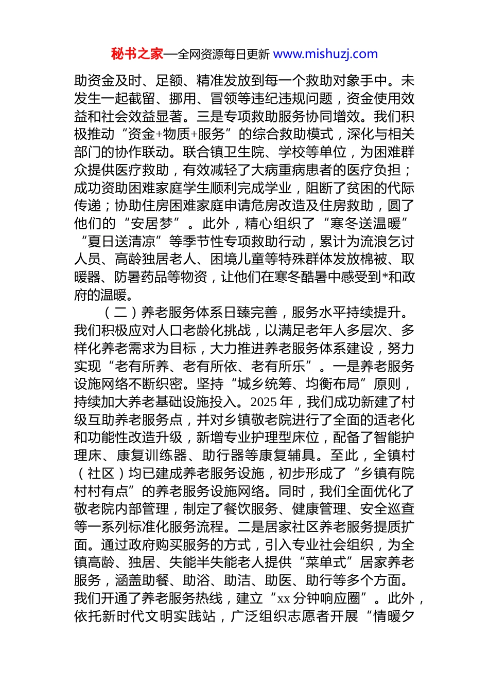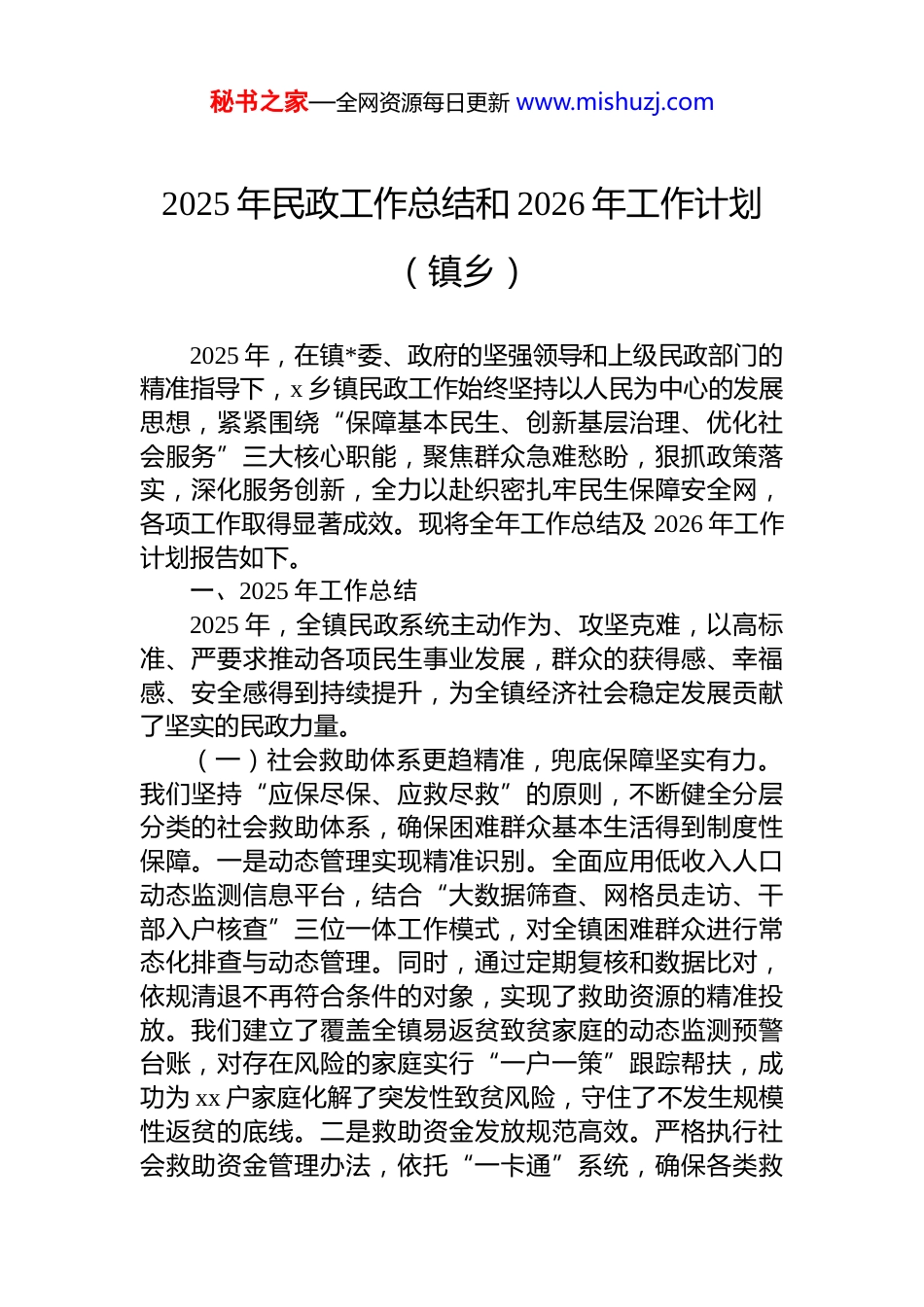 秘书之家—全网资源每日更新 www.mishuzj.com2025 年民政工作总结和 2026 年工作计划(镇乡)2025 年,在镇*委、政府的坚强领导和上级民政部门的精准指导下,x 乡镇民政工作始终坚持以人民为中心的发展思想,紧紧围绕“保障基本民生、创新基层治理、优化社会服务”三大核心职能,聚焦群众急难愁盼,狠抓政策落实,深化服务创新,全力以赴织密扎牢民生保障安全网,各项工作取得显著成效。现将全年工作总结及 2026 年工作计划报告如下。一、2025 年工作总结2025 年,全镇民政系统主动作为、攻坚克难,以高标准、严要求推动各项民生事业发展,群众的获得感、幸福感、安全感得到持续提升,为全镇经济社会稳定发展贡献了坚实的民政力量。(一)社会救助体系更趋精准,兜底保障坚实有力。我们坚持“应保尽保、应救尽救”的原则,不断健全分层分类的社会救助体系,确保困难群众基本生活得到制度性保障。一是动态管理实现精准识别。全面应用低收入人口动态监测信息平台,结合“大数据筛查、网格员走访、干部入户核查”三位一体工作模式,对全镇困难群众进行常态化排查与动态管理。同时,通过定期复核和数据比对,依规清退不再符合条件的对象,实现了救助资源的精准投放。我们建立了覆盖全镇易返贫致贫家庭的动态监测预警台账,对存在风险的家庭实行“一户一策”跟踪帮扶,成功为 xx 户家庭化解了突发性致贫风险,守住了不发生规模性返贫的底线。二是救助资金发放规范高效。严格执行社会救助资金管理办法,依托“一卡通”系统,确保各类救秘书之家—全网资源每日更新 www.mishuzj.com助资金及时、足额、精准发放到每一个救助对象手中。未发生一起截留、挪用、冒领等违纪违规问题,资金使用效益和社会效益显著。三是专项救助服务协同增效。我们积极推动“资金+物质+服务”的综合救助模式,深化与相关部门的协作联动。联合镇卫生院、学校等单位,为困难群众提供医疗救助,有效减轻了大病重病患者的医疗负担;成功资助困难家庭学生顺利完成学业,阻断了贫困的代际传递;协助住房困难家庭申请危房改造及住房救助,圆了他们的“安居梦”。此外,精心组织了“寒冬送温暖”“夏日送清凉”等季节性专项救助行动,累计为流浪乞讨人员、高龄独居老人、困境儿童等特殊群体发放棉被、取暖器、防暑药品等物资,让他们在寒冬酷暑中感受到*和政府的温暖。(二)养老服务体系日臻完善,服务水平持续提升。我们积极应对人口老龄化挑战,以满足老年人多层次、多样化养老需求为目标,大力推进养老服务体系建设,努力实现“老有所养、老有所依、老有所乐”。一是养老服务设施网络不断织密。坚持“城乡统筹、均衡布局”原则,持续加大养老基础设施投入。2025 年,我们成功新建了村级互助养老服务点,并对乡镇敬老院进行了全面的适老化和功能性改造升级,新增专业护理型床位,配备了智能护理床、康复训练器、助行器等康复辅具。至此,全镇村(社区)均已建成养老服务设施,初步形成了“乡镇有院村村有点”的养老服务设施网络。同时,我们全面优化了敬老院内部管理,制定了餐饮服务、健康管理、安全巡查等一系列标准化服务流程。二是居家社区养老服务提质扩面。通过政府购买服务的方式,引入专业社会组织,为全镇高龄、独居、失能半失能老人提供“菜单式”居家养老服务,涵盖助餐、助浴、助洁、助医、助行等多个方面。我们开通了养老服务热线,建立“xx 分钟响应圈”。此外,依托新时代文明实践站,广泛组织志愿者开展“情暖夕秘书之家—全网资源每日更新 www.mishuzj.com阳”系列活动,为老人们提供读报、义诊、文艺表演、心理慰藉等服务,极大地丰富了他们的精神文化生活。三是各项养老惠老政策全面落实。我们确保各项养老补贴政策不折不扣地落实到位。全年为全镇 xx 周岁以上老人发放高龄津贴;为符合条件的经济困难失能老人发放养老服务补贴。为破解养老服务人才短缺瓶颈,我们联合卫健、人社等部门,组织开展了养老护理员专题培训班,有效提升了全镇养老服务队伍的专业化水平和综合素养。(三)基层社会治理创新发展,特殊群体关爱精准到位。我们坚持以 dj 引领基层治理,不断激发社会活力...