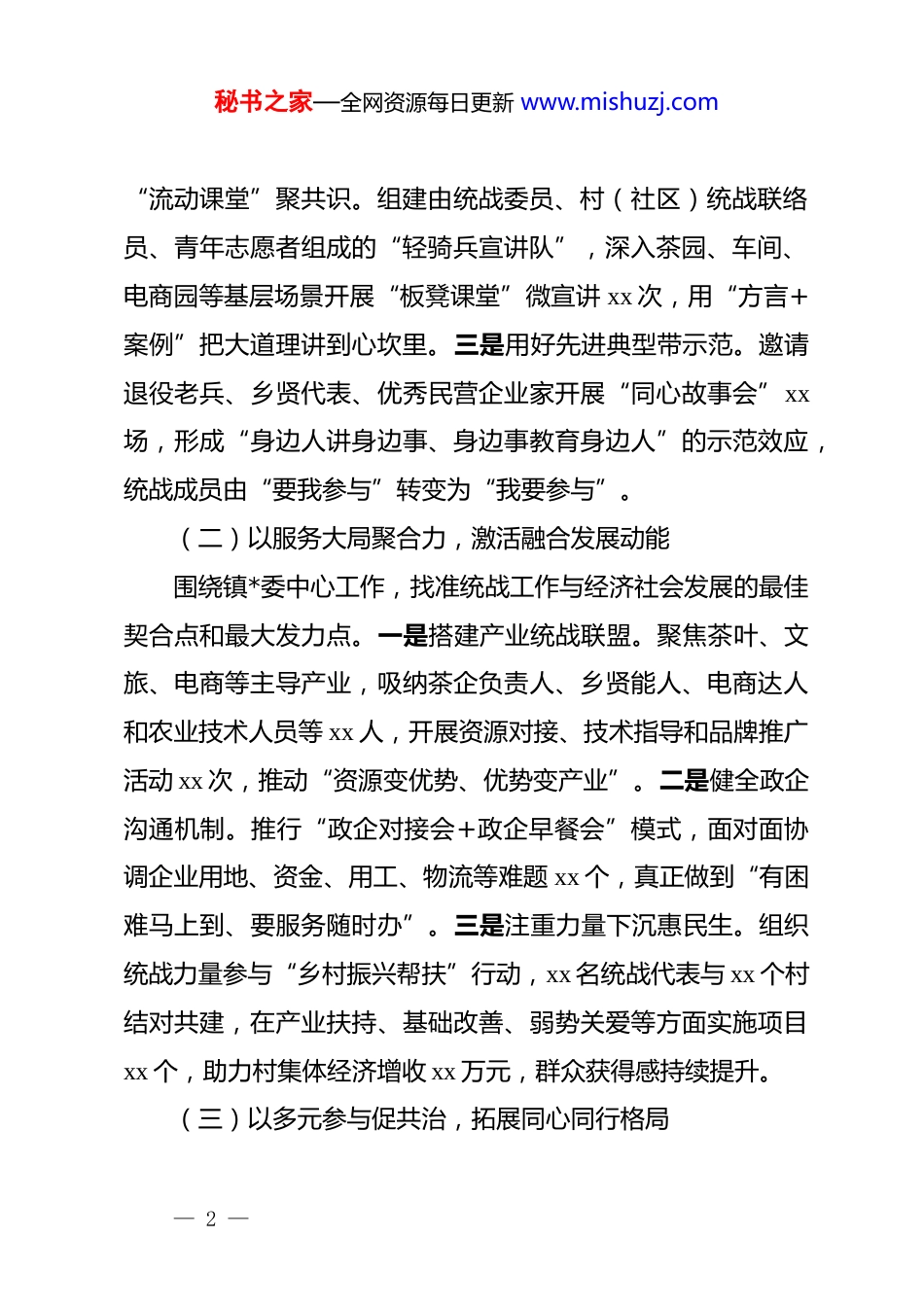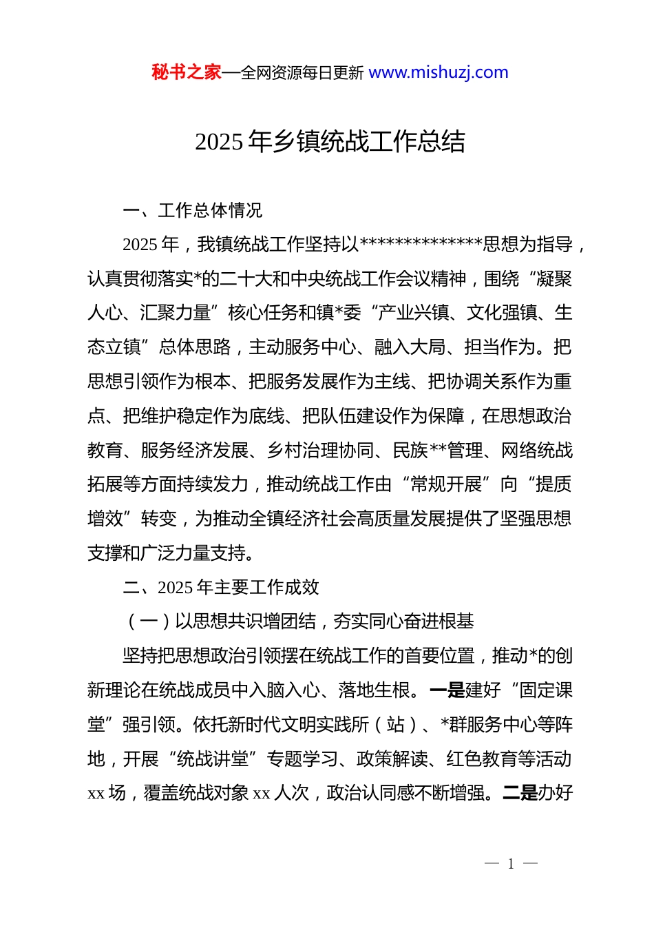 秘书之家—全网资源每日更新 www.mishuzj.com2025 年乡镇统战工作总结一、工作总体情况2025 年,我镇统战工作坚持以**************思想为指导,认真贯彻落实*的二十大和中央统战工作会议精神,围绕“凝聚人心、汇聚力量”核心任务和镇*委“产业兴镇、文化强镇、生态立镇”总体思路,主动服务中心、融入大局、担当作为。把思想引领作为根本、把服务发展作为主线、把协调关系作为重点、把维护稳定作为底线、把队伍建设作为保障,在思想政治教育、服务经济发展、乡村治理协同、民族**管理、网络统战拓展等方面持续发力,推动统战工作由“常规开展”向“提质增效”转变,为推动全镇经济社会高质量发展提供了坚强思想支撑和广泛力量支持。二、2025 年主要工作成效(一)以思想共识增团结,夯实同心奋进根基坚持把思想政治引领摆在统战工作的首要位置,推动*的创新理论在统战成员中入脑入心、落地生根。一是建好“固定课堂”强引领。依托新时代文明实践所(站)、*群服务中心等阵地,开展“统战讲堂”专题学习、政策解读、红色教育等活动xx 场,覆盖统战对象 xx 人次,政治认同感不断增强。二是办好— 1 —秘书之家—全网资源每日更新 www.mishuzj.com“流动课堂”聚共识。组建由统战委员、村(社区)统战联络员、青年志愿者组成的“轻骑兵宣讲队”,深入茶园、车间、电商园等基层场景开展“板凳课堂”微宣讲 xx 次,用“方言+案例”把大道理讲到心坎里。三是用好先进典型带示范。邀请退役老兵、乡贤代表、优秀民营企业家开展“同心故事会”xx场,形成“身边人讲身边事、身边事教育身边人”的示范效应,统战成员由“要我参与”转变为“我要参与”。(二)以服务大局聚合力,激活融合发展动能围绕镇*委中心工作,找准统战工作与经济社会发展的最佳契合点和最大发力点。一是搭建产业统战联盟。聚焦茶叶、文旅、电商等主导产业,吸纳茶企负责人、乡贤能人、电商达人和农业技术人员等 xx 人,开展资源对接、技术指导和品牌推广活动 xx 次,推动“资源变优势、优势变产业”。二是健全政企沟通机制。推行“政企对接会+政企早餐会”模式,面对面协调企业用地、资金、用工、物流等难题 xx 个,真正做到“有困难马上到、要服务随时办”。三是注重力量下沉惠民生。组织统战力量参与“乡村振兴帮扶”行动,xx 名统战代表与 xx 个村结对共建,在产业扶持、基础改善、弱势关爱等方面实施项目xx 个,助力村集体经济增收 xx 万元,群众获得感持续提升。(三)以多元参与促共治,拓展同心同行格局— 2 —秘书之家—全网资源每日更新 www.mishuzj.com坚持把统战优势转化为基层治理效能。一是建好“乡贤议事厅”。吸纳企业家、教师、医生、退役军人等乡贤代表 xx 人,参与农村人居环境整治、集体经济发展、民生诉求协调等事项xx 件,推动形成“有事一起议、难事一起扛”的治理格局。二是引导新阶层人士建真言。组织新的社会阶层人士开展调研座谈 xx 次,提出合理化建议 xx 条,其中 xx 条被采纳并转化为政策举措。三是推动统战力量参与矛盾化解。统战成员参与纠纷调解、邻里调和、情绪疏导 xx 起,成功化解矛盾隐患 xx 件,基层治理更加温暖有力。(四)以和谐稳定筑底线,织牢民族**防线严格落实民族**工作责任制,确保领域平稳有序。一是完善管理网络。构建“镇—村(社区)—**场所”三级网格,配备**协管员 xx 名,常态化开展走访检查 xx 次,发现问题整改率达 xx%。二是加强政策教育。开展“国法与教规”专题培训、政策宣讲和谈心谈话 xx 场次,增强**人士爱国守法意识。三是做实服务关怀。为少数民族群众提供就业指导、子女入学、医疗帮扶等服务 xx 次,促进“你中有我、我中有你”的良好氛围,全年未发生民族**领域风险事件。(五)以网络引导扩声量,提升统战传播效应积极占领网上统战工作新阵地,提升新媒体统战引导力。— 3 —秘书之家—全网资源每日更新 www.mishuzj.com一是打造新媒体传播矩阵。运营“同心 xx”公众号、短视频账号,发布统战信息、典型事迹、政策解读 xx 篇,阅读量累计xx+。二是组建网络统战志愿队伍。吸纳自媒体达人...
