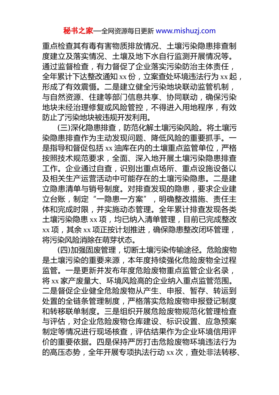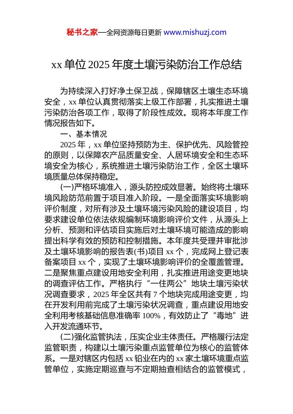 秘书之家—全网资源每日更新 www.mishuzj.comxx 单位 2025 年度土壤污染防治工作总结为持续深入打好净土保卫战,保障辖区土壤生态环境安全,xx 单位认真贯彻落实上级工作部署,扎实推进土壤污染防治各项工作,取得了阶段性成效。现将本年度工作情况报告如下。一、基本情况2025 年,xx 单位坚持预防为主、保护优先、风险管控的原则,以保障农产品质量安全、人居环境安全和生态环境安全为核心,系统推进土壤污染防治工作,全区土壤环境质量总体保持稳定。(一)严格环境准入,源头防控成效显著。始终将土壤环境风险防范前置于项目准入阶段。一是全面落实环境影响评价制度,对所有涉及土壤环境污染风险的建设项目,均要求建设单位依法依规编制环境影响评价文件,从源头上分析、预测和评估项目实施后对土壤环境可能造成的影响提出科学有效的预防和控制措施。本年度共受理并审批涉及土壤环境影响的报告表(书)项目 xx 个,完成网上登记表备案项目 xx 个,实现了土壤环境影响评价的全覆盖管理。二是聚焦重点建设用地安全利用,扎实推进用途变更地块的调查评估工作。严格执行“一住两公”地块土壤污染状况调查要求,2025 年全区共有 7 个地块完成用途变更,均在开发利用前完成了土壤污染状况调查,重点建设用地安全利用考核基础信息准确率 100%,有效防止了“毒地”进入开发流通环节。(二)强化监管执法,压实企业主体责任。严格履行法定监管职责,构建以土壤污染重点监管单位为核心的监管体系。一是对辖区内包括 xx 铅业在内的 xx 家土壤环境重点监管单位,实施定期巡查与不定期抽查相结合的监管模式,秘书之家—全网资源每日更新 www.mishuzj.com重点检查其有毒有害物质排放情况、土壤污染隐患排查制度建立及落实情况、土壤及地下水自行监测开展情况等。通过监督检查,有力督促了企业落实污染防治主体责任,全年累计下达整改通知 xx 份,立案查处环境违法行为 xx 起,形成了有效震慑。二是建立健全污染地块联动监管机制,与自然资源、住建等部门信息共享、协同联动,确保污染地块未经治理修复或风险管控,不得进入用地程序,有效防止了污染地块被违规开发利用。(三)深化隐患排查,防范化解土壤污染风险。将土壤污染隐患排查作为主动发现问题、降低风险的重要抓手。一是指导和督促包括 xx 油库在内的土壤重点监管单位,严格按照技术规范要求,全面、深入地开展土壤污染隐患排查工作。企业通过自查,识别出重点场所、重点设施设备以及相关生产运营活动中可能存在的土壤污染隐患。二是建立隐患清单与销号制度。对排查发现的隐患,要求企业建立台账,制定“一隐患一方案”,明确整改措施、责任主体和完成时限,并实施动态管理。全年累计排查发现各类土壤污染隐患 xx 项,均已纳入清单管理,目前已完成整改xx 项,其余 xx 项正按计划推进,确保隐患整改闭环管理,将污染风险消除在萌芽状态。(四)加强固废管理,切断土壤污染传输途径。危险废物是土壤污染的重要来源,本年度持续强化危险废物全过程监管。一是更新并发布年度危险废物重点监管企业名录,将 xx 家产废量大、环境风险高的企业纳入重点监管范围。二是督促企业健全危险废物从产生、申报、暂存、转运到处置的全链条管理制度,严格落实危险废物申报登记制度和转移联单制度。三是组织开展危险废物规范化管理检查与评估,对企业危险废物仓库建设、标识设置、应急预案制定等情况进行现场核查,评估结果作为企业环境信用评价的重要依据。四是保持严厉打击危险废物环境违法行为的高压态势,全年开展专项执法行动 xx 次,查处非法转移、秘书之家—全网资源每日更新 www.mishuzj.com倾倒、处置危险废物案件 xx 起,有效切断了通过危险废物非法处置导致土壤污染的途径。(五)夯实监测基础,科学评估土壤环境质量。为精准掌握全区土壤环境质量状况,开展了系统性的土壤环境监测工作。2025 年共开展土壤环境抽样监测 1200 余次,累计检测项目超过 3000 项,检测指标涵盖重金属、有机物及 ph 值、阳离子交换量等常规理化性质。检测结果显示,全区土壤重金属平均含量整体处于安全管控水平,重点监管企业周...